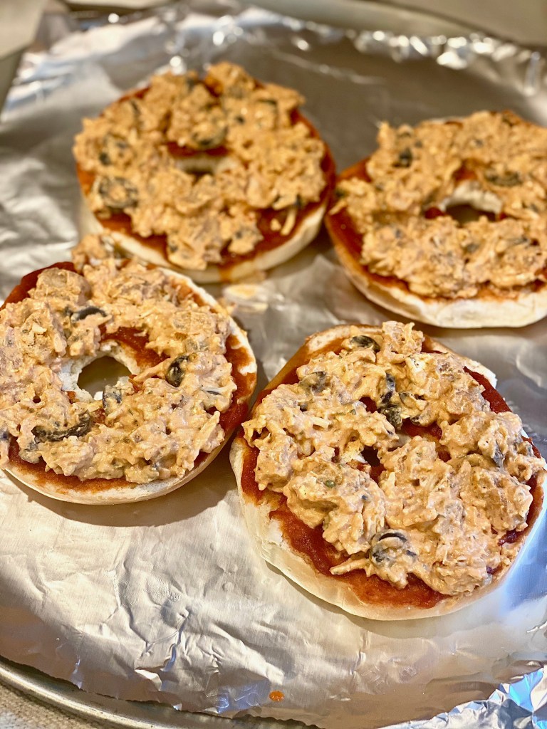 - Pop these in the oven at 375 for 20-25 minutes until the bagels are crusty and the cheese is bubbly, and brown.