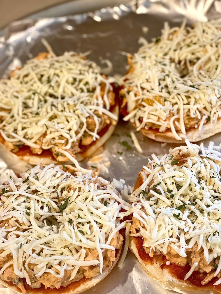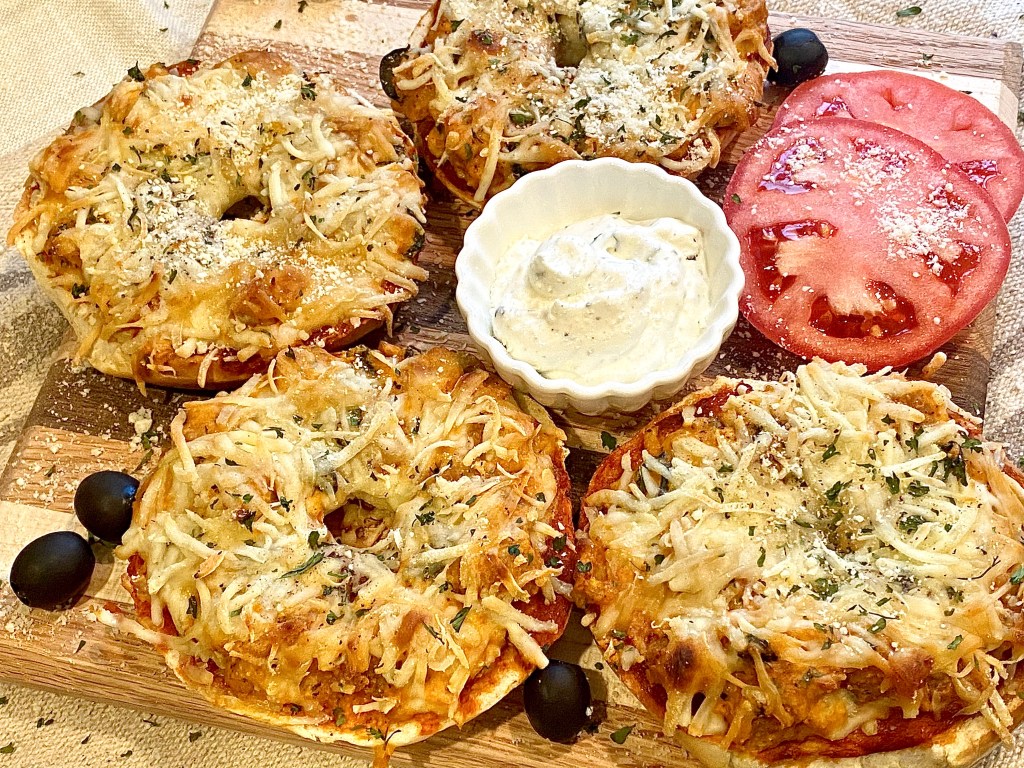 If you’re a 90’s baby like me or you remember feeding after school snacks to your kids..the name “pizza bagel” will totally ring a bell! My mouth waters thinking of all the goodies that used to be incredibly popular when I was younger and sometimes you just want to bring those memories back to you, so that’s exactly what I did with these cheesy circles right here. Instead of just doing plain cheese like we were so used to when enjoying the traditional ones, I decided to add an extremely tasty twist to them! These pizza bagels are awesome because they’re huge, super creamy, and deliciously cheesy!! Not only will the kids love these, but they are also perfect to make in bulk for some sort of gathering to serve as appetizers, or even just to indulge in while you’re watching the Marvel movies on a fun Friday night!