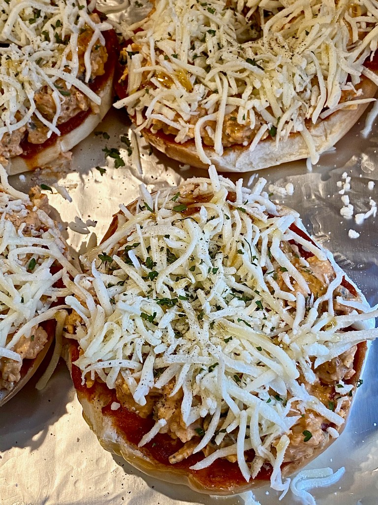 After the sauce has been evenly spread all over each open faced bagel, top all of them with two spoonfuls of the creamy chicken parmesan filling. Then finish every single pizza bagel off with shredded mozzarella cheese, parsley, and Italian seasoning.