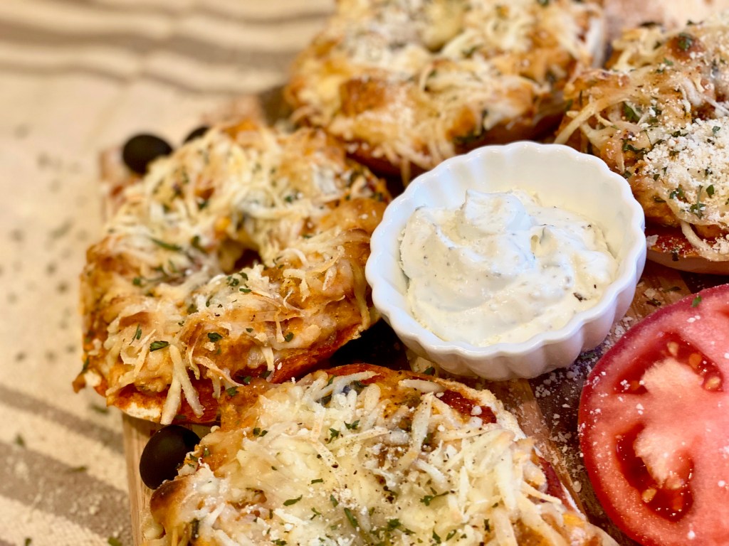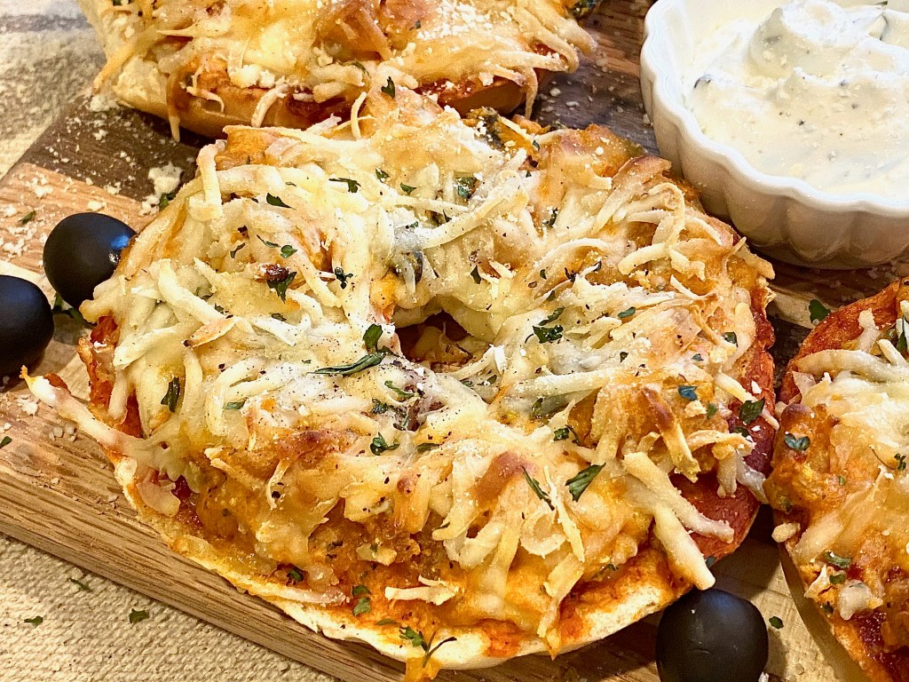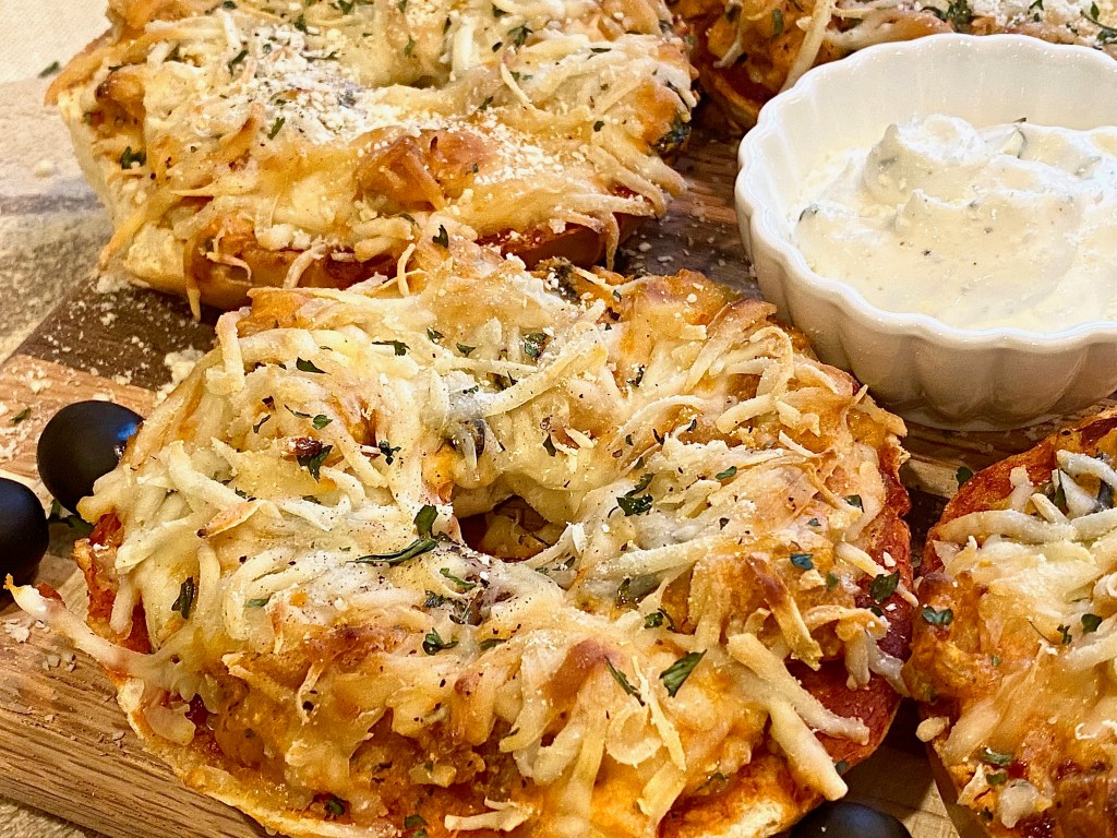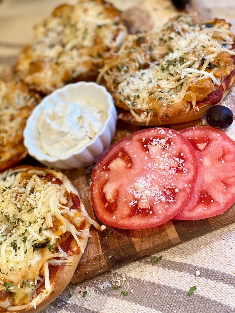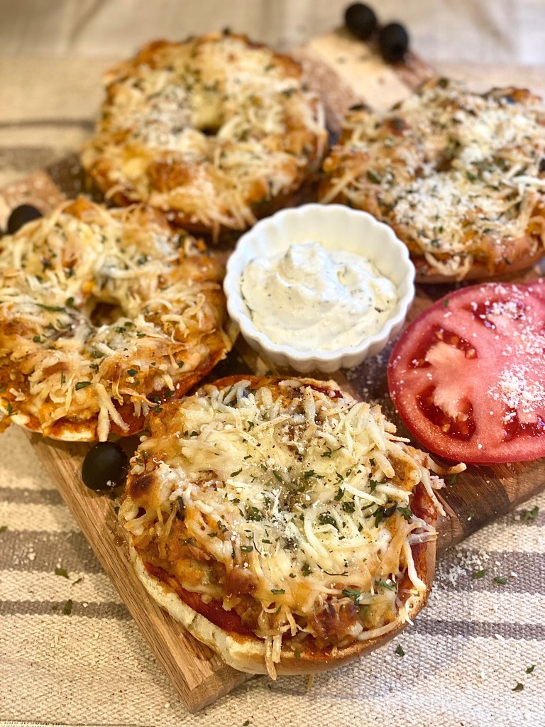 The pizza bagels will come out looking incredibly crusty, cheesy, and saucy! I served these with French onion dip and it really couldn’t have been a more compatible match!