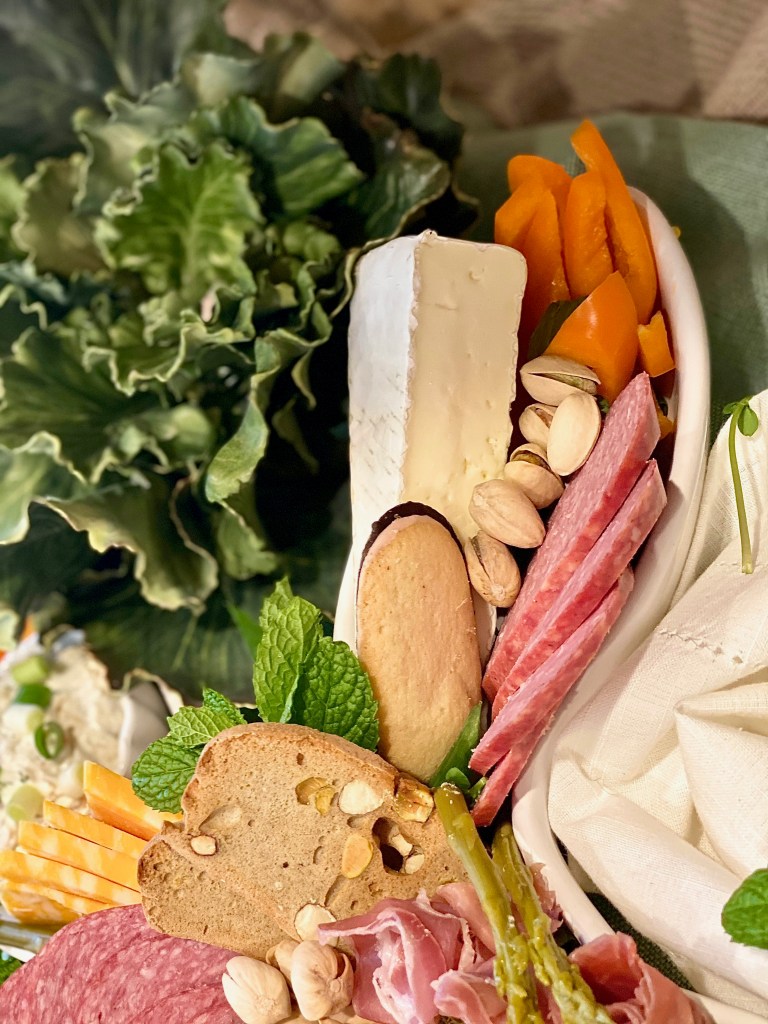 - Prior to beginning the platter with all of it’s delectable food.. I find it’s easiest to lay out a plan for yourself. This is pretty much “board building 101”. I arrange the board with my greenery of choice. Since it is spring and this is an Easter themed board, I wanted this charcuterie board to resemble just that. ThereforeI sprinkled watercress all along the bottom of the plate to give whatever I lay on top some height and dimension. It’s also great for adding that pop of color in as well. When you start putting food on your platter, my biggest tip for you whether you are a beginner or not, is to start with the cheese. I cannot stress this enough! The cheese is always going to be a focal point on these boards, so it is perfect for your building plan if you know where you want the cheeses to sit before everything else.