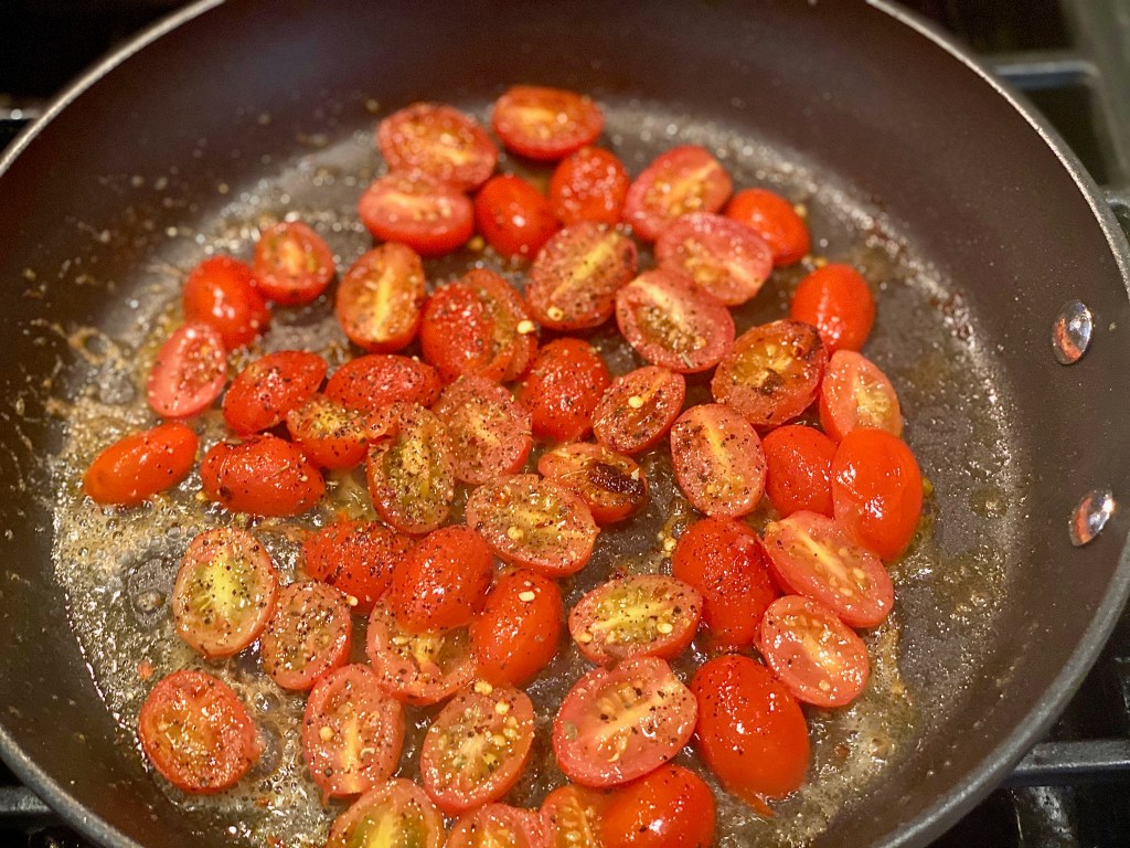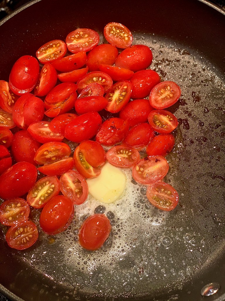 In a large sauté pan over medium-hight heat get those grape tomatoes charred in two tablespoons of olive oil and a tablespoon of butter, so that they get a chance to get some gorgeous color on them. As the temperature of the tomatoes increase that will allow their juices to release, beginning to create a sauce.