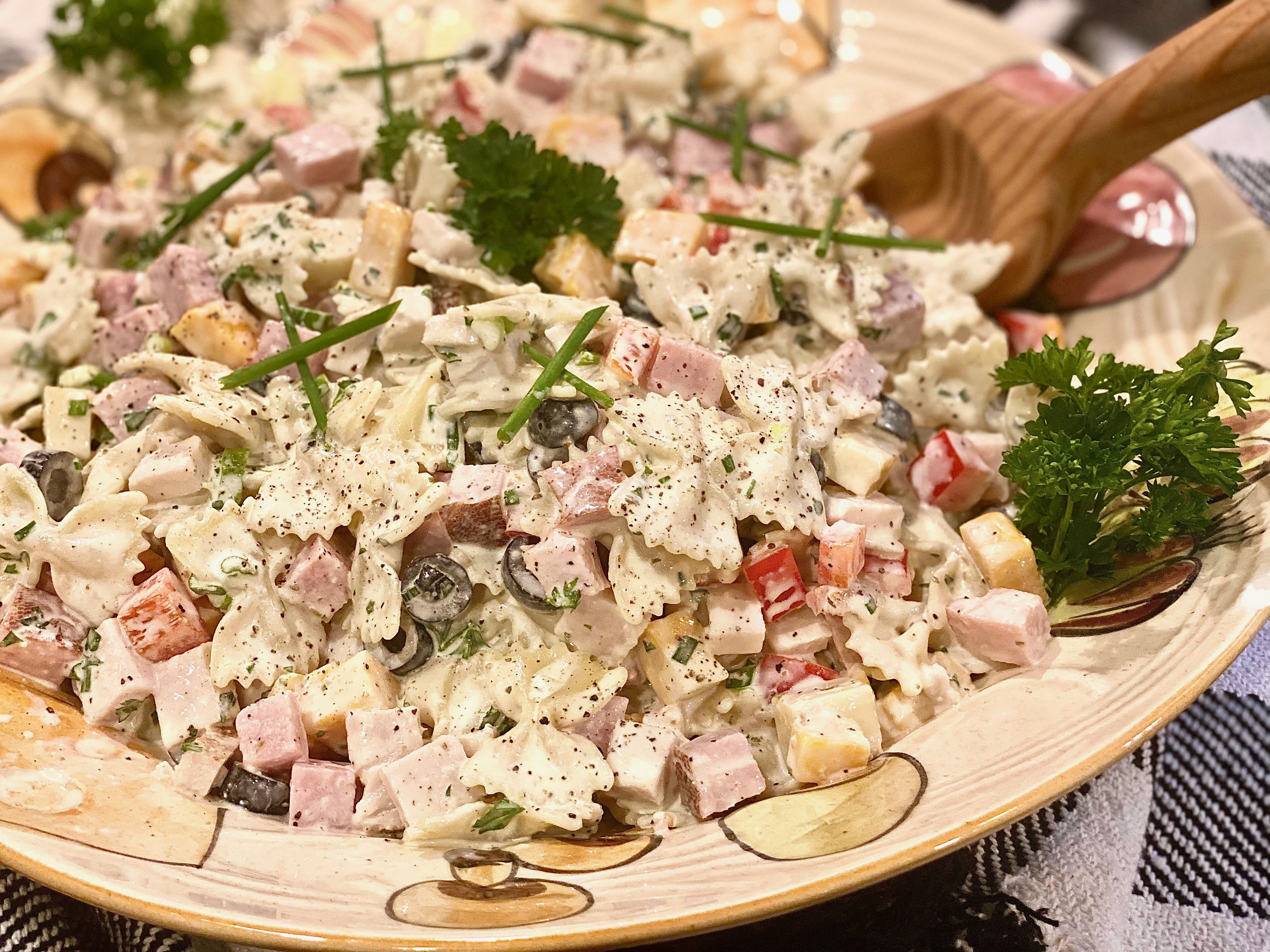 This chef salad pasta salad has everything in it that a chef salad would normally have, but instead of the lettuce; I just tossed in beautiful bow tie noodles!