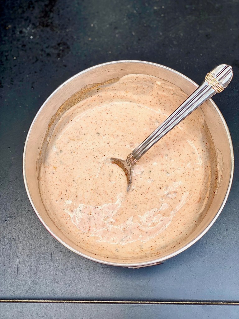 Start with mixing together this creamy buffalo ranch sauce that we’re going to spread all over each cauliflower steak while it grills.