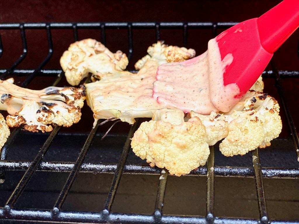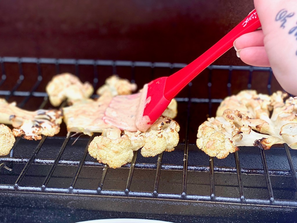 While the cauliflower cooks on each side, brush on the buffalo ranch sauce we made earlier.