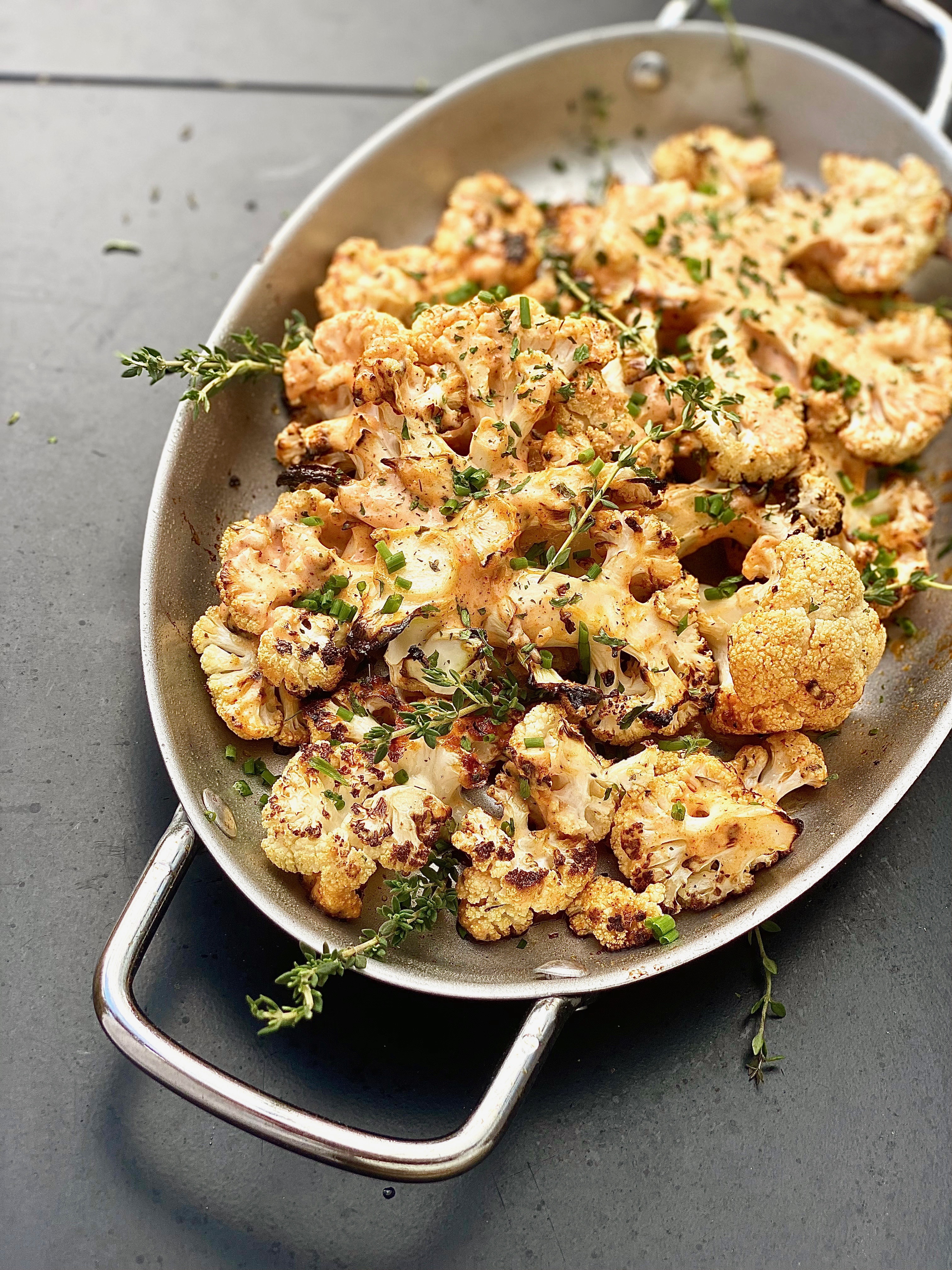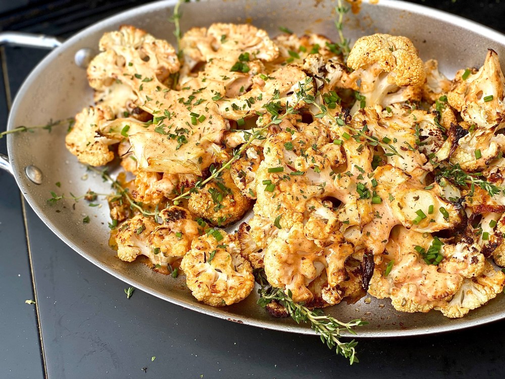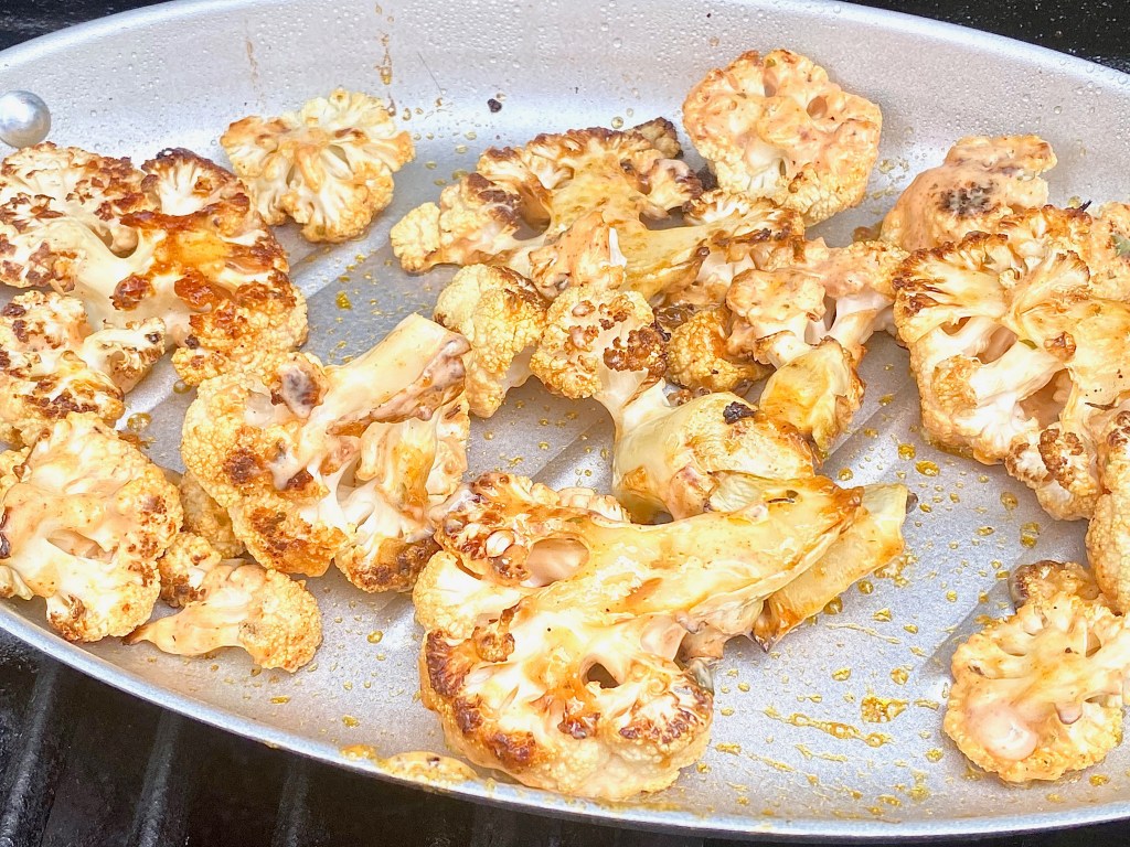 - When you gently remove the cauliflower from the grill with tongs, place all of it inside of the grill pan. It gives it an authentic presentation while keeping the vegetable extremely warm a lot longer than transferring it to a serving platter. This is a dish that would still taste delectable cooled down, but i do prefer it to be pretty hot!