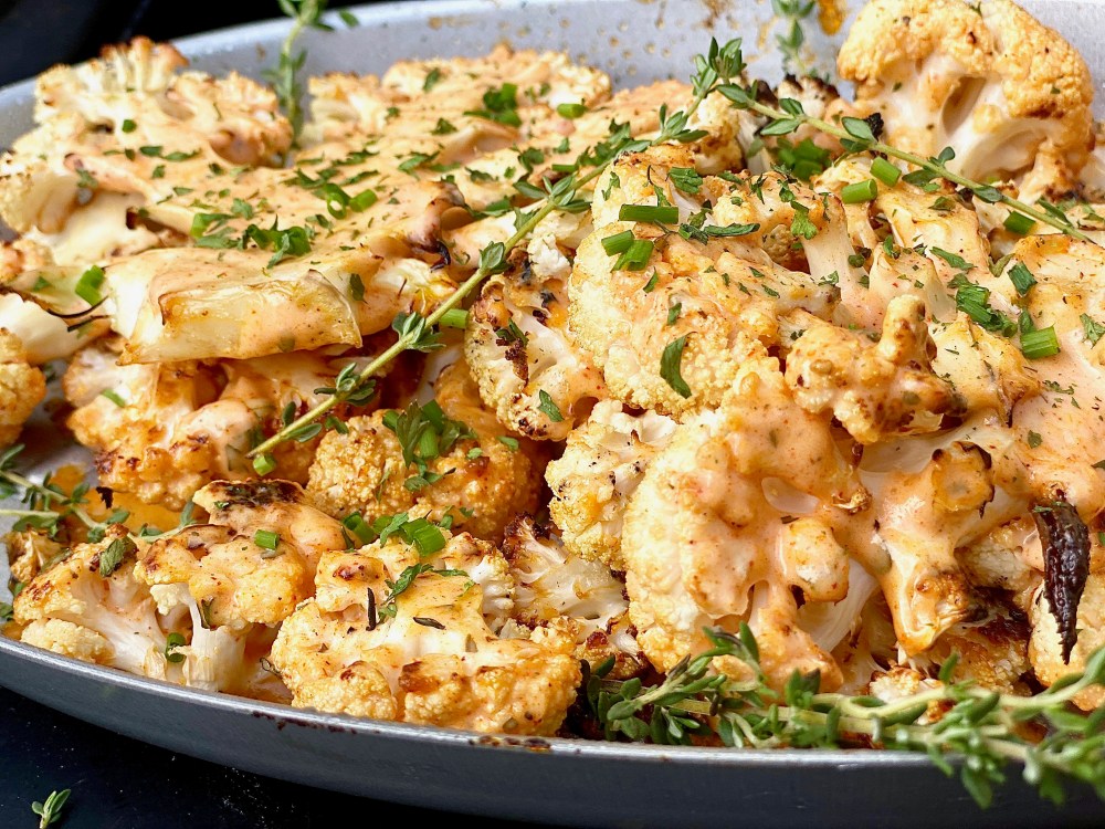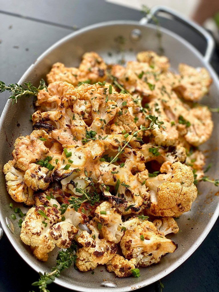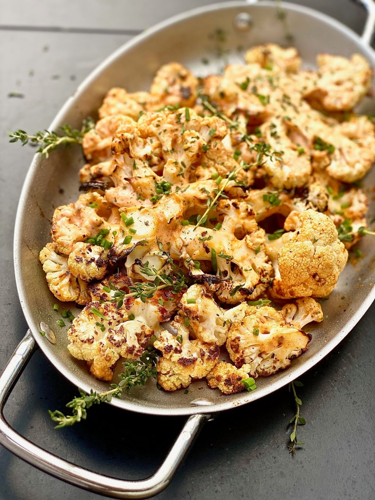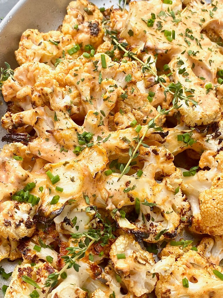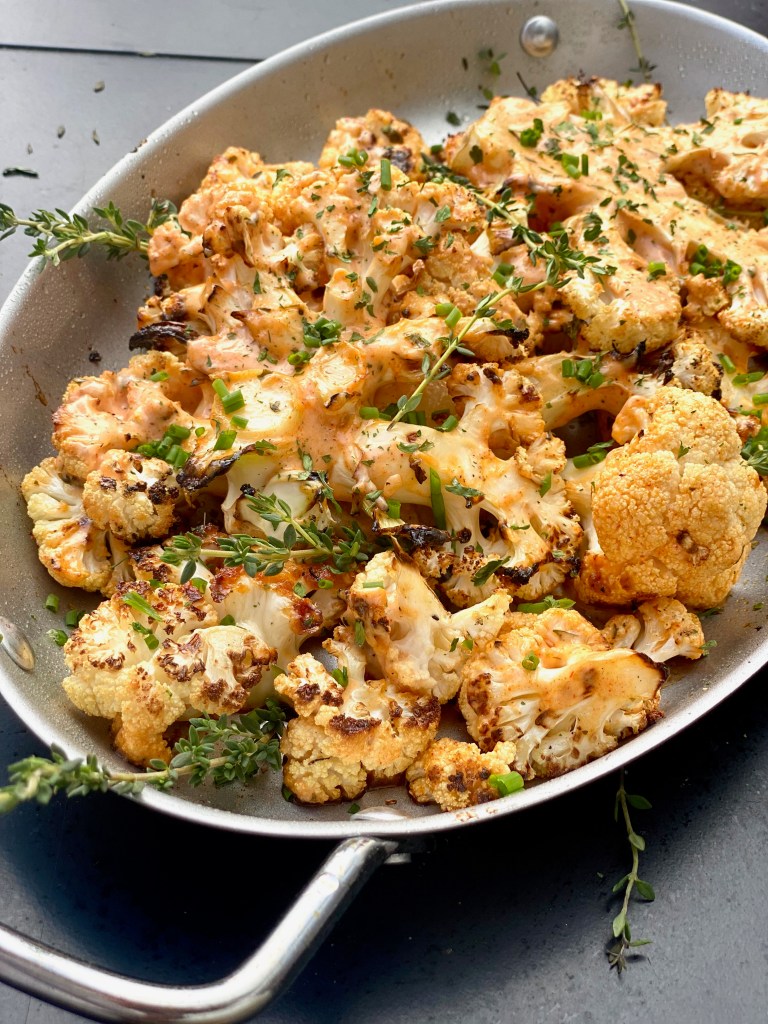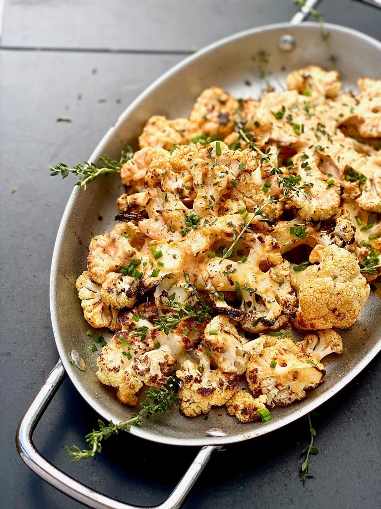 Garnish with chopped fresh chives and thyme! I love both of those herbs together so much and their aroma will make this dish even more exquisite. You Diamonds can serve this grilled herbed buffalo ranch cauliflower with absolutely anything, even a simple hot dog, or some juicy bacon cheeseburgers. It’s a really wonderful contrast to serve a fresh, grilled vegetable that has a tang to it with something more fattening! It balances out the whole eating experience!