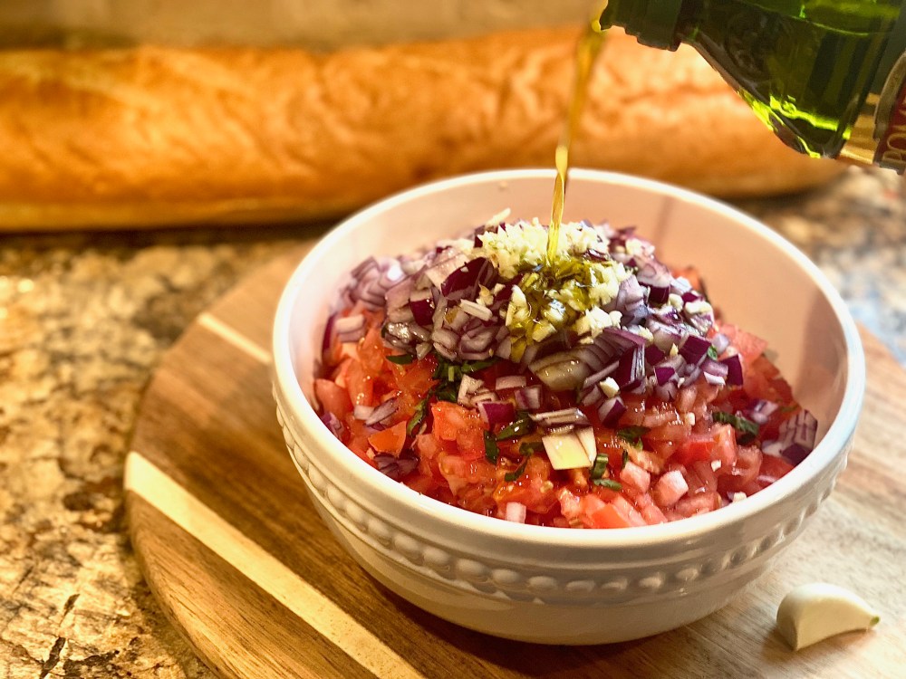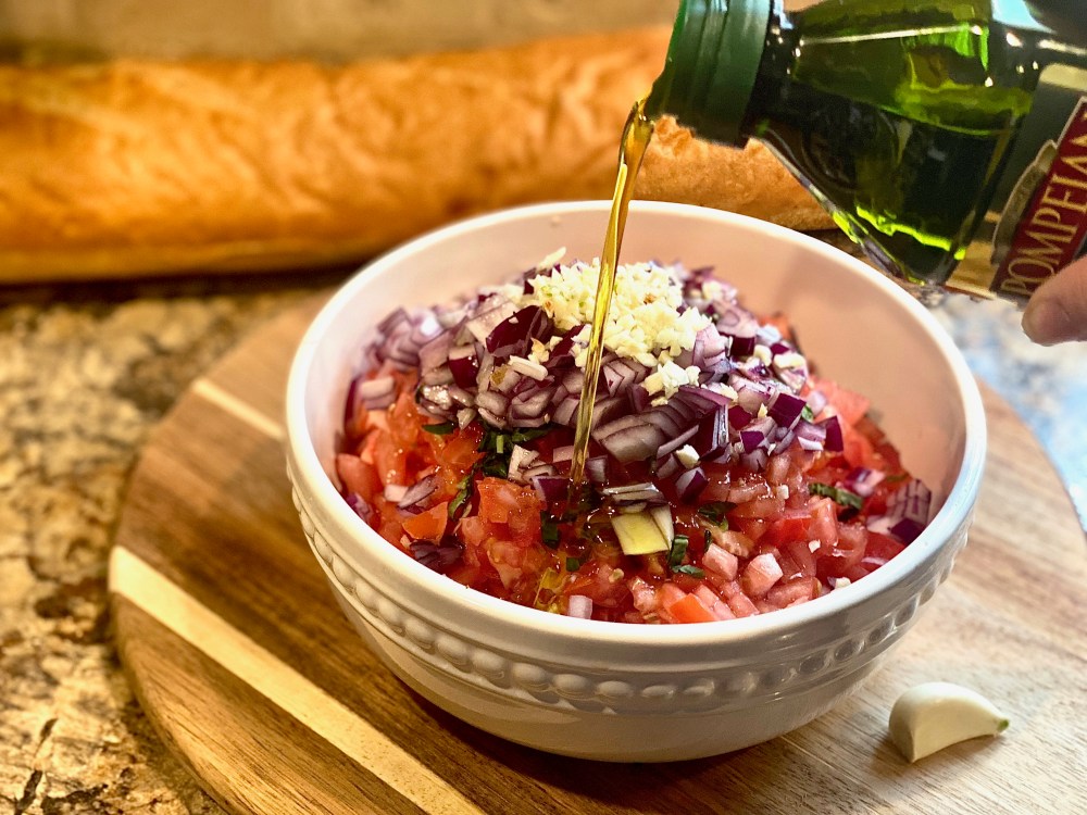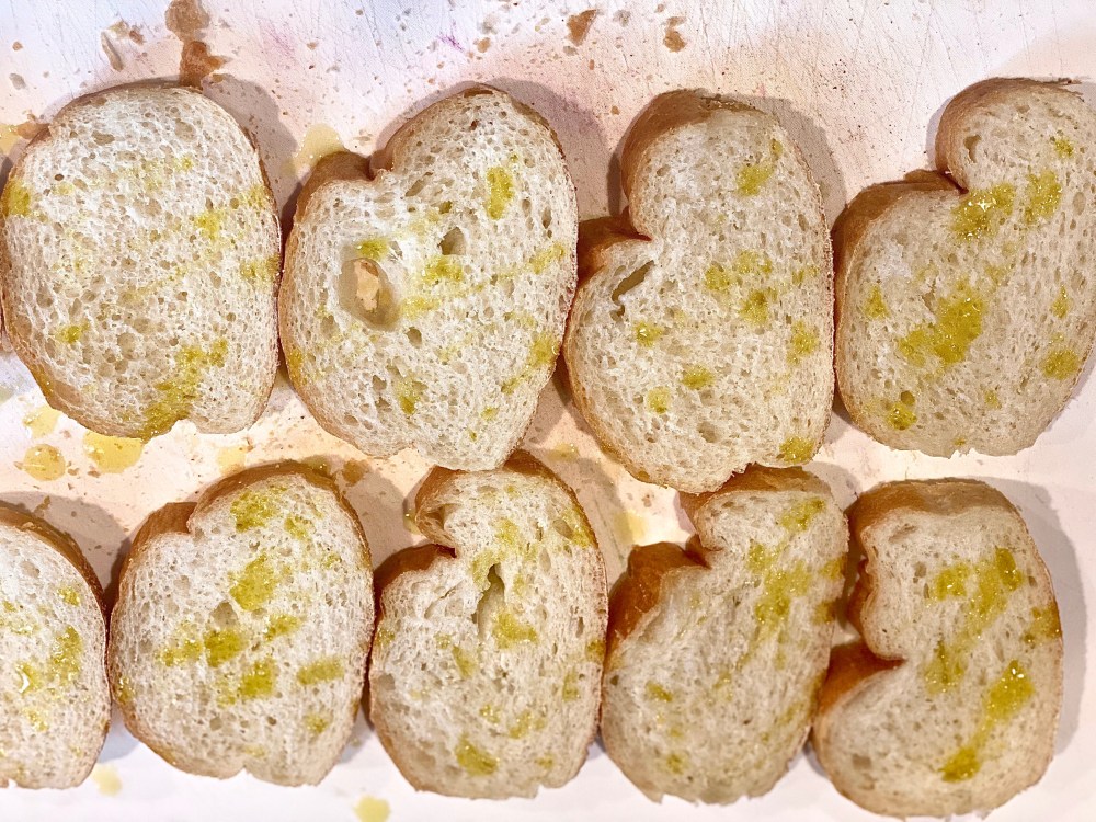 - Drizzle each piece of bread with the same olive oil we poured all over the tomato mixture.