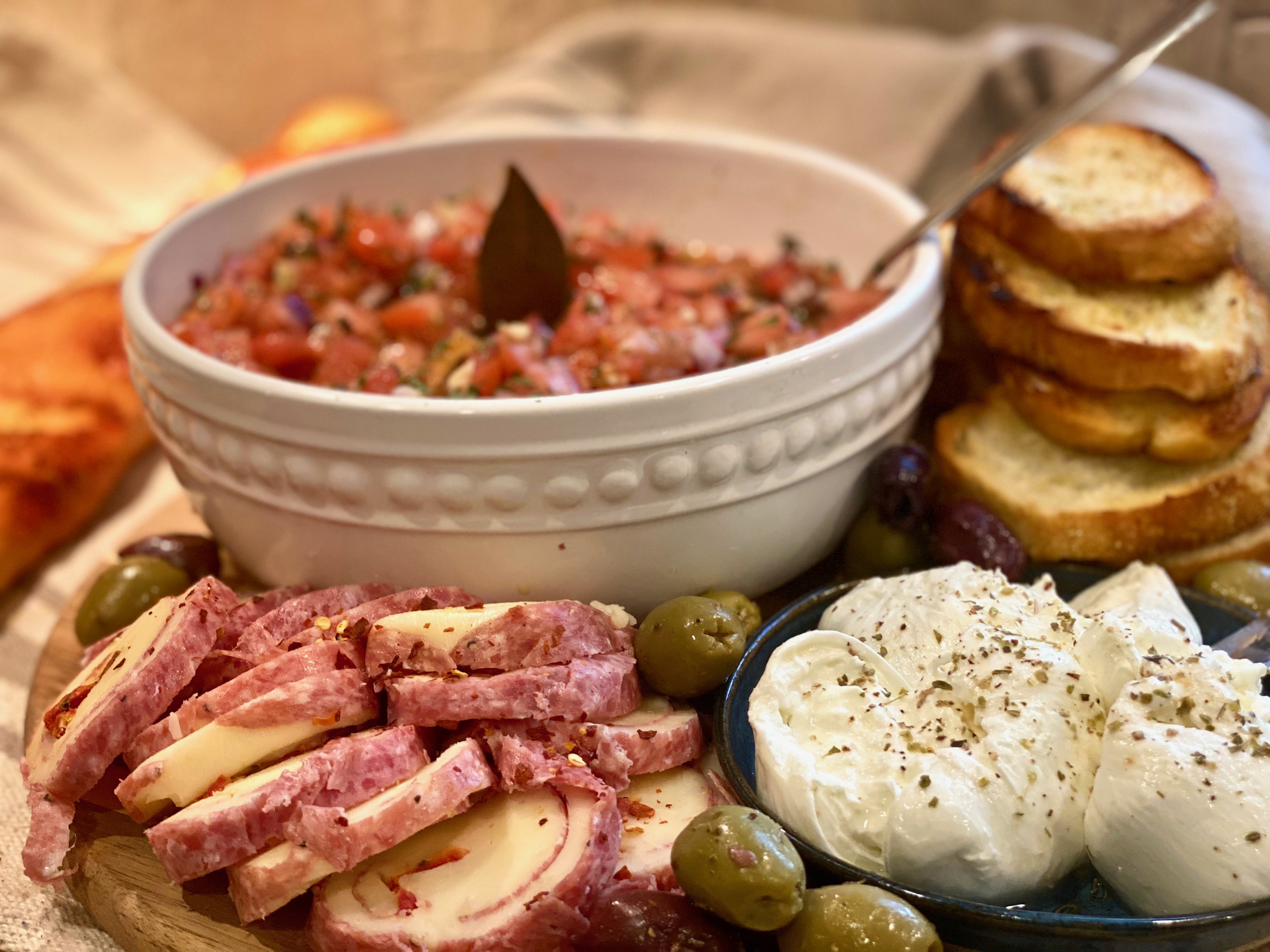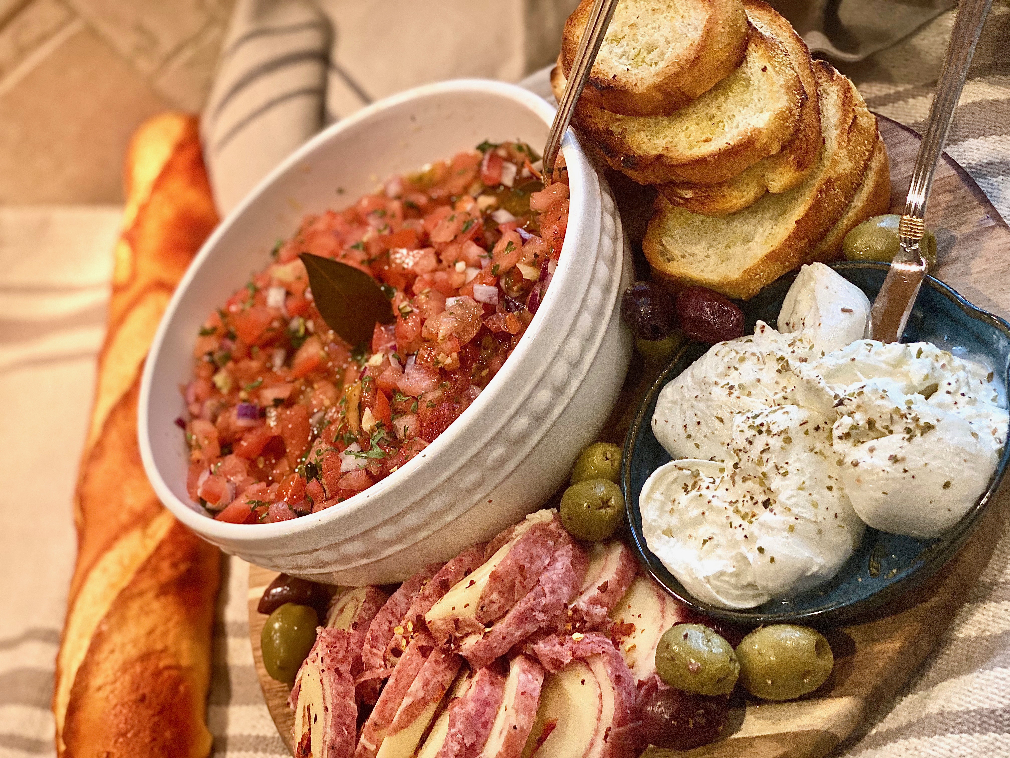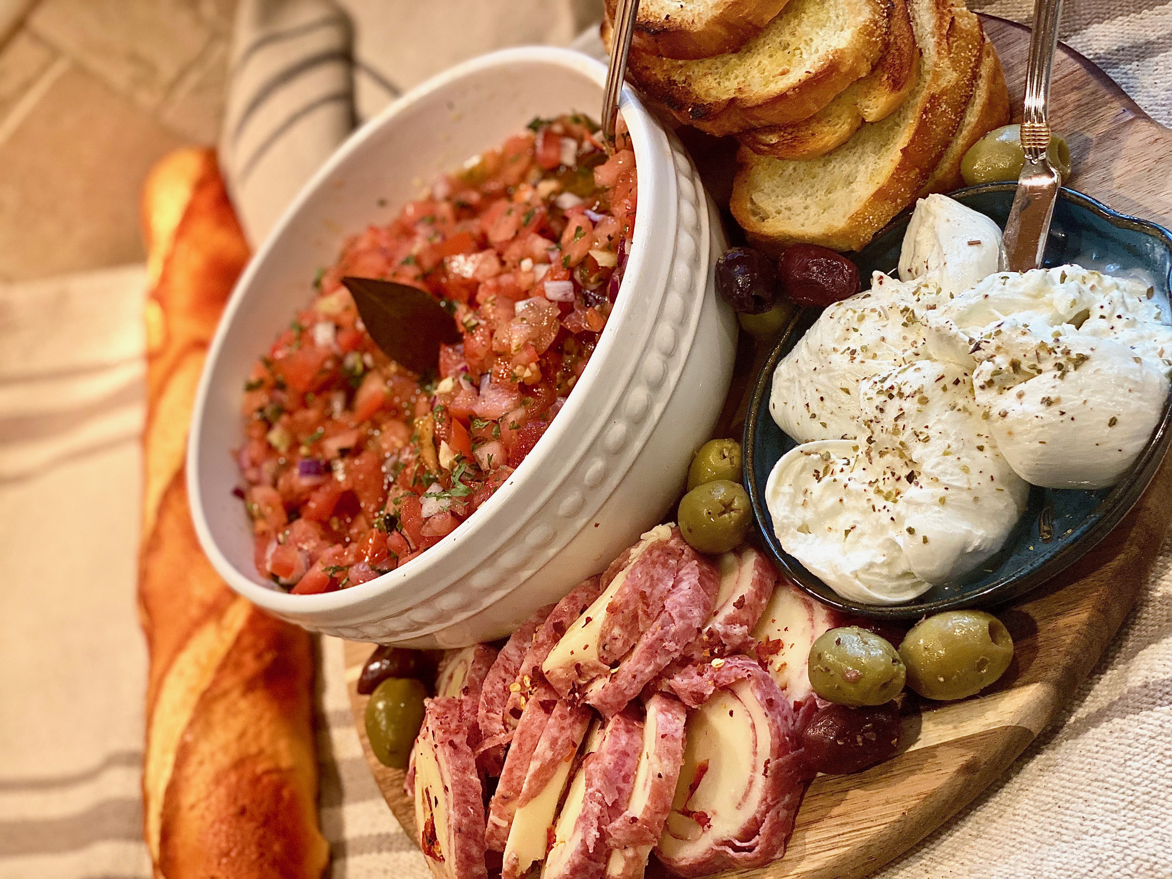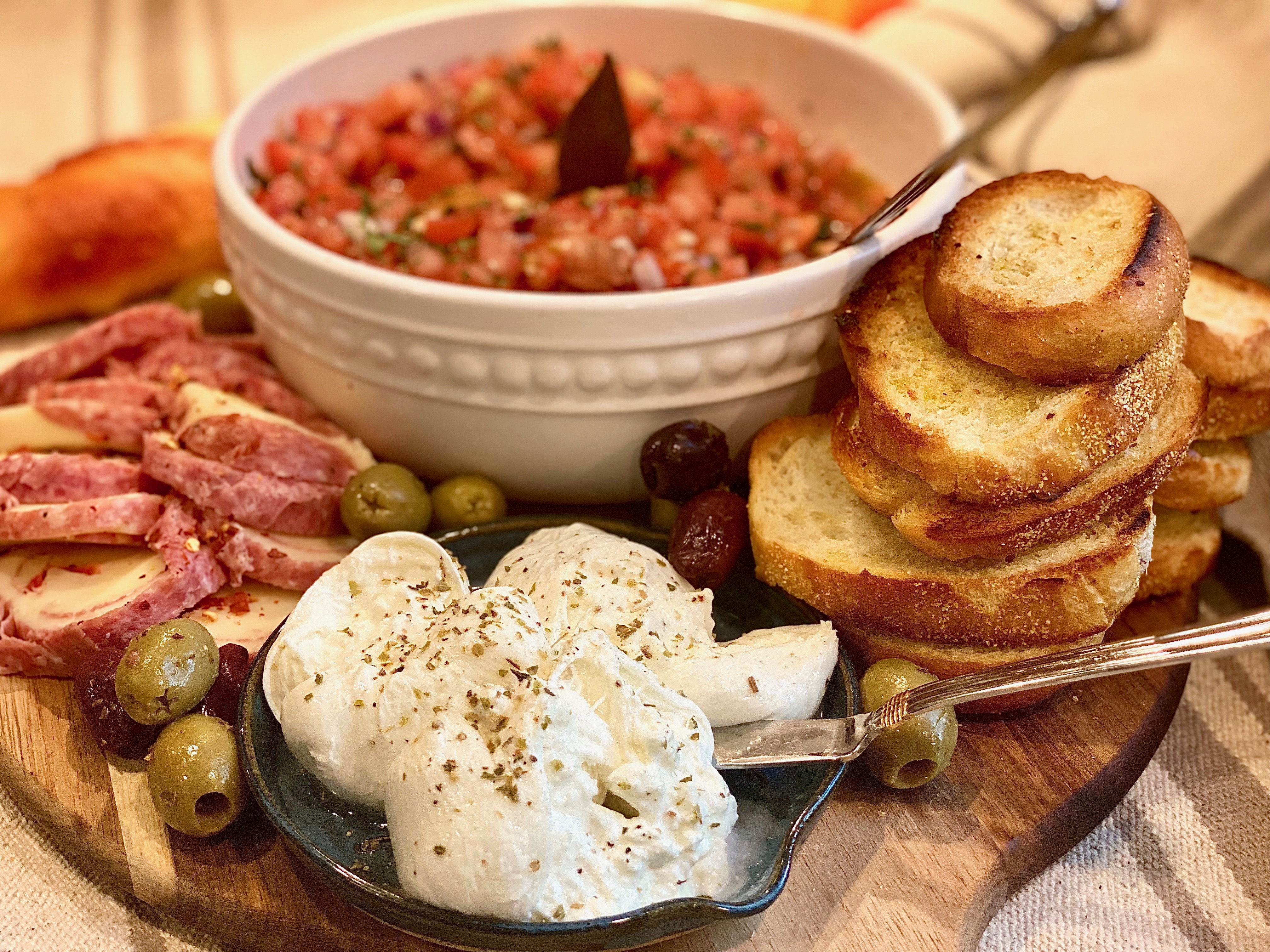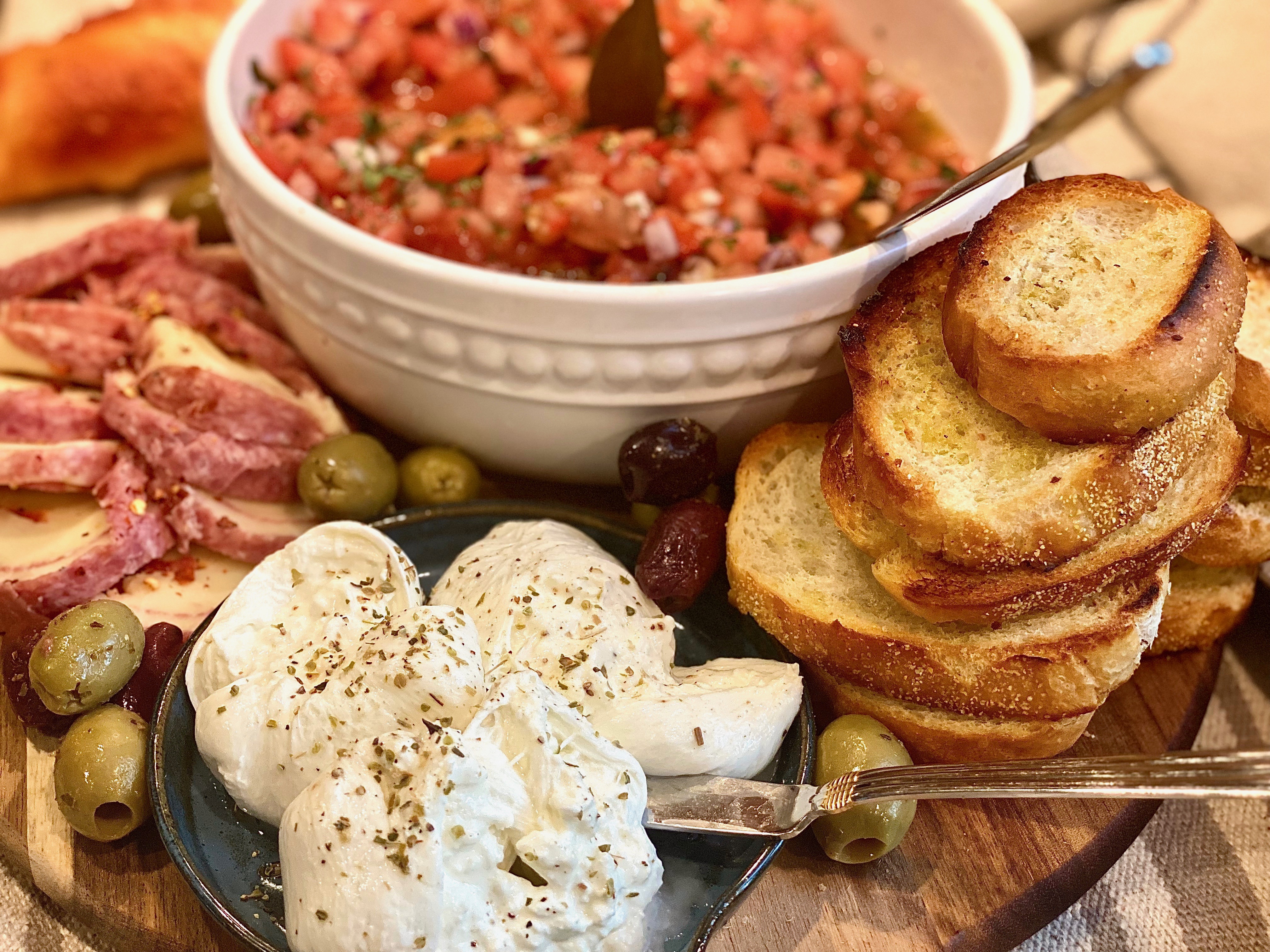 Next to the tomatoes and the bruschetta, I arranged some sliced mozzarella rolled with salami and sun-dried tomatoes. Then inside of a dipping plate, I placed two balls of fresh burratta and opened them to let all that creamy goodness start to ooze out!