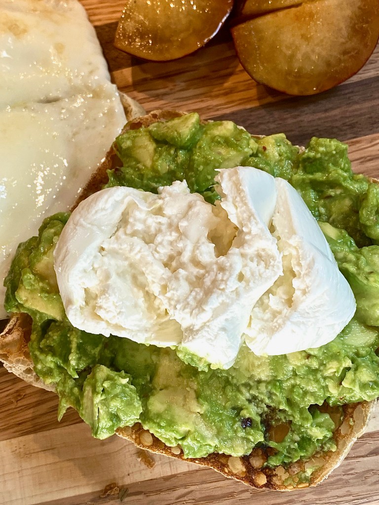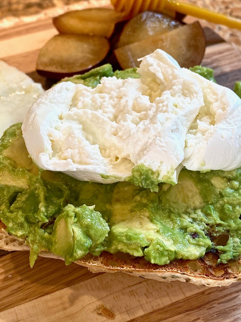 - For the scrumptious cheese part of the sandwich.. place an entire ball of burrata on top of the mashed avocado mixture.