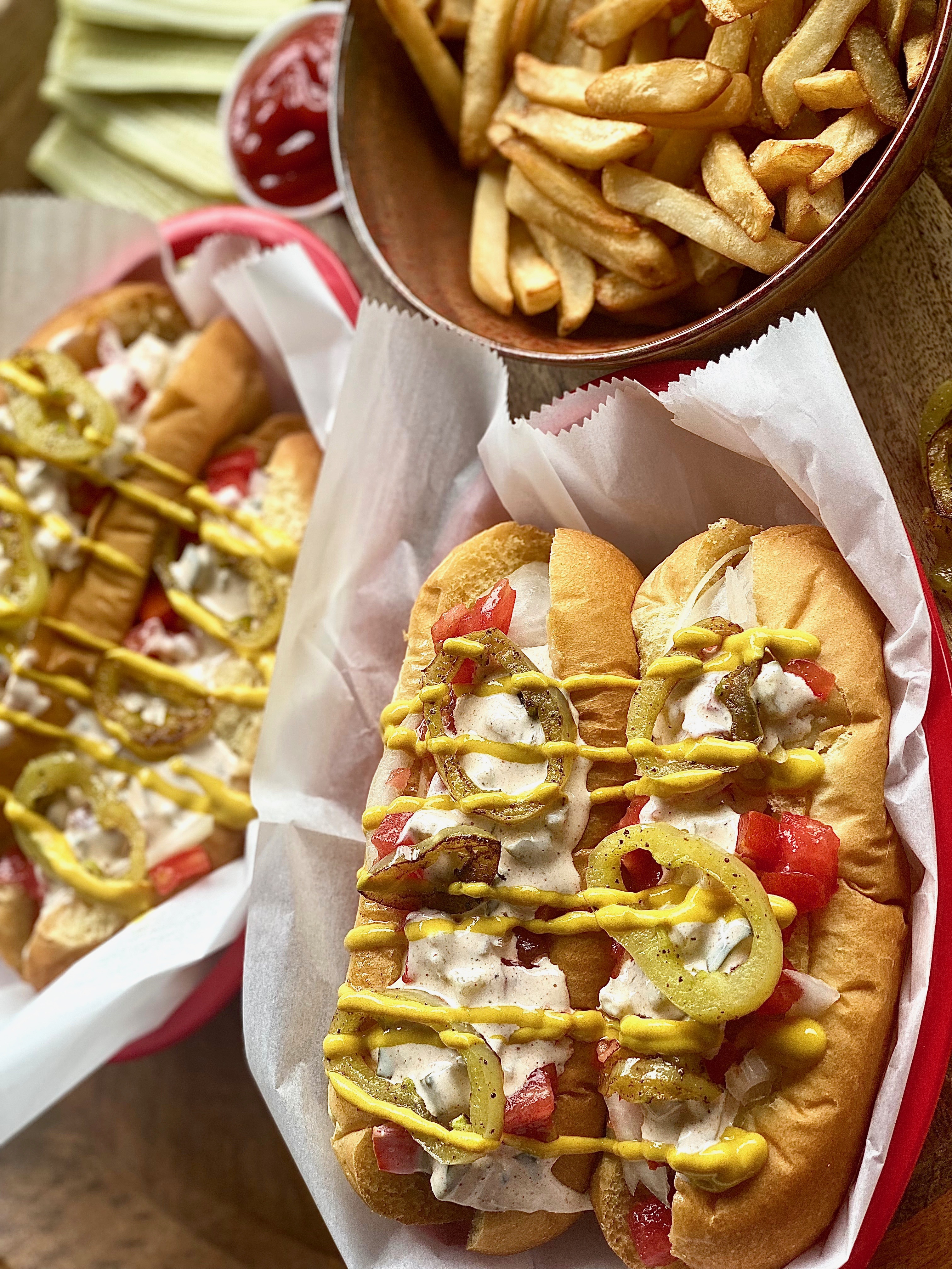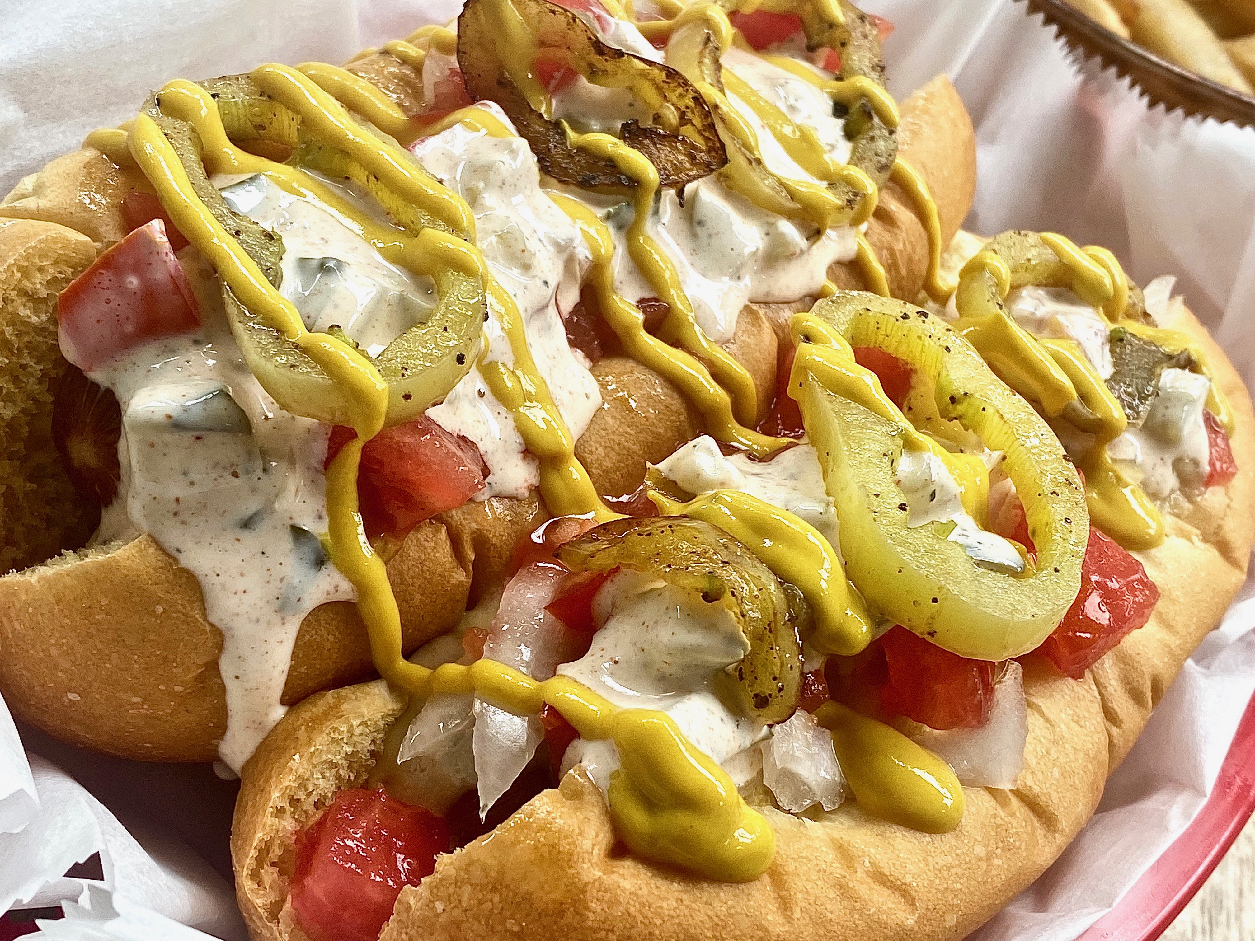 Some of the most decadent hot dogs I have ever seen in my entire life.