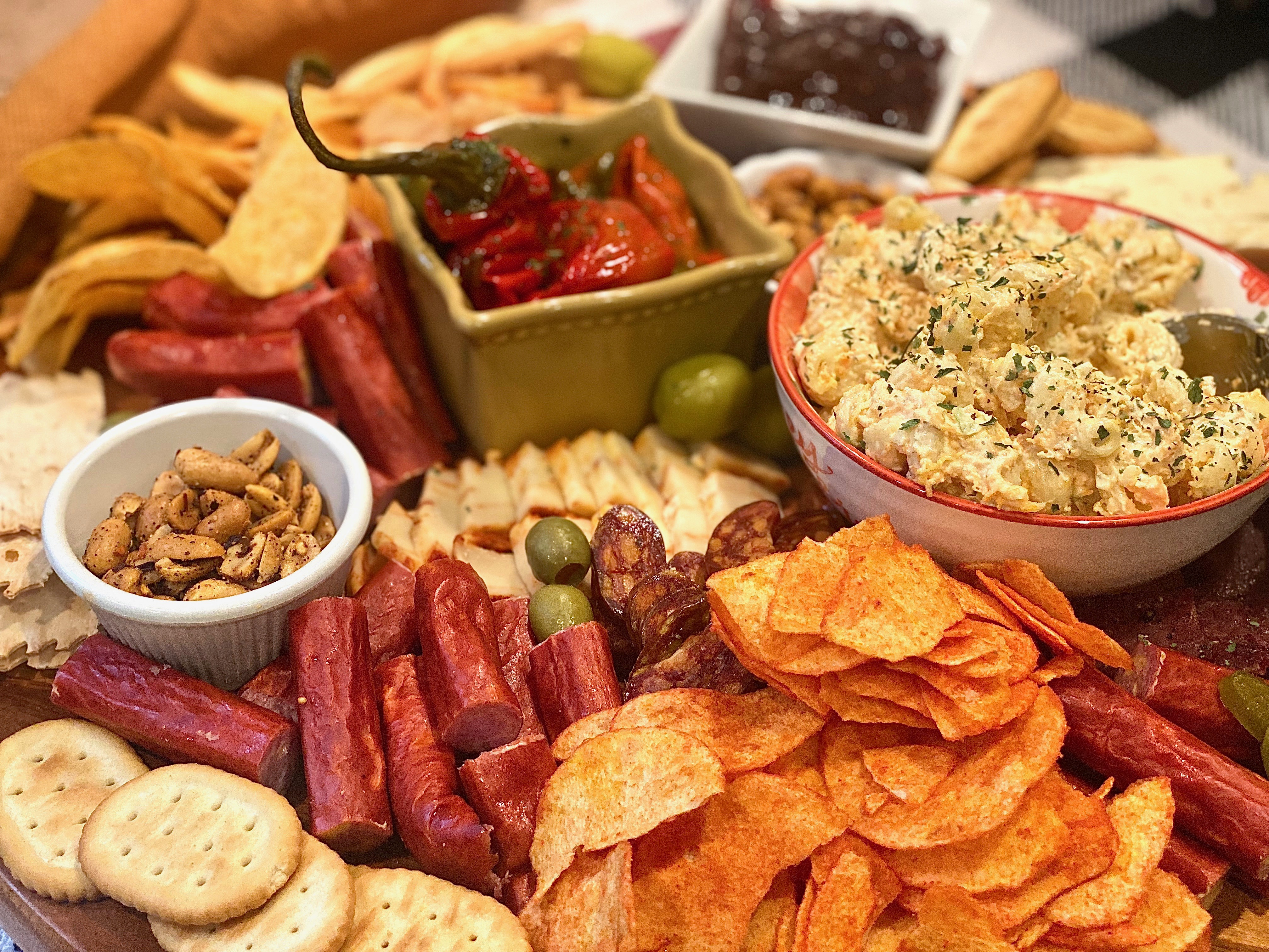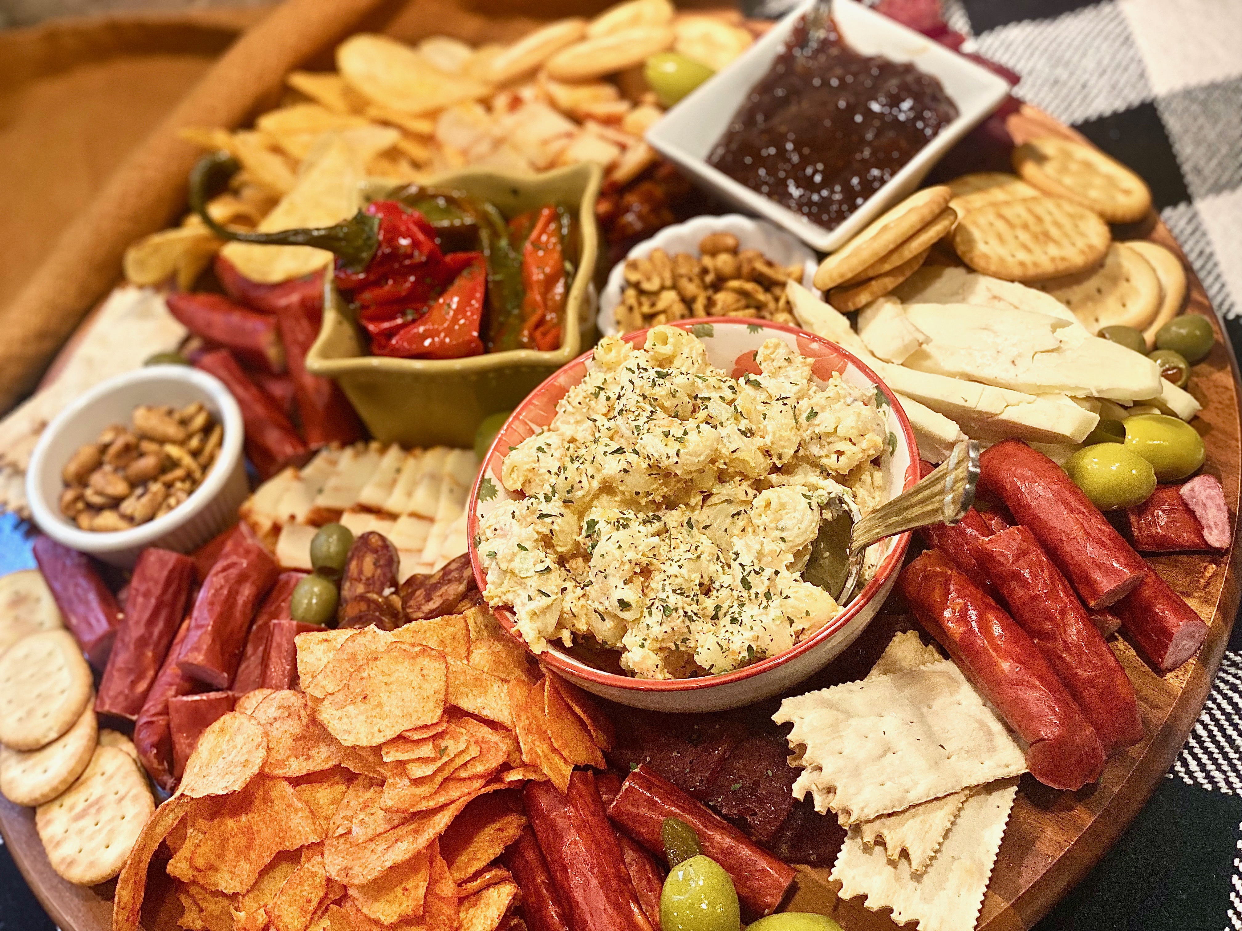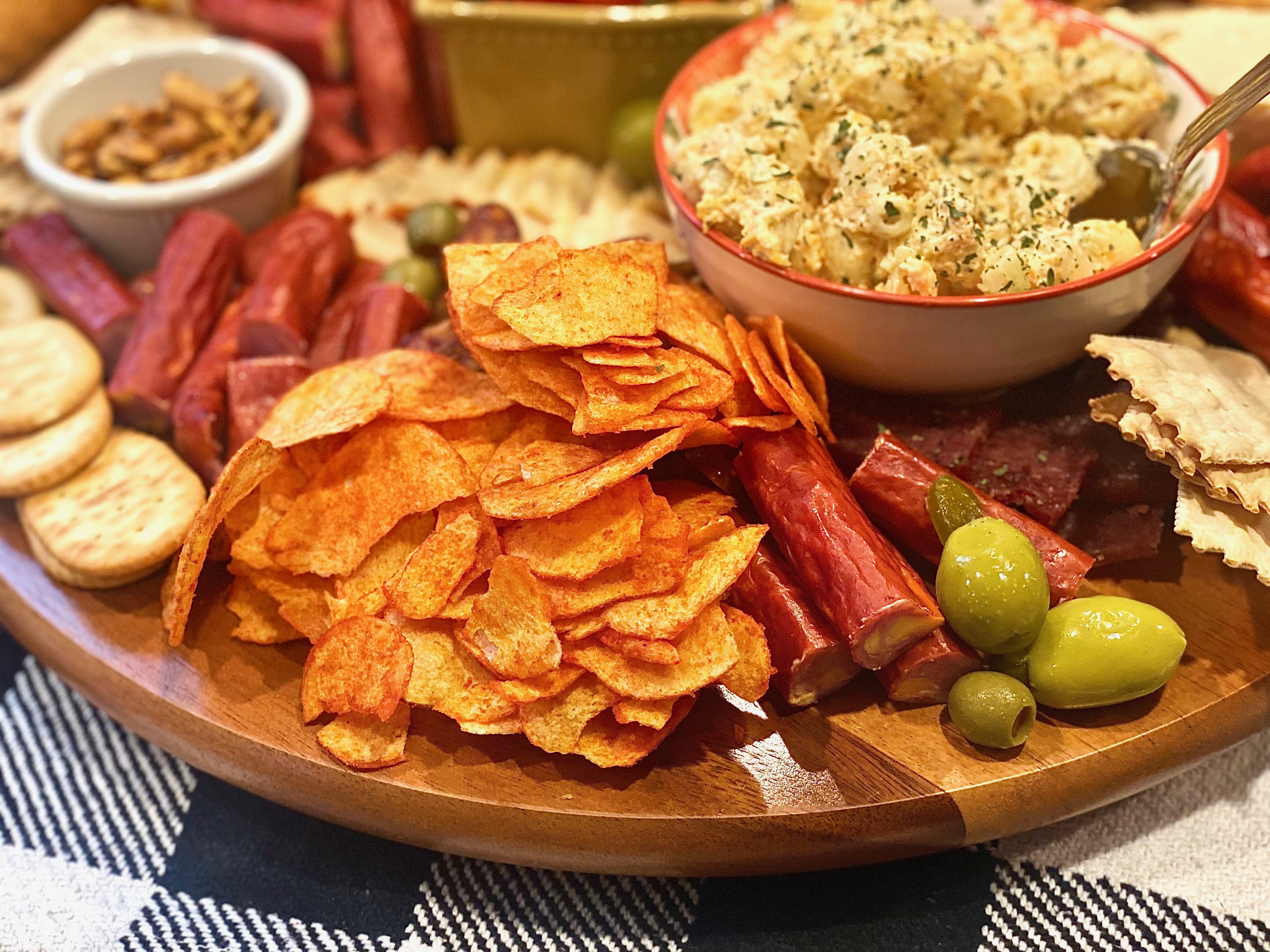 - Spiced turkey jerky for some texture! I have that laying next to the macaroni salad and the long hots.