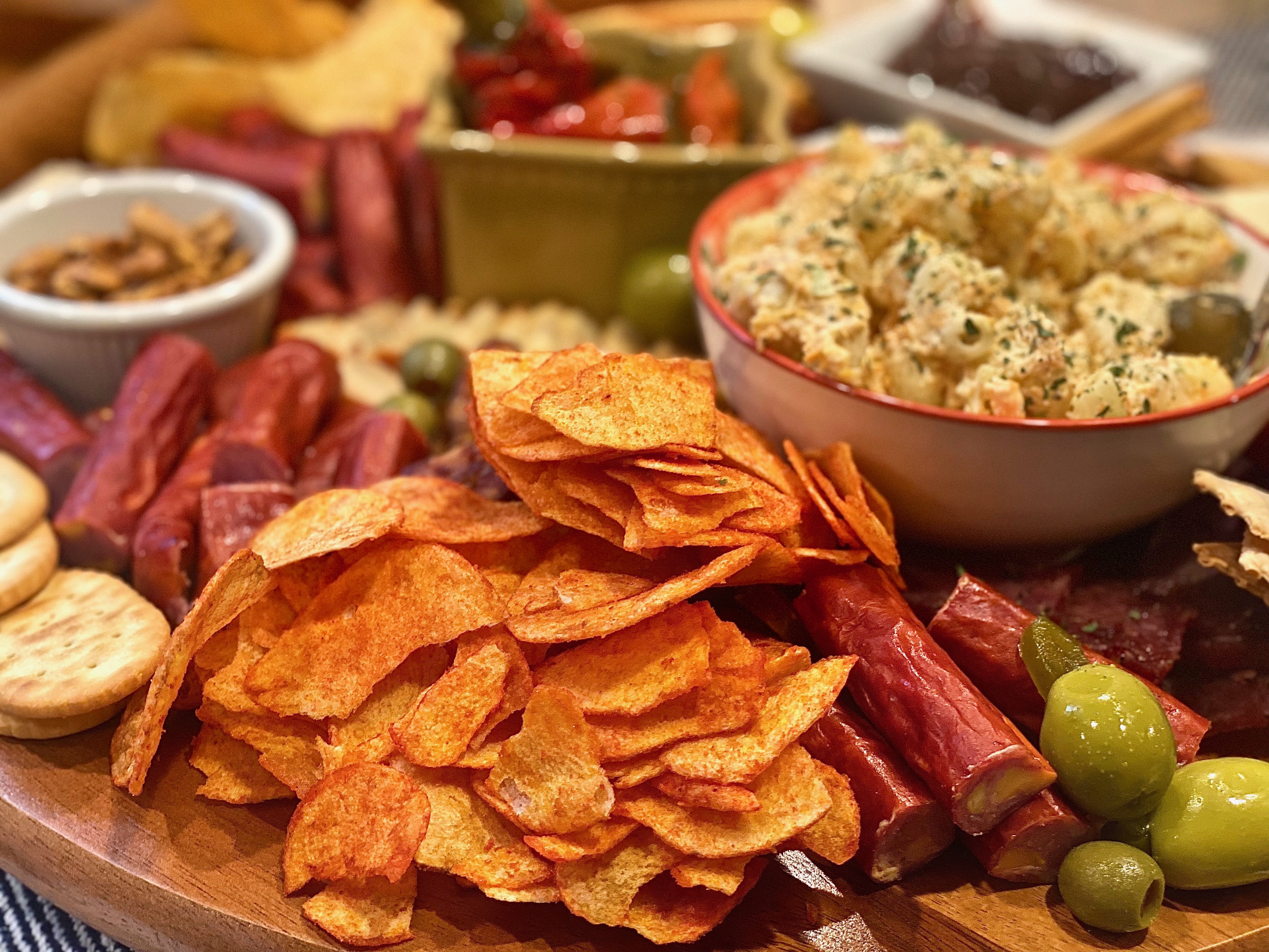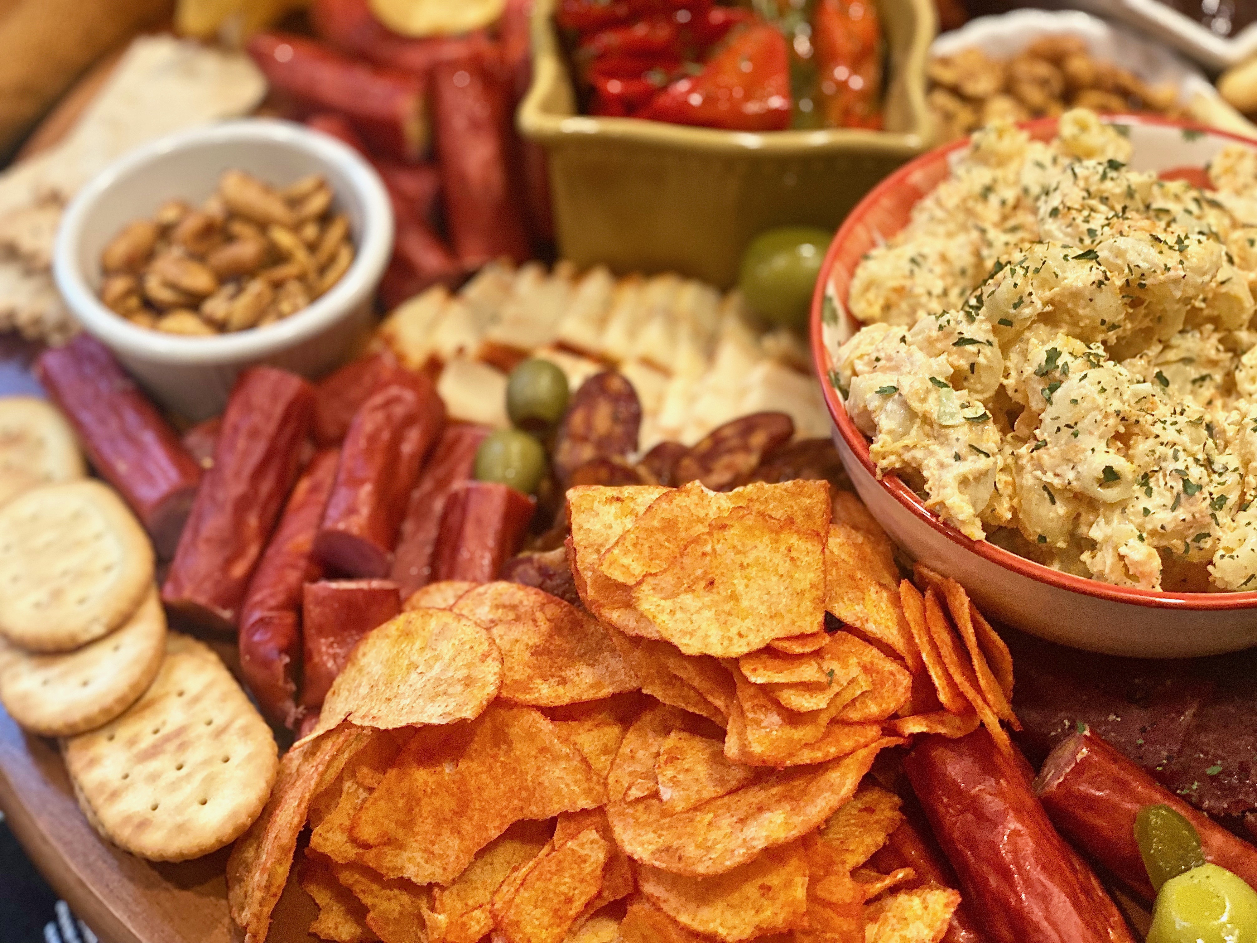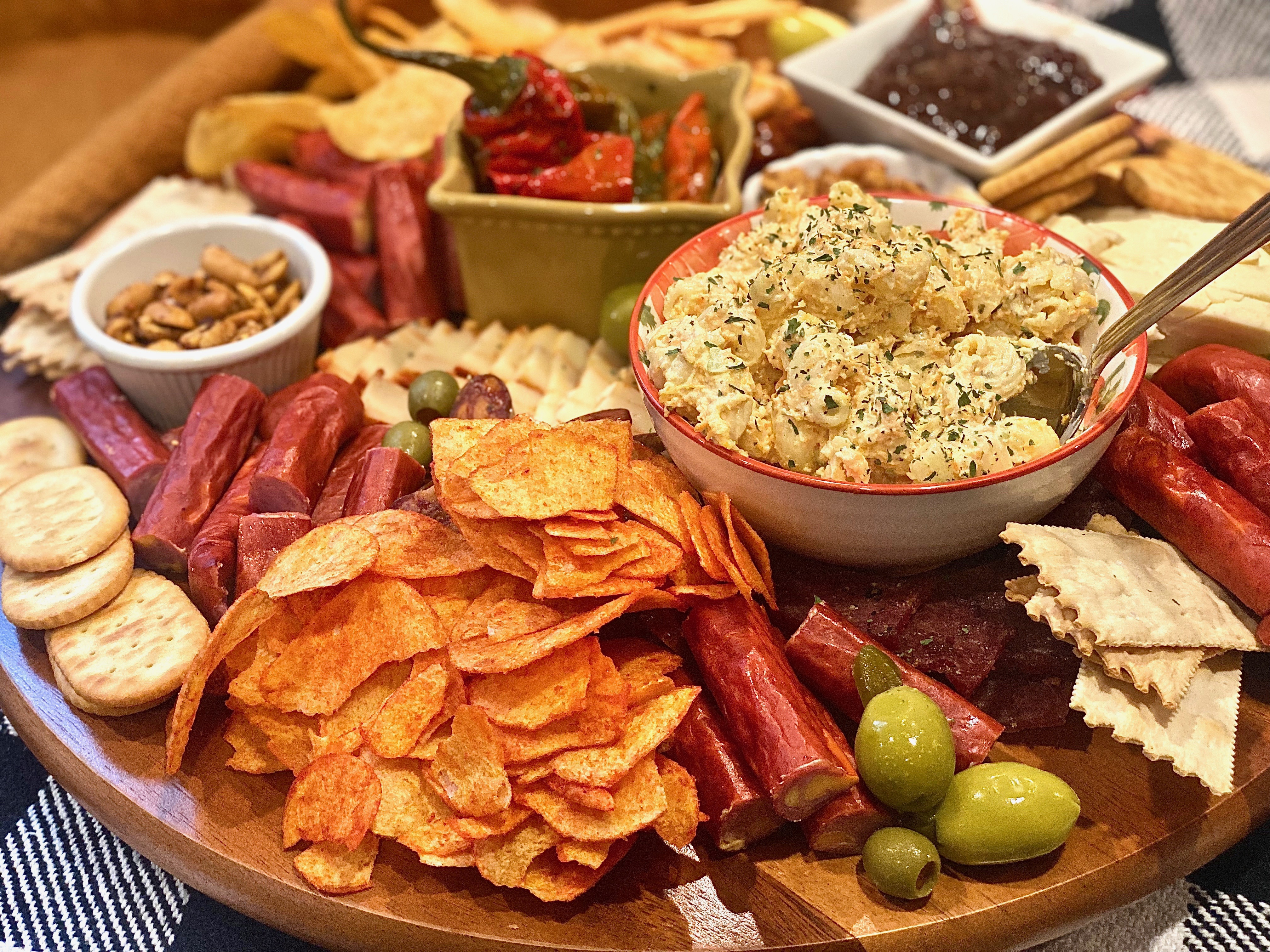 - Spiced turkey jerky for some texture! I have that laying next to the macaroni salad and the long hots.