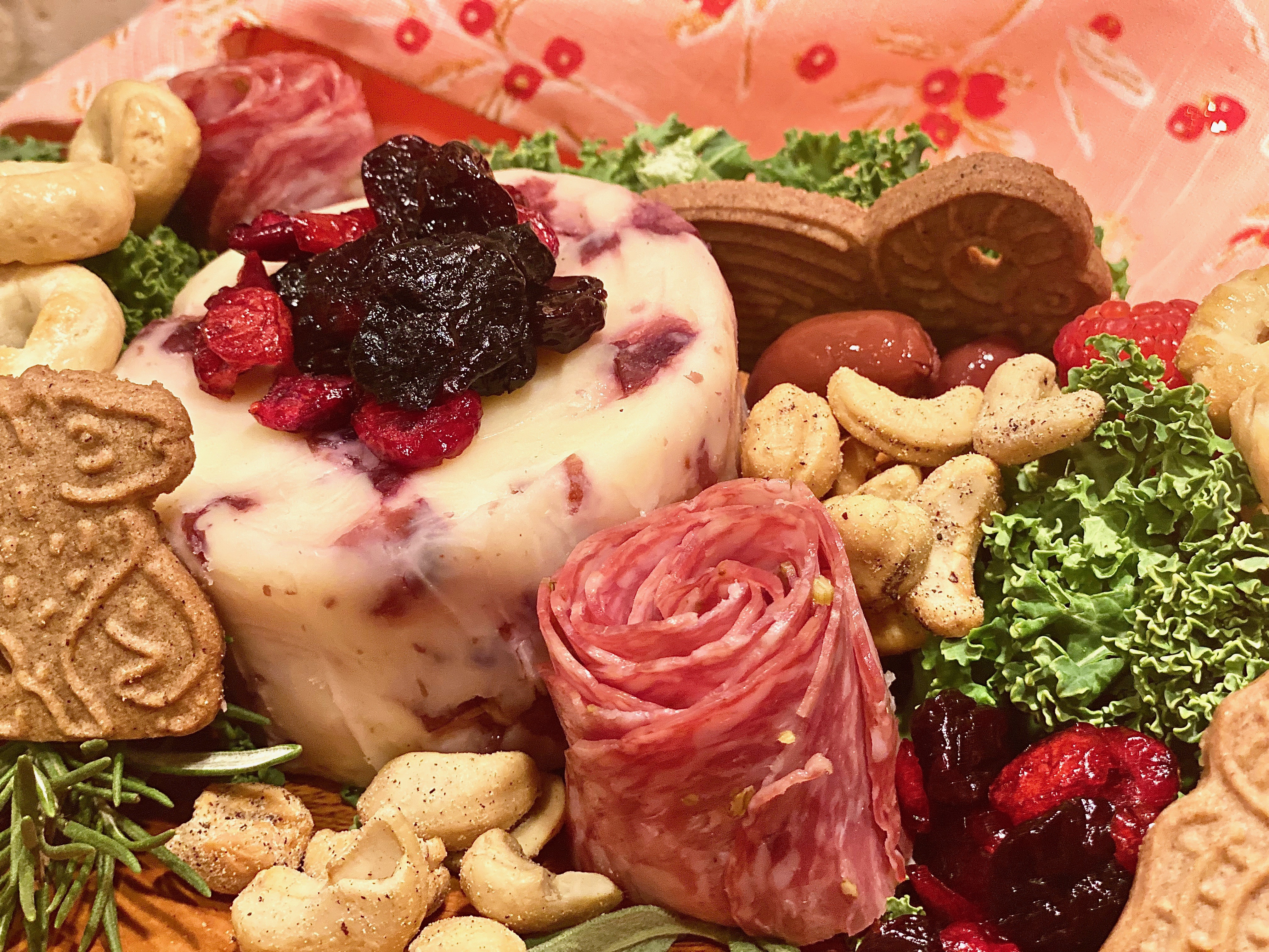 - Bottom left photo: Cranberry cheddar. I decided to top this tangy, fruity, creamy white cheddar with a small handful of mixed dried berries. Cherries, cranberries, and blueberries resemble holly on top of this succulent cheese!
