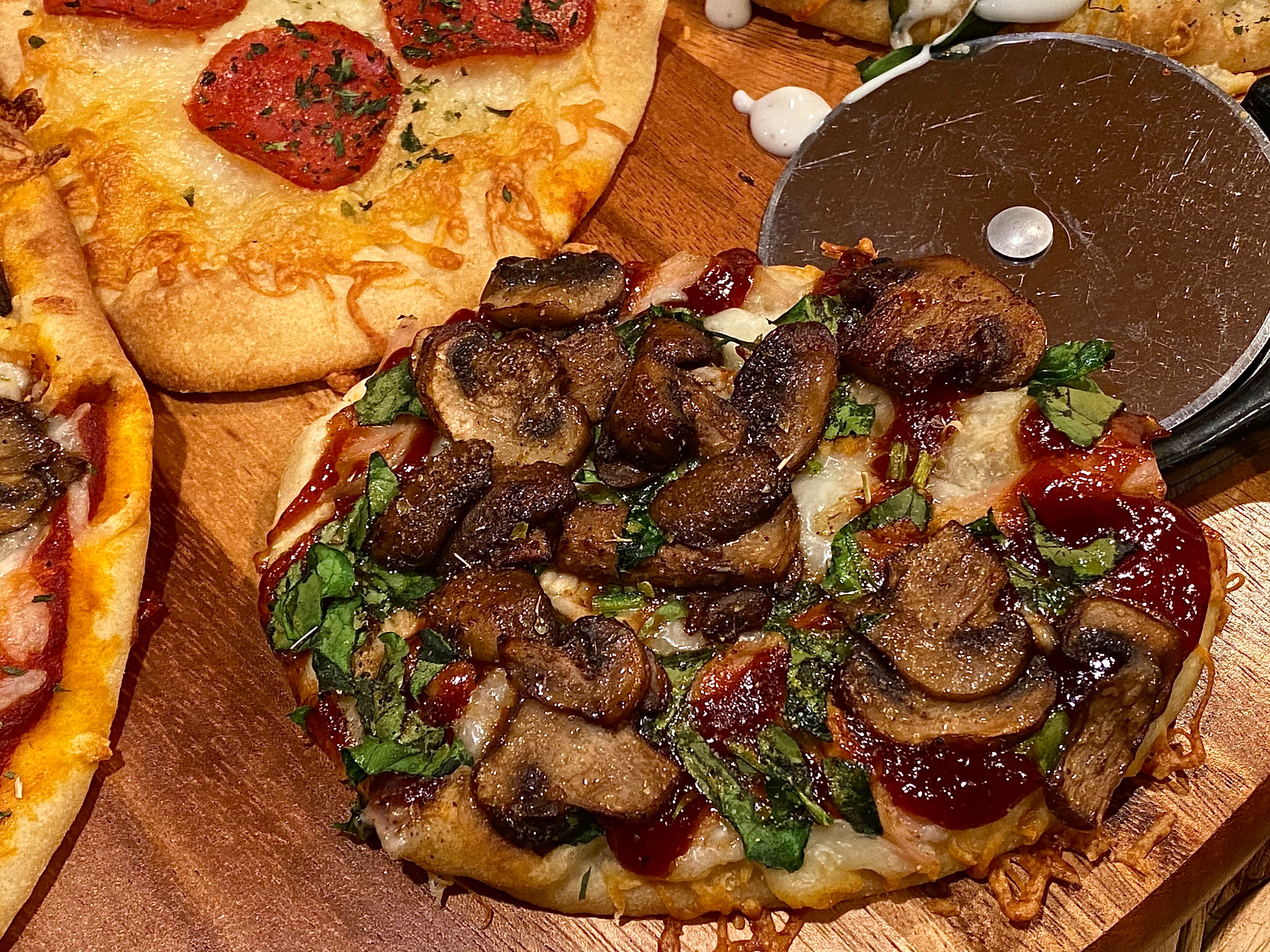 - After you’ve sauteed thinly sliced mushrooms in two tablespoons of olive oil and one tablespoon of butter seasoned with everything I seasoned the NAAN with, you’re going to want to scatter them all over the top of your pizza.