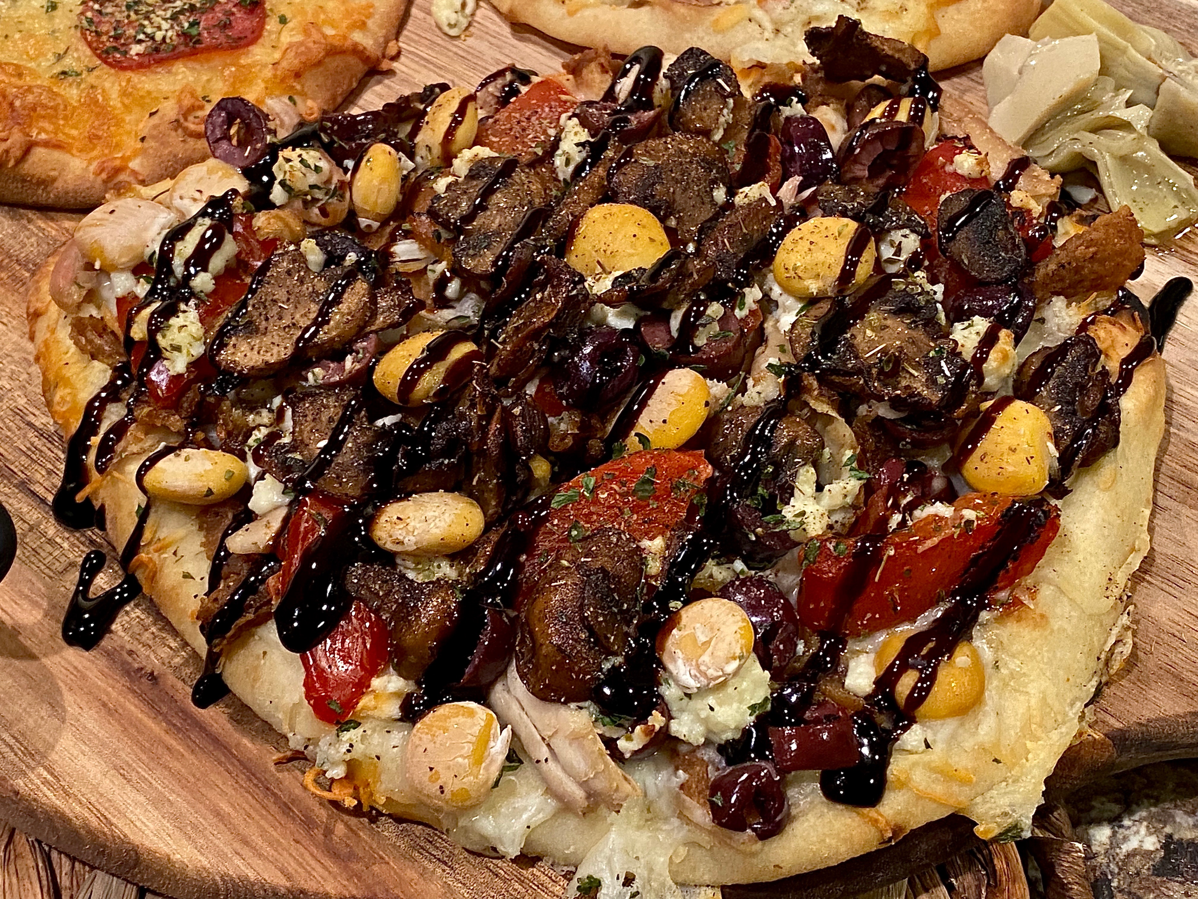 A Mediterranean Fried Chicken Flatbread with Boursin Cheese.