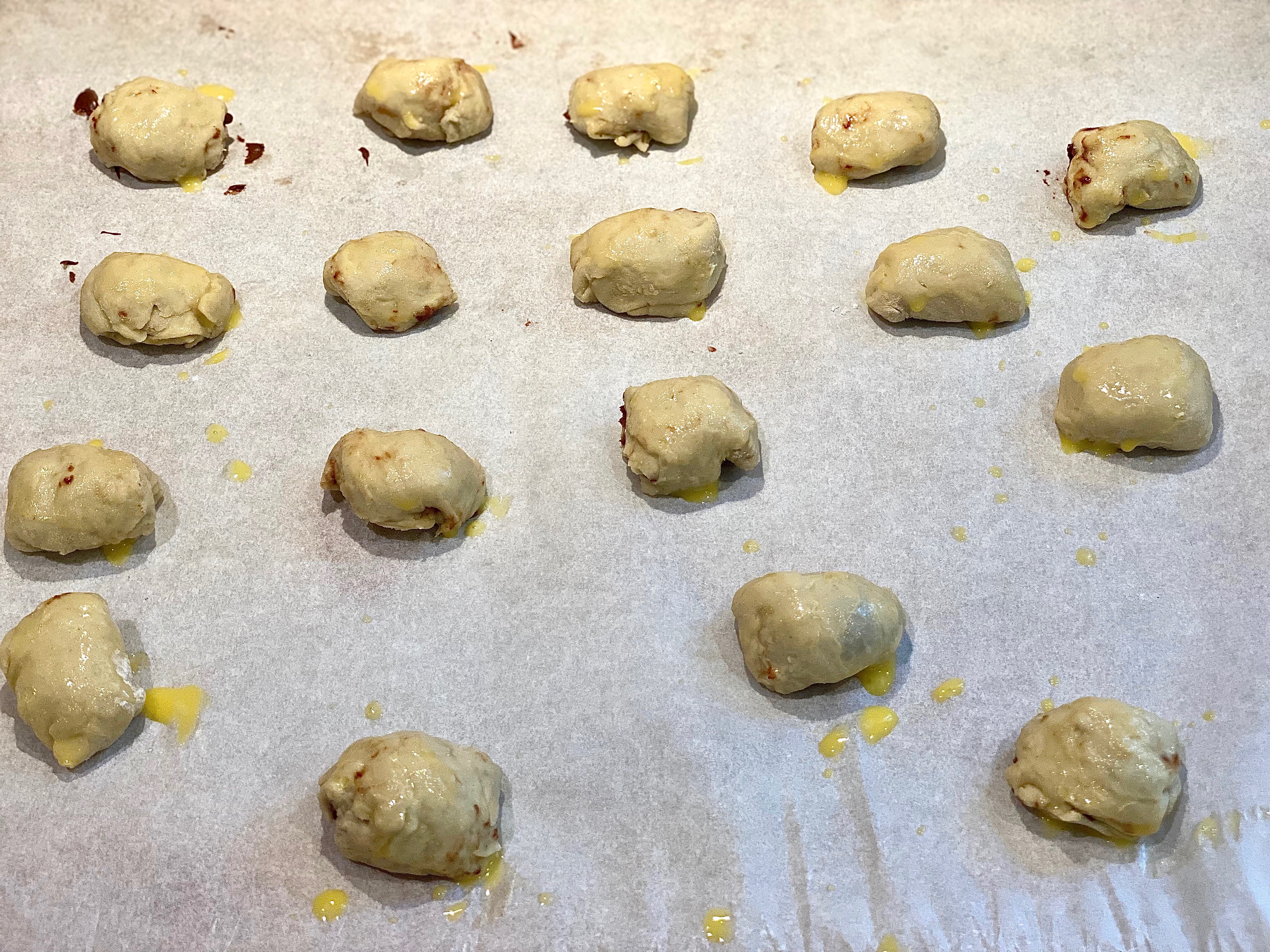 - Brush the egg wash on top of each of the nuggets that are on a parchment paper lined baking sheet.