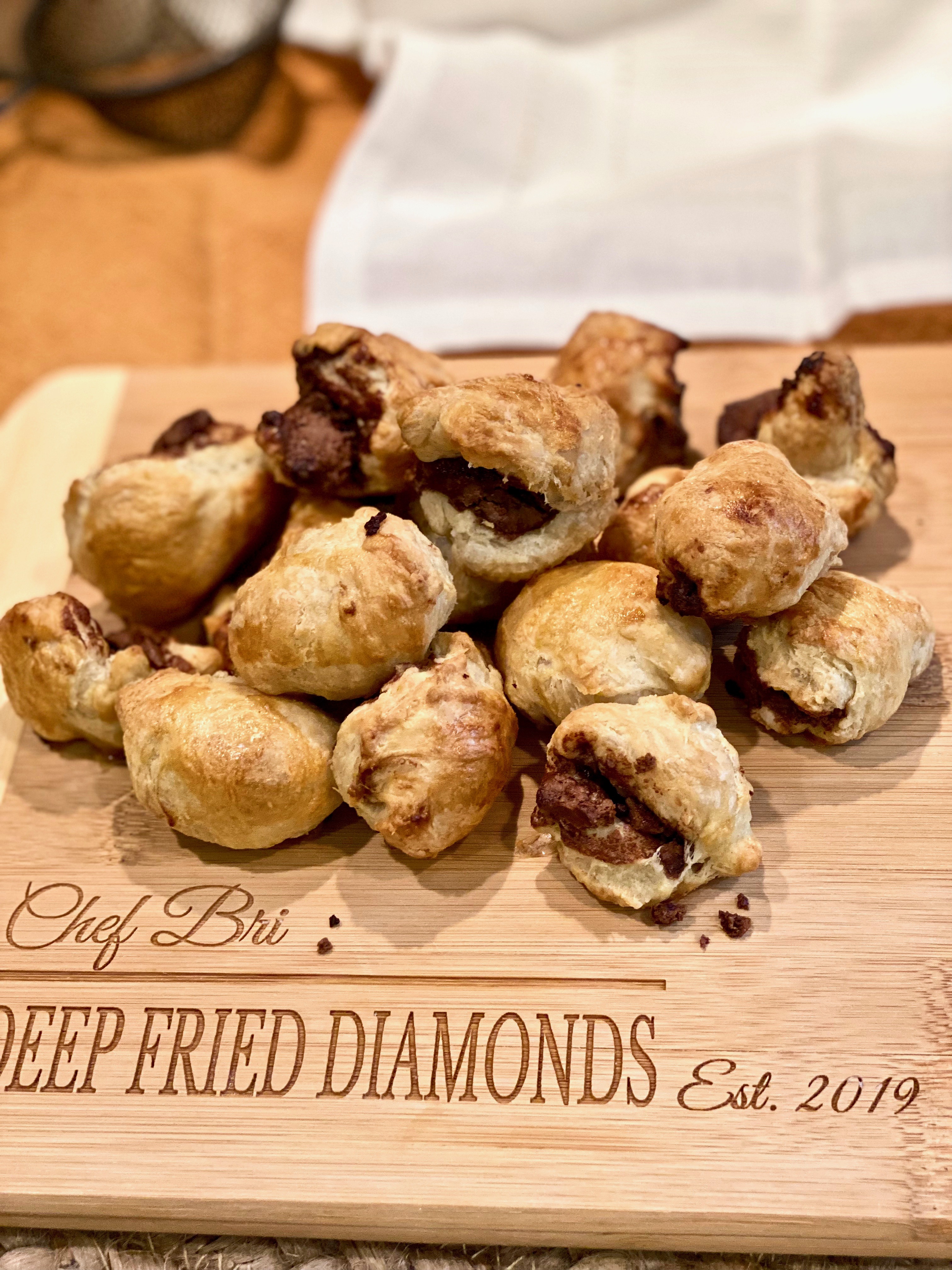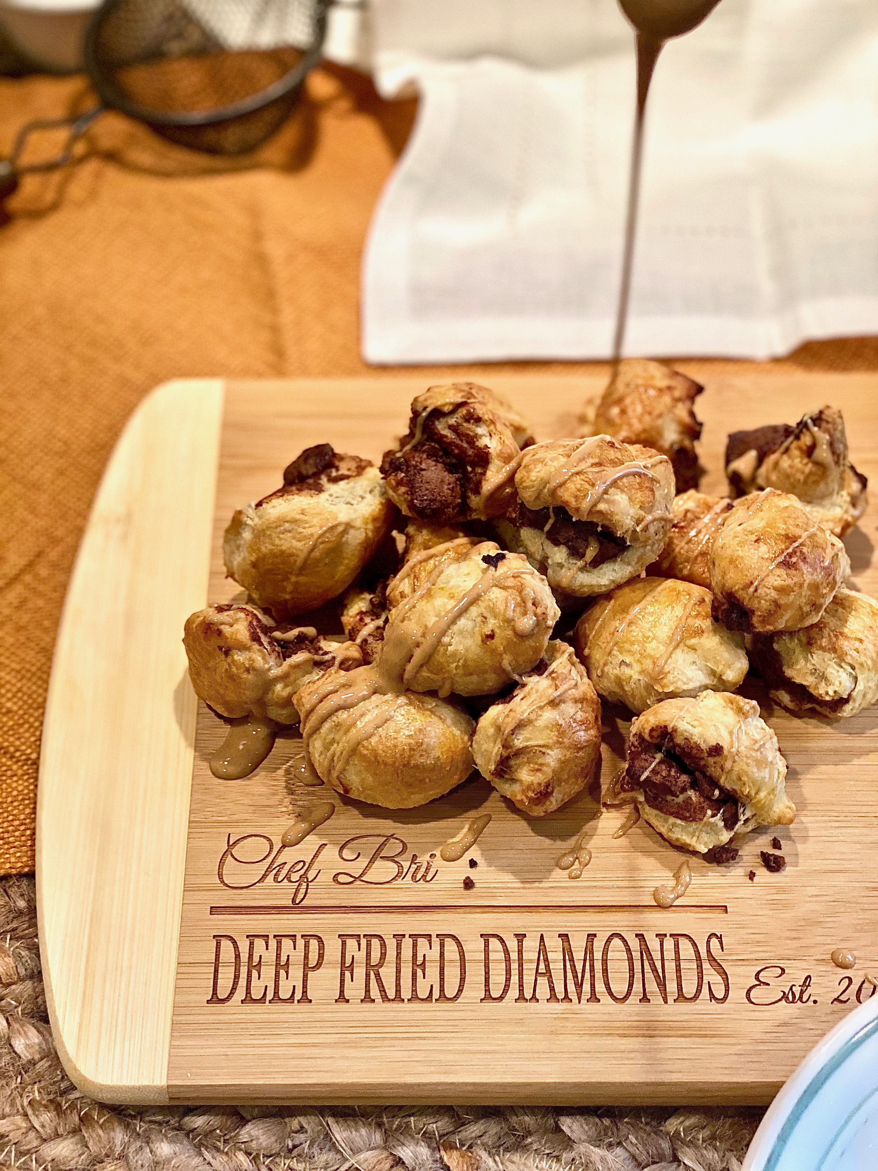 Yes Diamonds! Nutella nuggets! They’re the most delicious, incredible, little pop-able sweet treats you could indulge yourself in. These babies would liven up any party, curb any peanut butter and chocolate craving you’re having, and they’ll make any movie night magnificent by serving the best ooey-gooey snack to munch on! Just imagine it! Puff pastry gets filled with thick, wonderful globs of Nutella and baked until golden brown. Then, they get an irresistible drizzle of melty peanut butter and a delectable dusting of powdered sugar. These little nuggets are so freaking addicting it’s unreal! I used left over puff pastry dough I had from a previous recipe to make this batch right here, but if you want to make a whole bunch of them you can go ahead and purchase as much puff pastry as you think you would need. I promise you that you’ll be more than happy with these and so will your kids! Trust me, Diamonds. 🙂