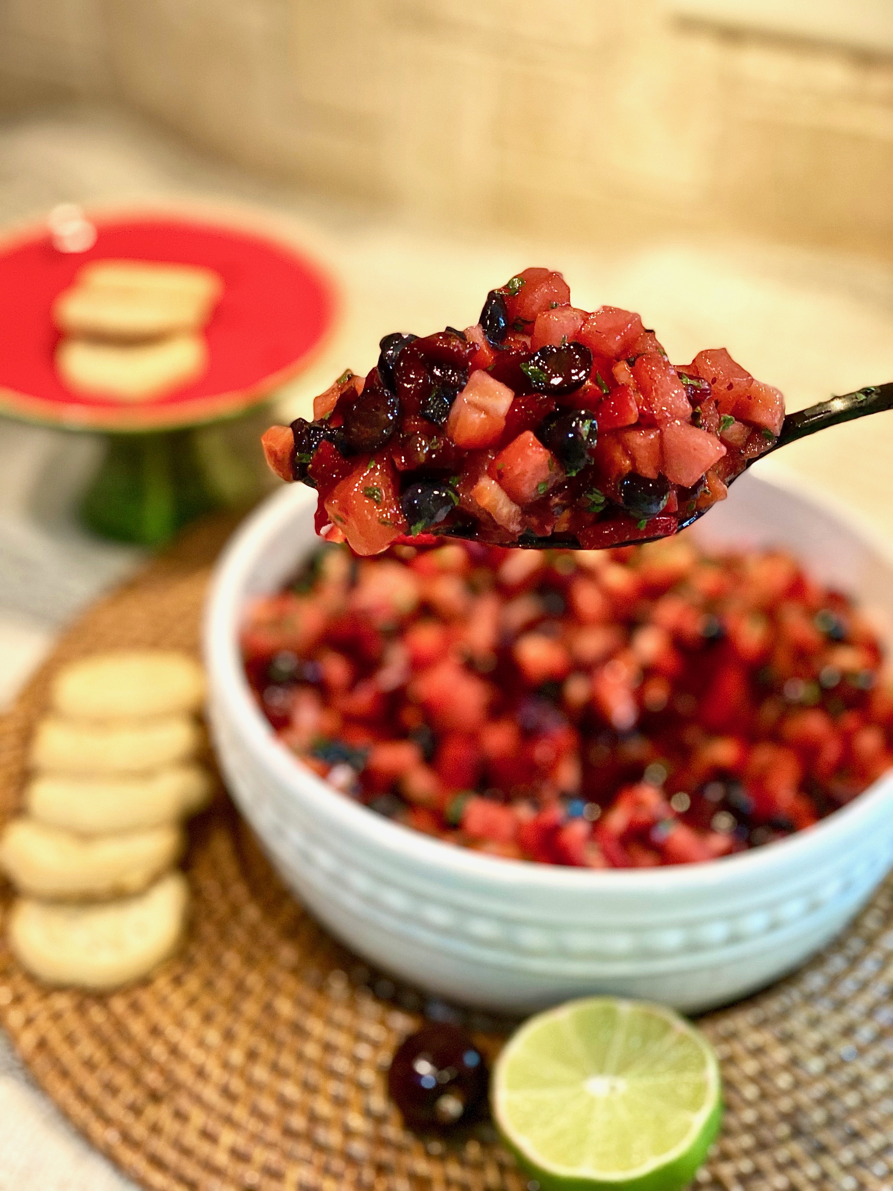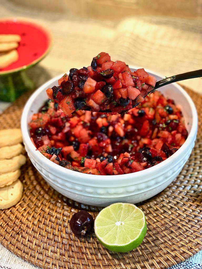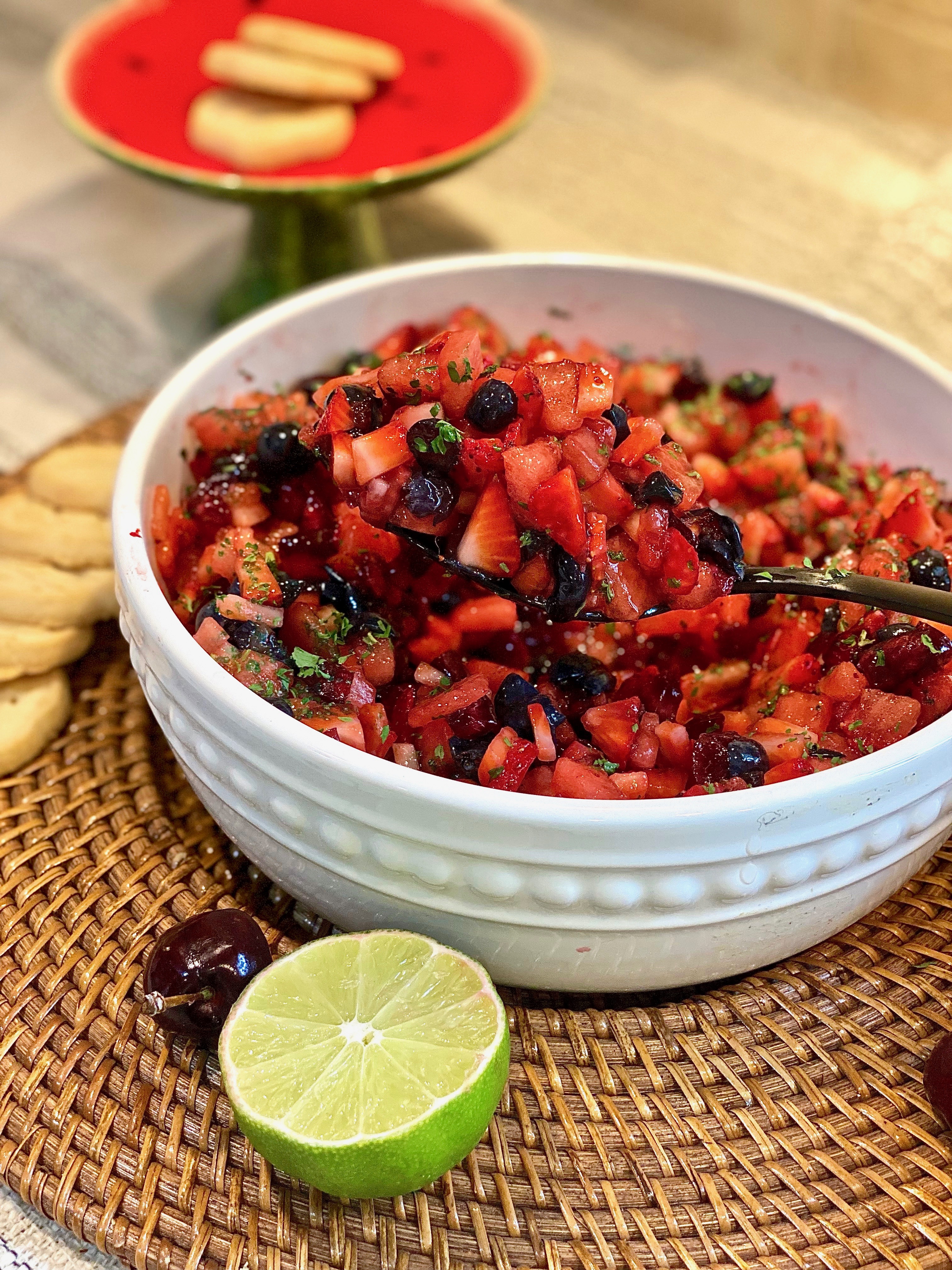 This ruby red fruit salsa is this Summers sweetest treat! It’s light, super yummy, and honestly so satisfying especially when you pile a spoonful on your favorite piece of cake or cookie. You can even serve this as a topping on a sundae bar for people who love fruit in their ice cream! A bowl of this candied goodness is perfect to bring to a pot luck, a dinner party, or a causal outdoor barbecue at your best friends house! If you are bringing it out of your house and to an event you can remove the insides of a bundt cake and fill it with the fruit salsa!! That way, you don’t have to worry about never getting your decorative bowl back and everyone will be wowed by the pretty presentation! You’ll also be able to use pieces of the bundt cake itself to use as a vessel for the salsa as it gets scooped out!