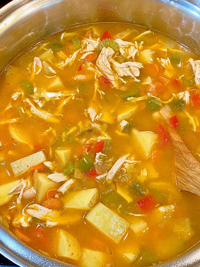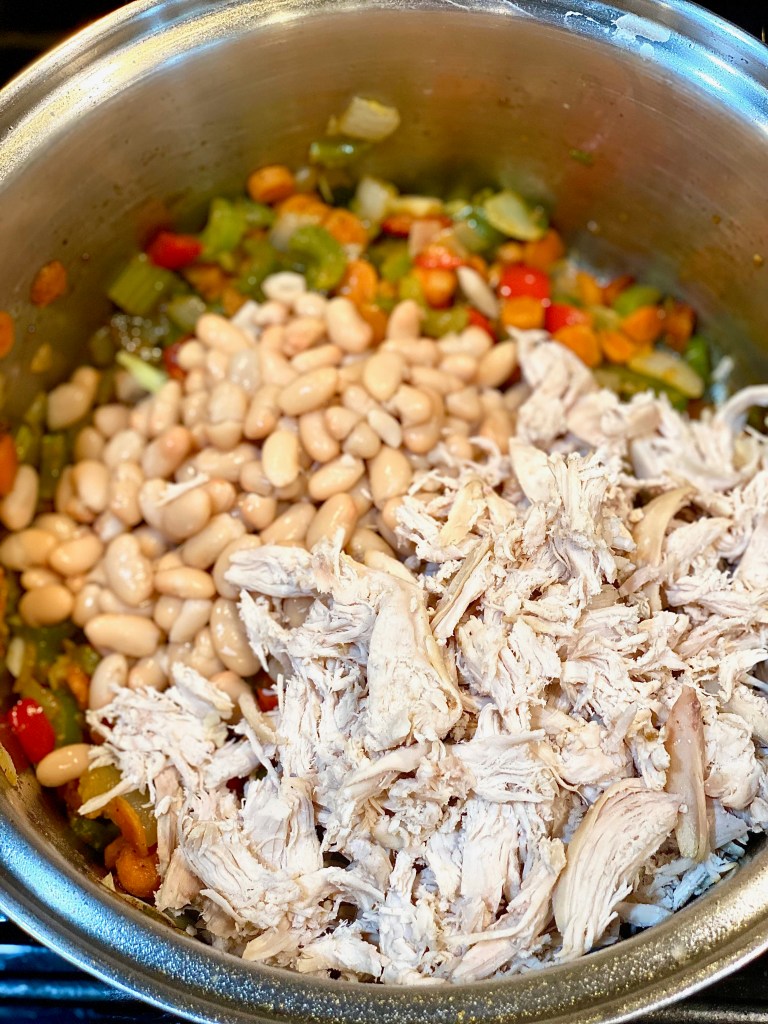 • After the flour is stirred in you can toss in a can of cannellini beans, three chopped golden potatoes (they’re the best), and shredded chicken breasts from a rotisserie chicken. I think that has the most flavor when it comes to adding chicken into a soup, as well as being the easiest way.