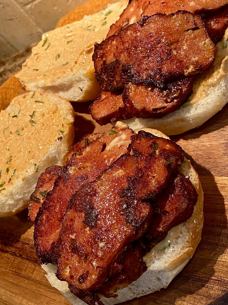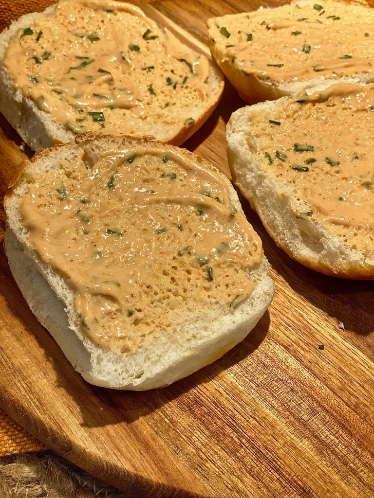 A smokey spread to put on each side of the kaiser rolls. Soft, buttery rolls are great, but for this particular dish I definitely prefer a hard roll. The textures mesh well together.