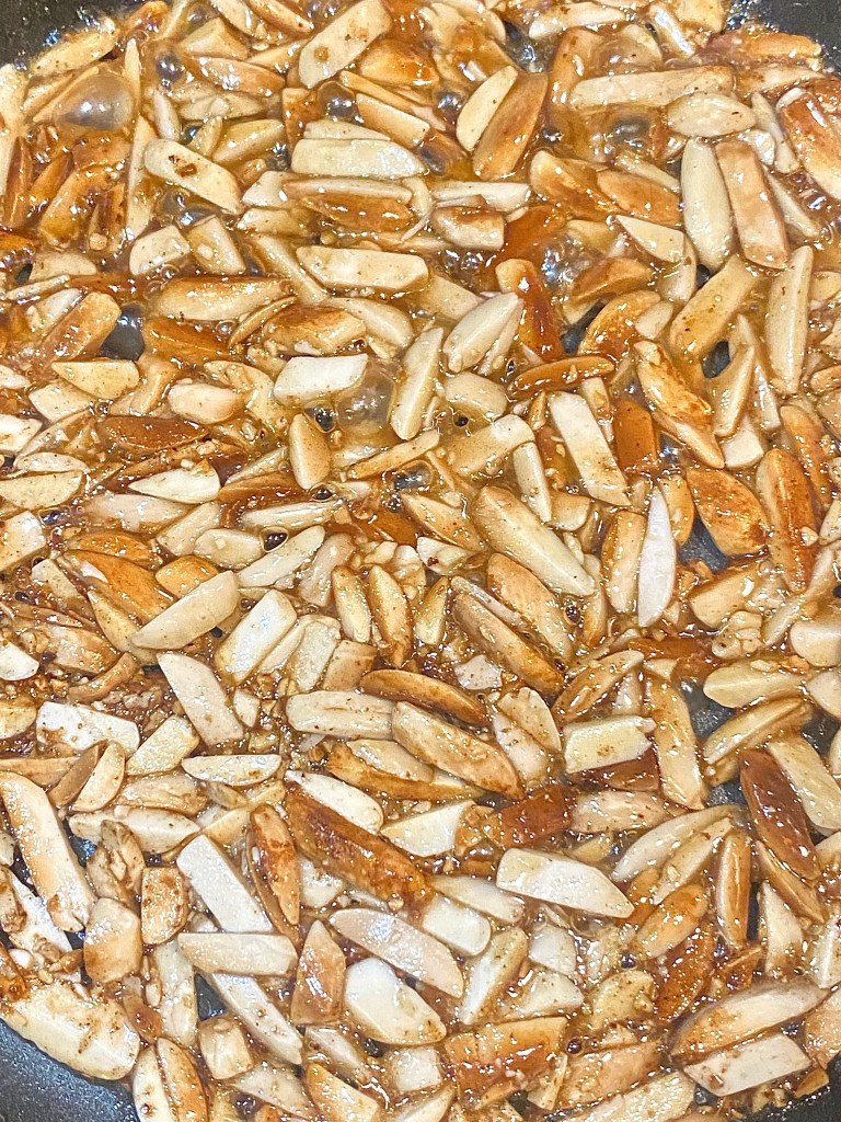 - In a pan over medium low heat, add one tablespoon of butter along with two tablespoons of maple syrup with slivered almonds.