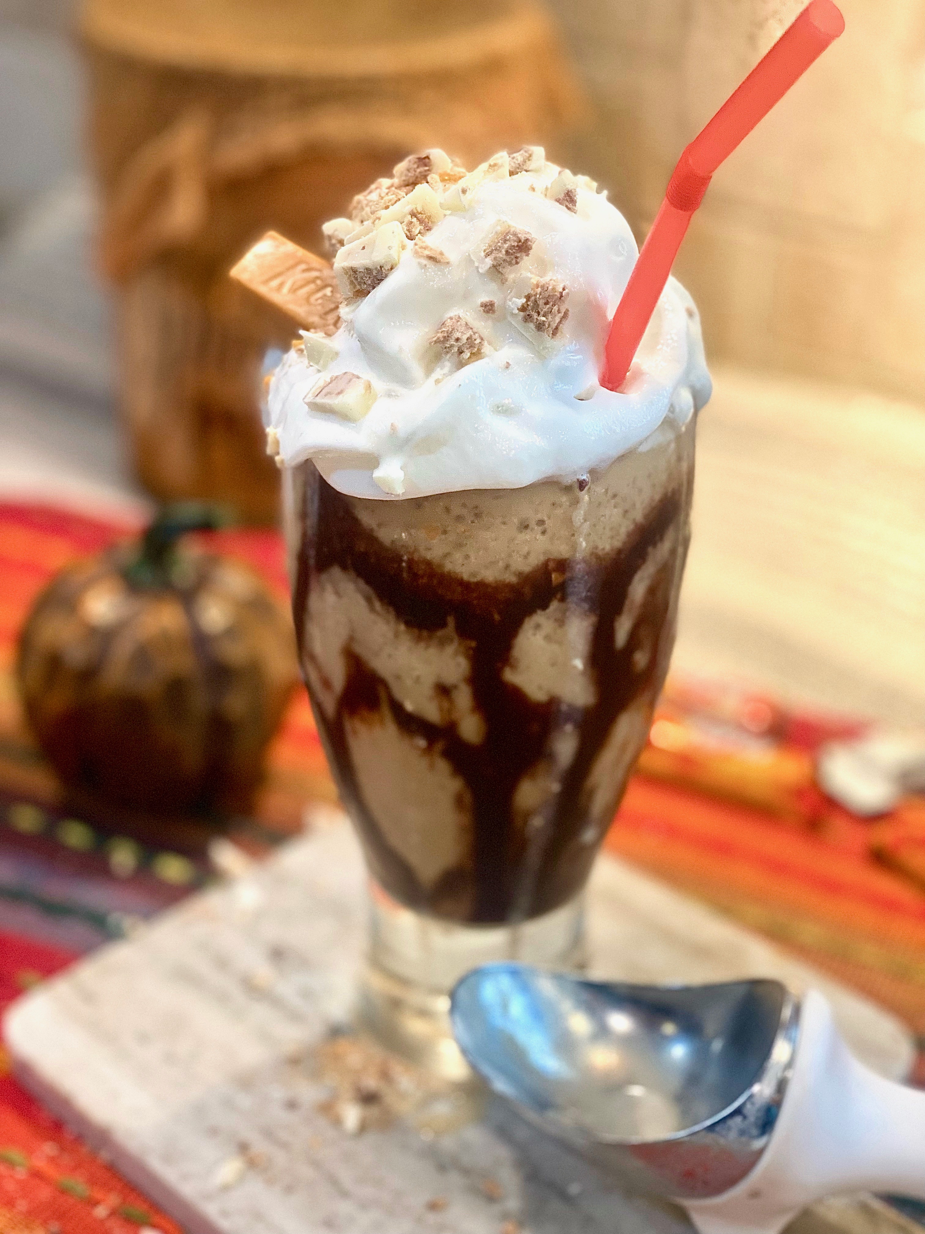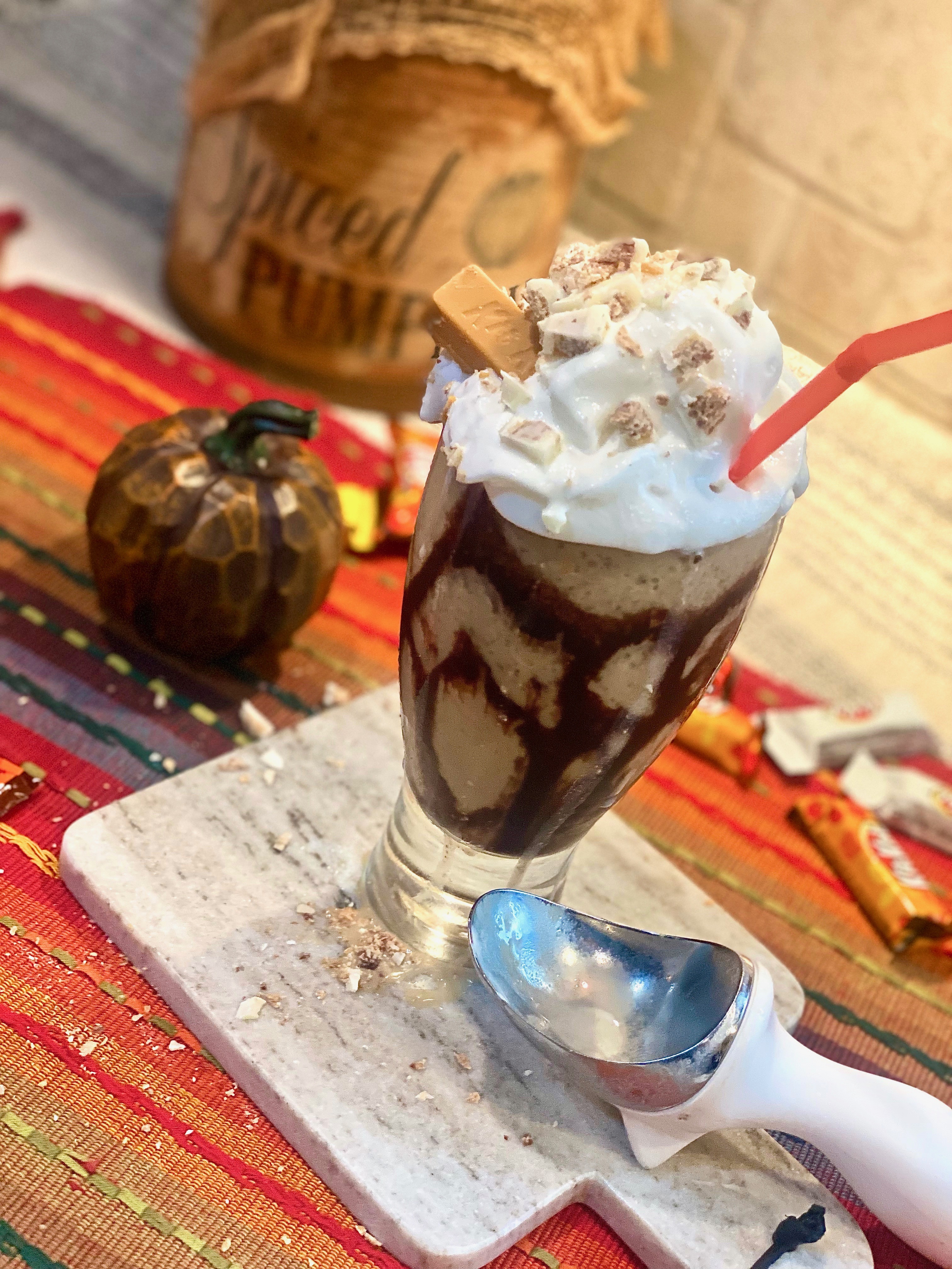 One of my favorite things to do in Autumn is to treat myself, especially when it comes to coffee, food, and all kinds of Fall themed beverages. I truly feel like one of the main reasons we get so excited and comforted by this season is because we are reunited with our most beloved seasonal treats, and even introduced to new ones as well! I know we all love to go to our local coffee shops or cafes to get our pumpkin spice lattes and salted caramel frappuccinos, but why not make them at home so that you have the creative freedom to make one of the fanciest Fall drinks you will ever sip on?! This frappuccino is the greatest thing to wake up with on a weekend morning when you’re planning to have the coziest, biggest brunch in bed while your comfort show plays on the television screen. This icy cold beverage is also great when you’re having friends over for an afternoon get together, or for a pick me up after a morning at the pumpkin patch. If you love coffee, candy, or milkshakes, you’ll love this crazy cool concoction.
