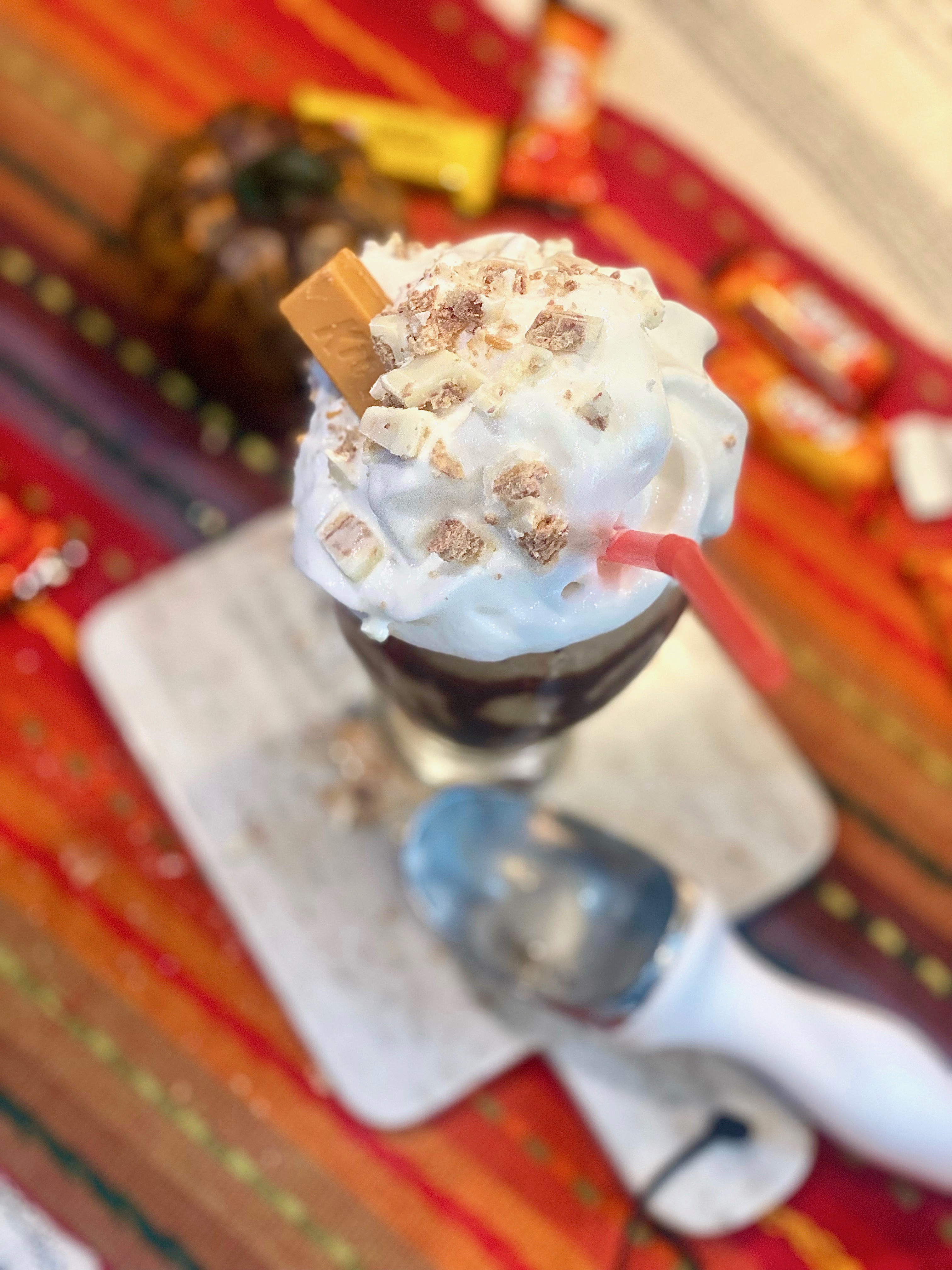 - Cut up the candy bars and toss them in the blender with the coffee, ice, and ice cream.