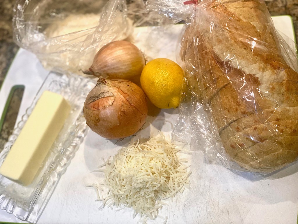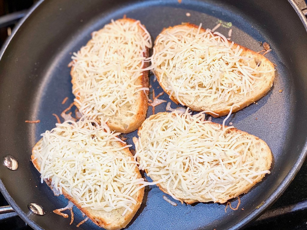 - Brush the oil mixture on the bread before toasting in a pan over medium-low heat on both sides. Then top with shredded Swiss cheese to use for dipping into the butter so that you can really get the full french onion soup experience. If you don’t have the palette for Swiss cheese you can also use provolone.