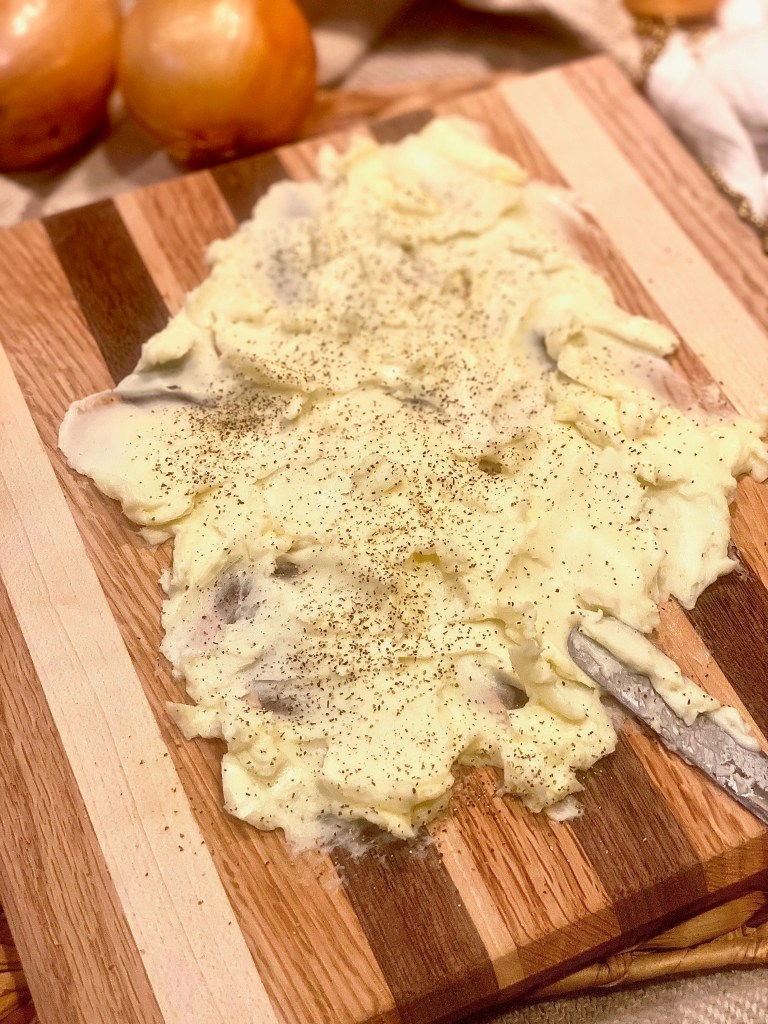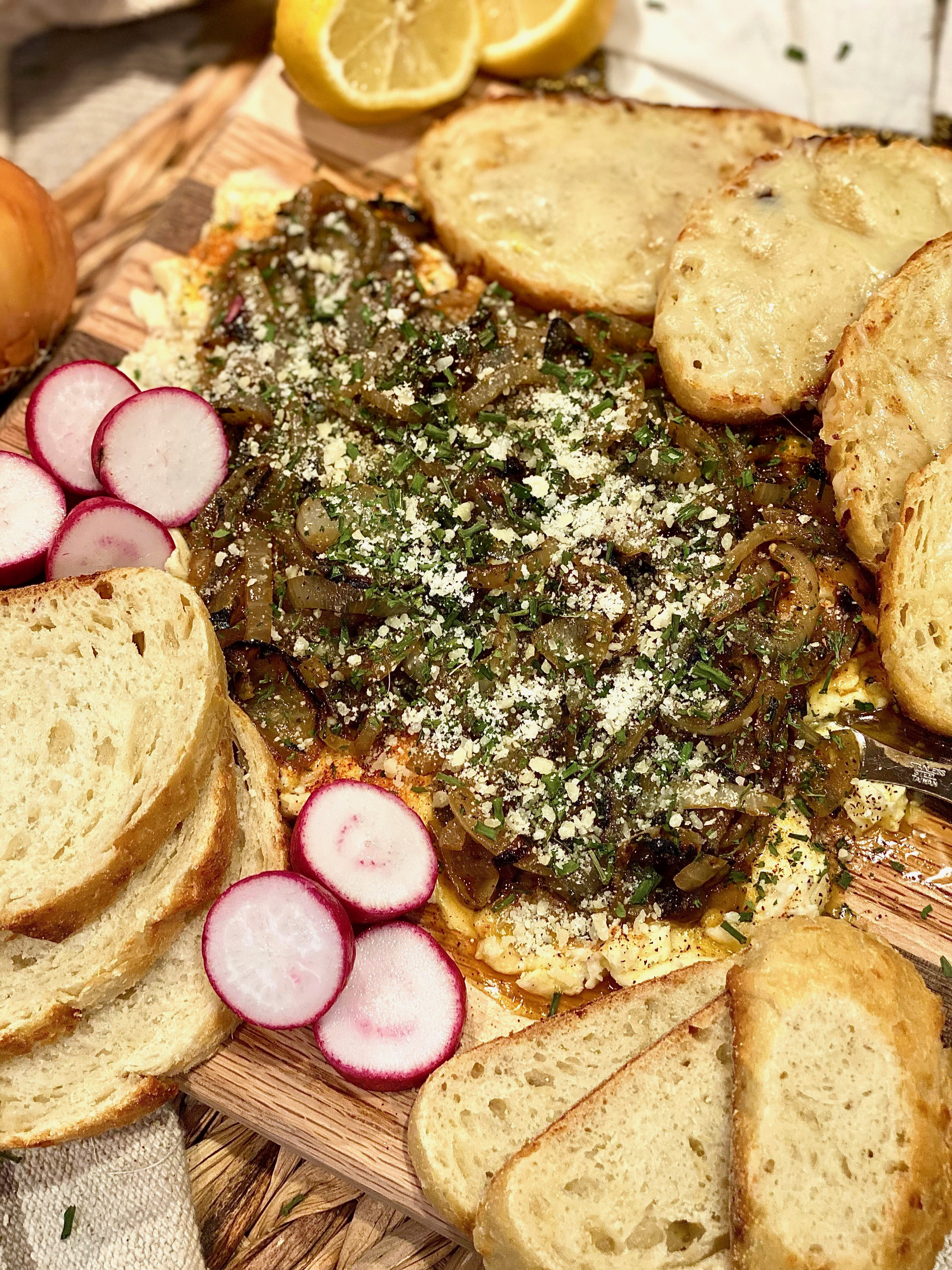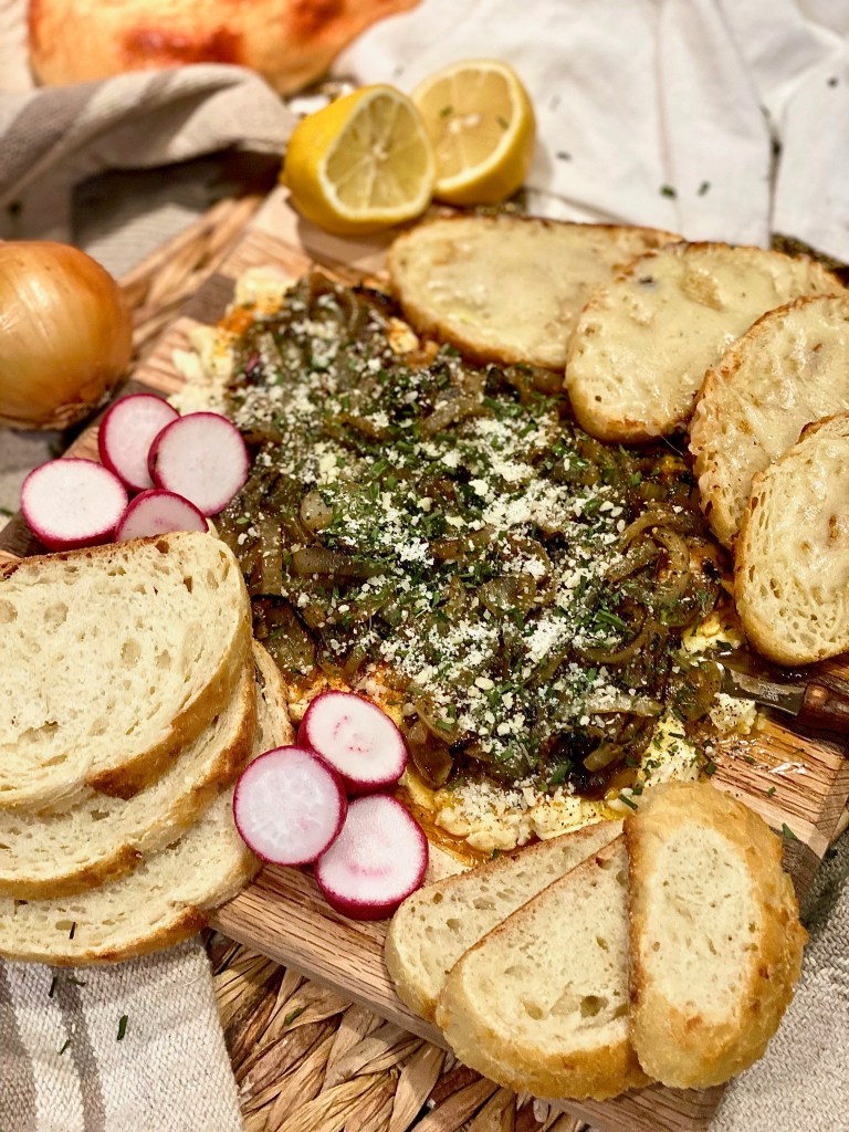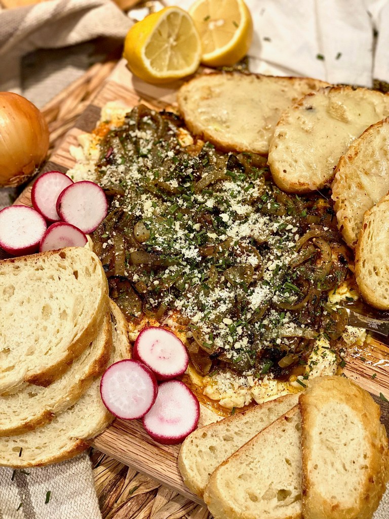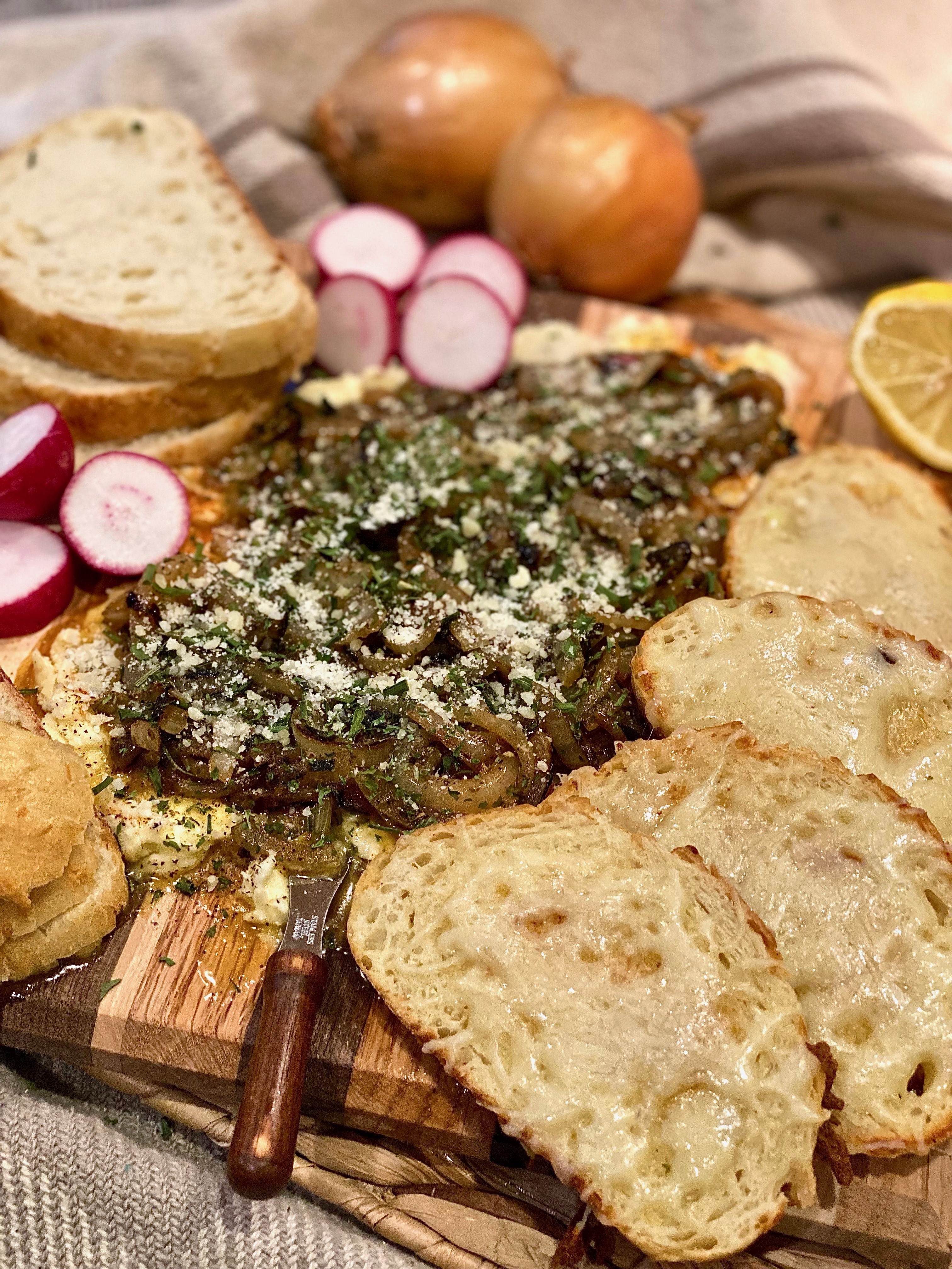 For the past few weeks butter boards have been absolutely taking over the internet and every social media app you could think of. Creators have been concocting them in every which way possible from sweet and salty, to hot and spicy, or super savory. If you’re not a bread and butter person you can also get really creative with these boards by using cream cheese, goat cheese, or even buttercream frosting. The toppings for each and every one of those can be endless, which is why board making is also such a fun experience! It’s a brand new way to try current combinations that you weren’t so sure about before. I truly feel like there’s nothing that won’t pair perfectly with butter when combined with the right flavors. I saw countless butter boards topped with the most wonderful spices, herbs, and sweeteners, but something I didn’t see was caramelized onions. There’s nothing better then the simple match up of onions and salted butter. You can put those two in any dish and it’ll make the meal ten times more luscious!