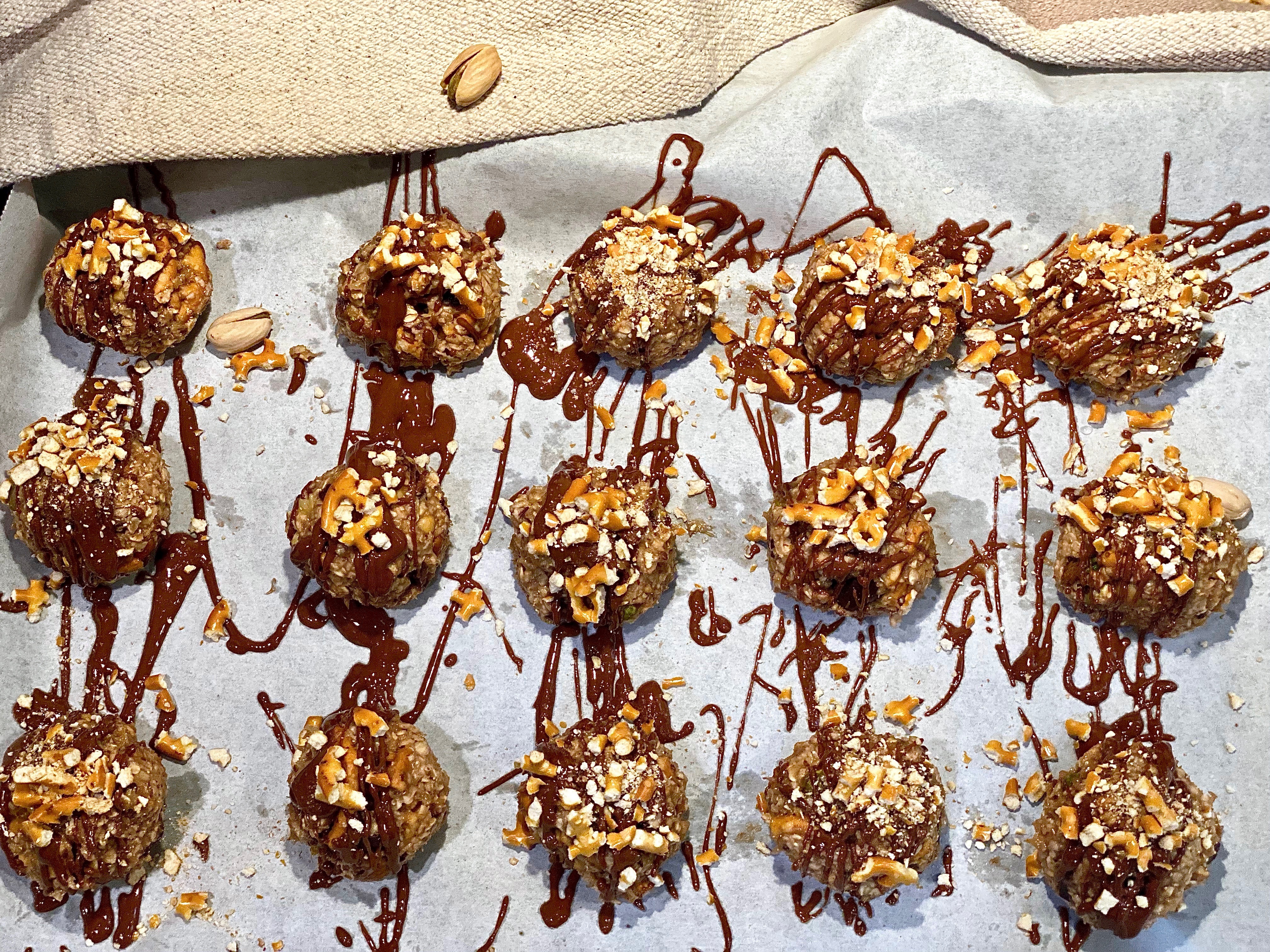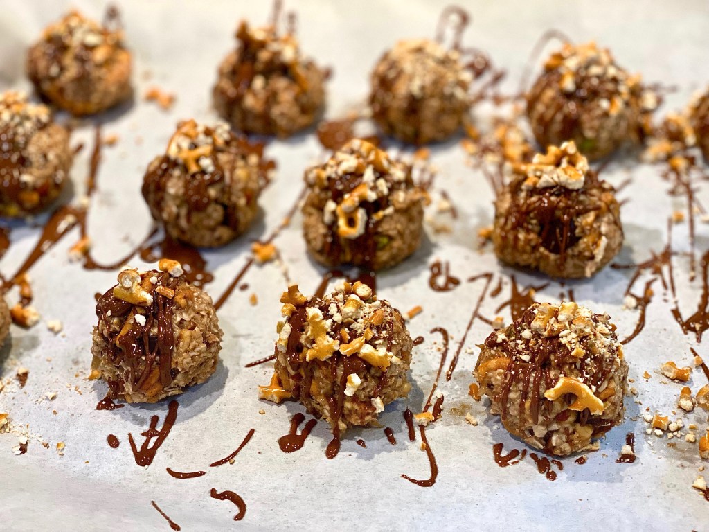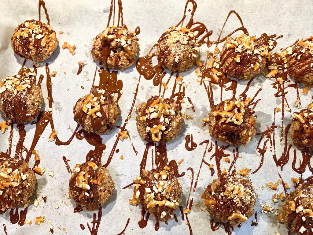 Melt a spoonful of peanut butter with a few chunks of dark chocolate and drizzle it over the top of each energy ball.