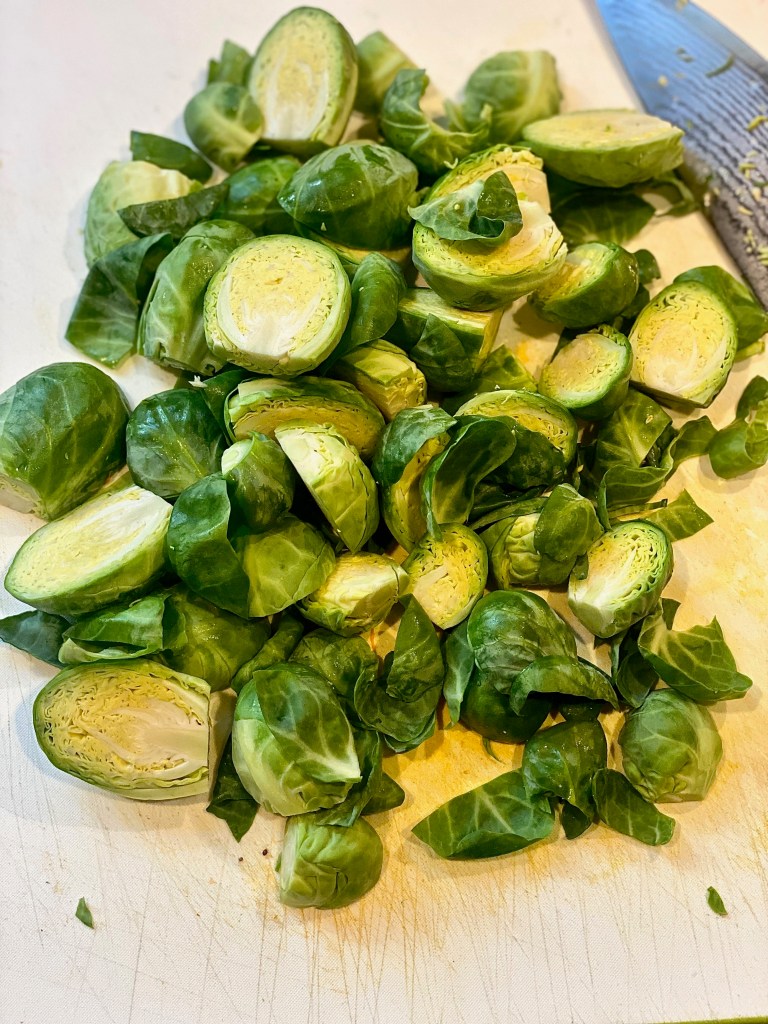 - Wash and cut your brussels sprouts in half after removing the end on each.