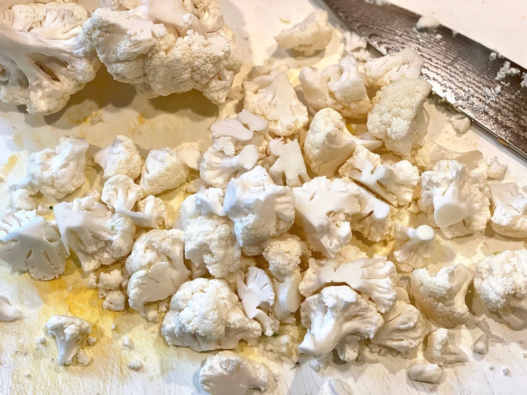- Chop your cauliflower into nice florets. If the cauliflower is big like mine was you can use half. If it’s small you can use the entire thing. It truly just depends on how many people you’re cooking for.