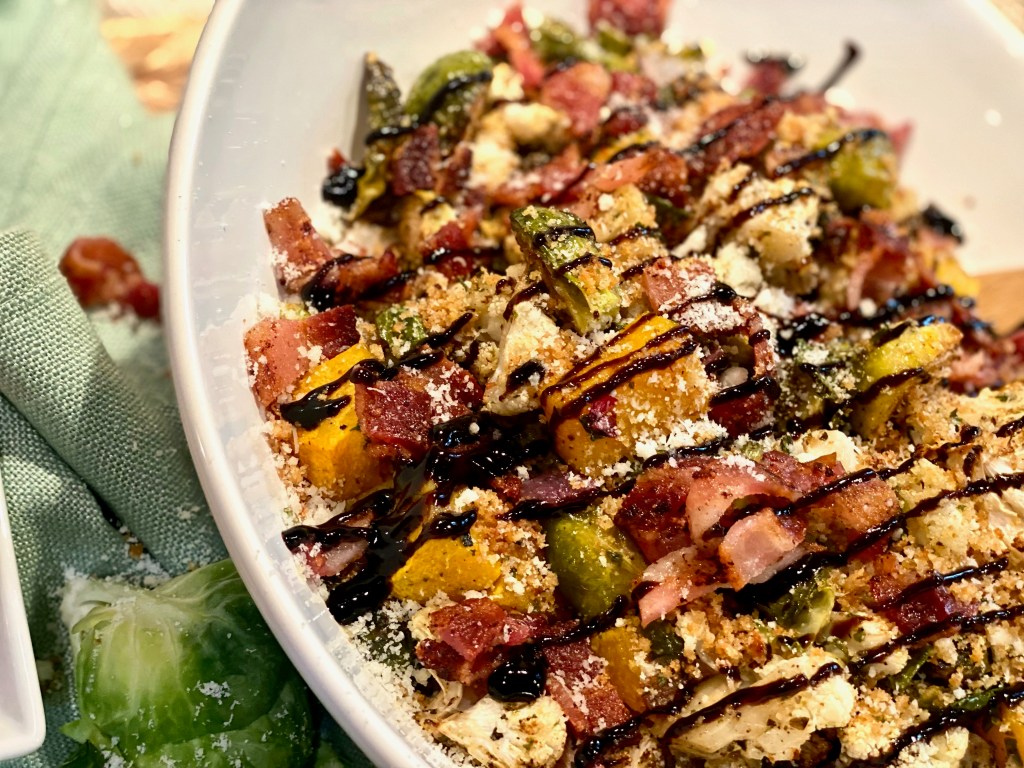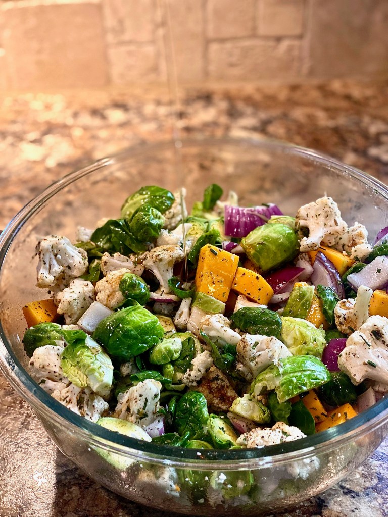 - In a large mixing bowl toss the vegetables in good olive oil and maple syrup with loads of delicious seasonings. You can use anywhere from two-four tablespoons of maple syrup depending how into maple you are!