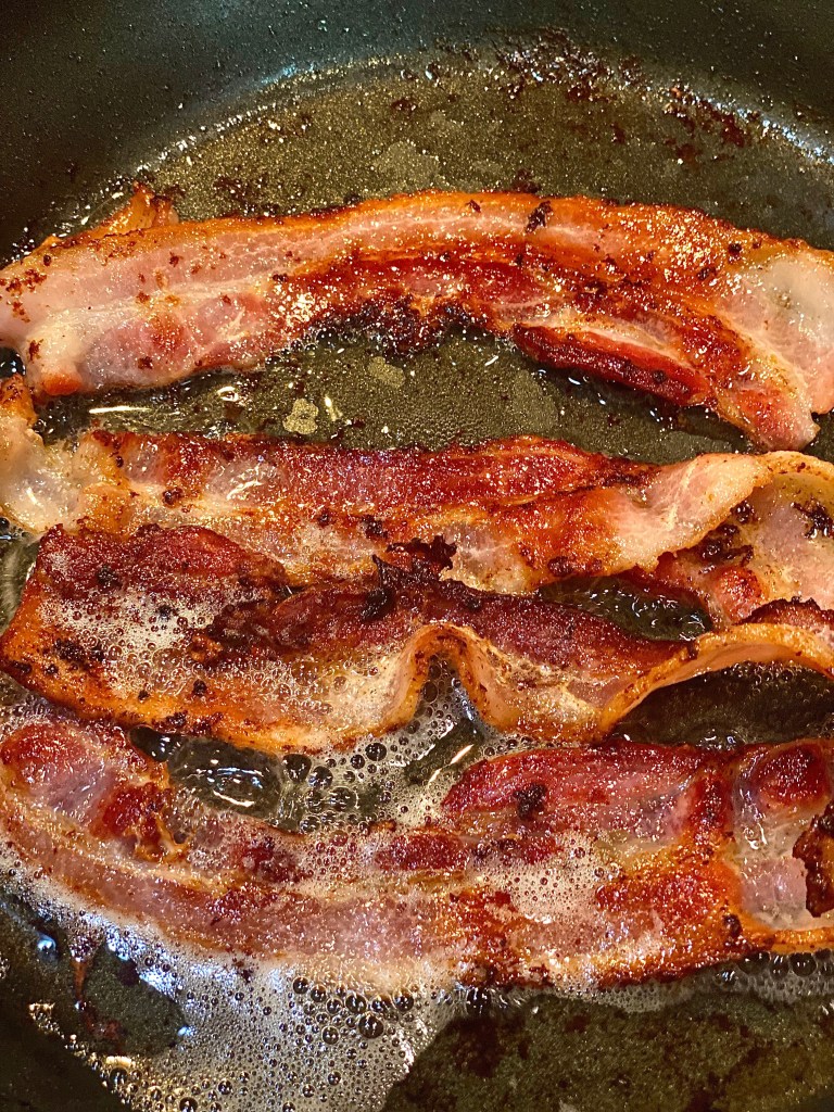 - While you wait patiently for the vegetables to roast in the oven you can fry up four pieces of bacon and toast the parmesan breadcrumbs.
