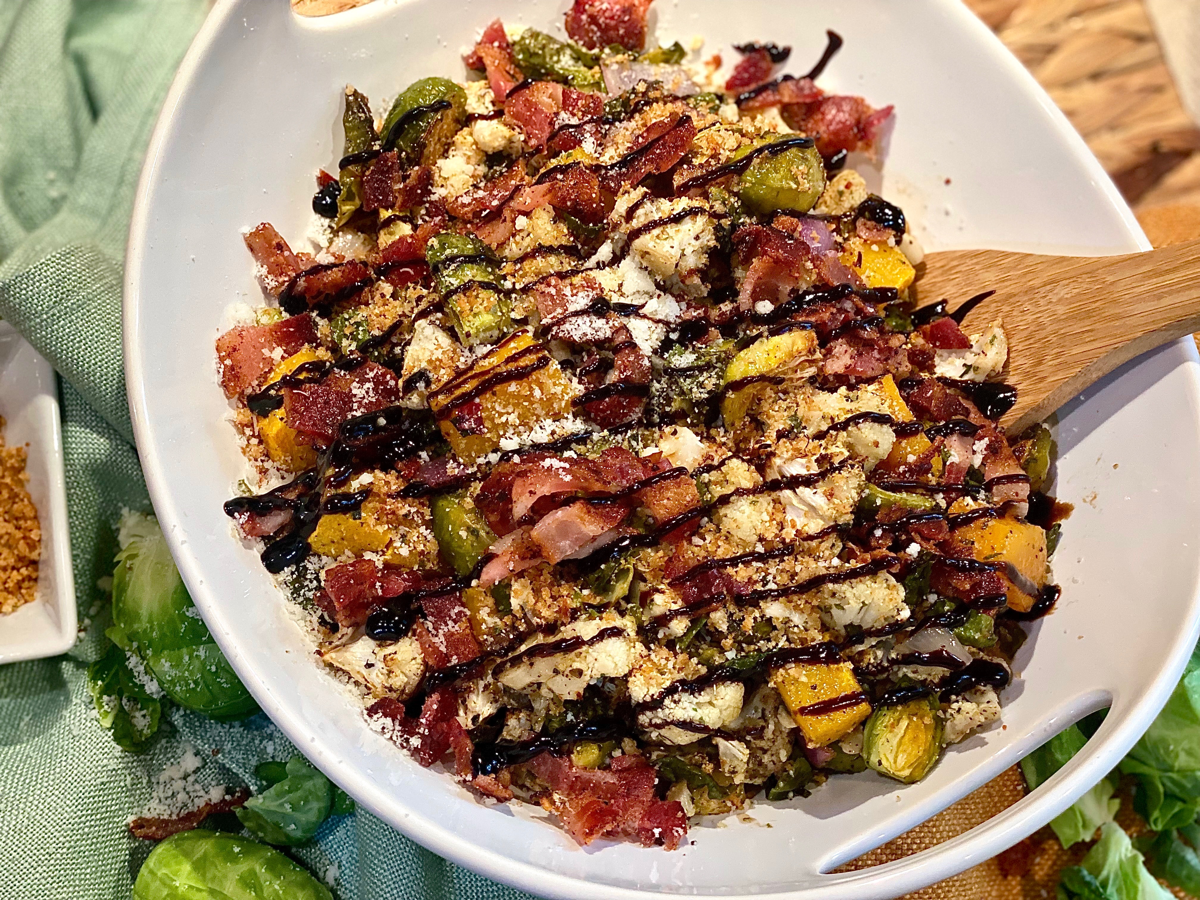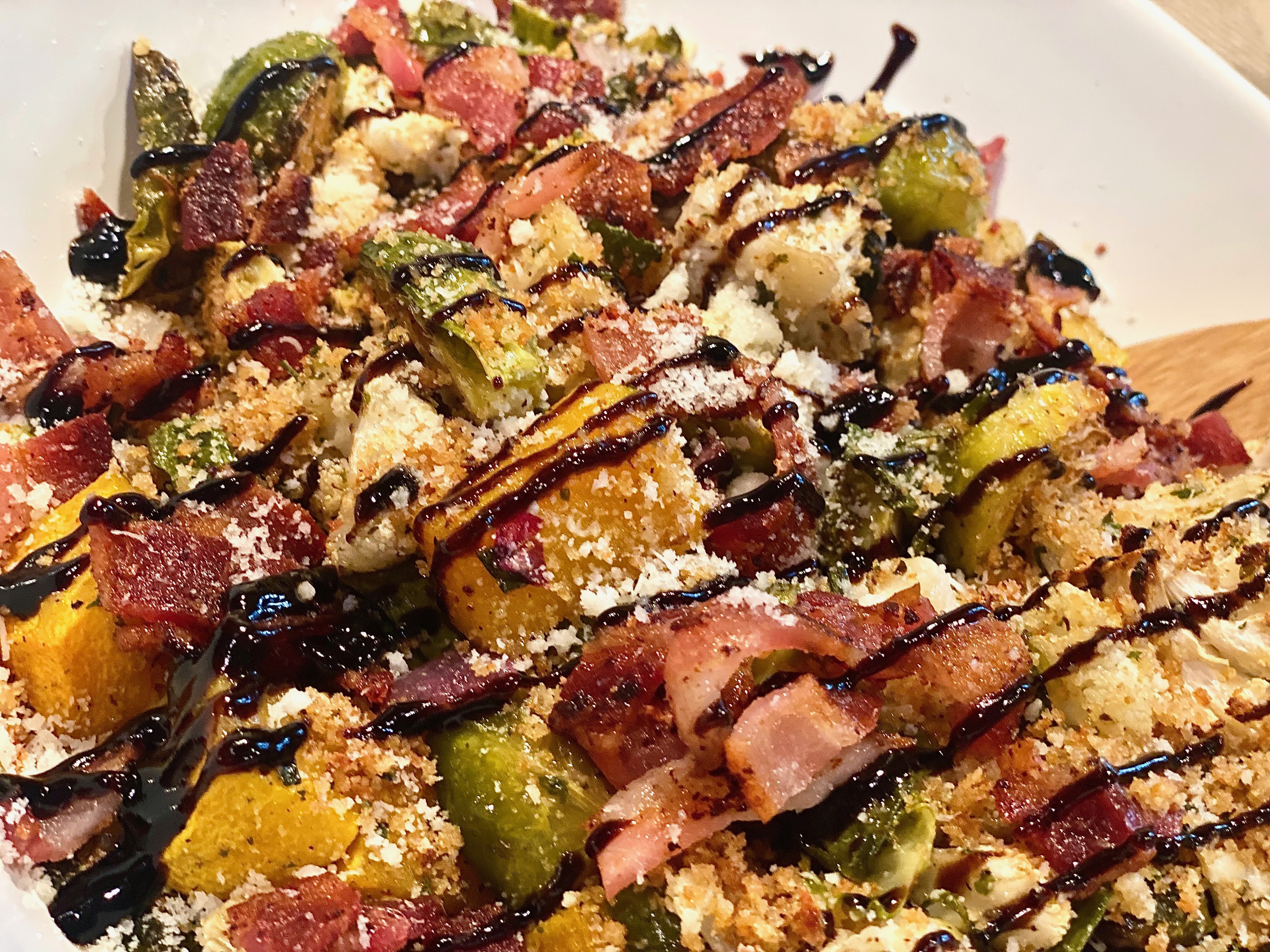 Serve in a big beautiful bowl, top with the toasted parmesan breadcrumbs, extra parmesan cheese, and a drizzle of balsamic glaze!