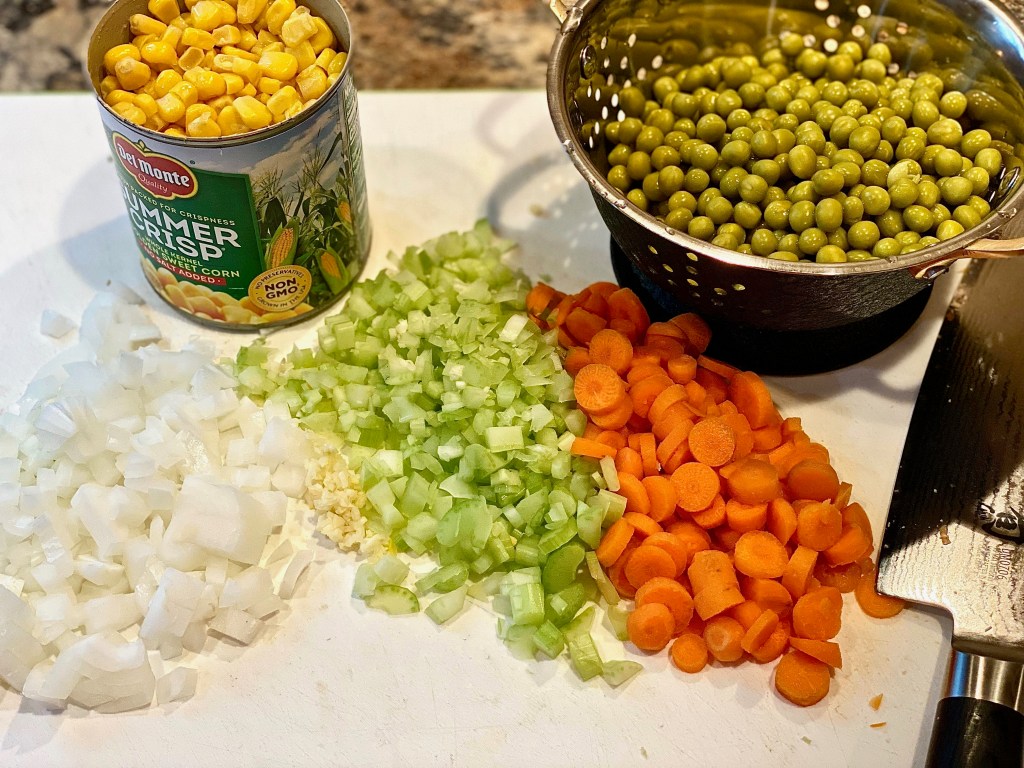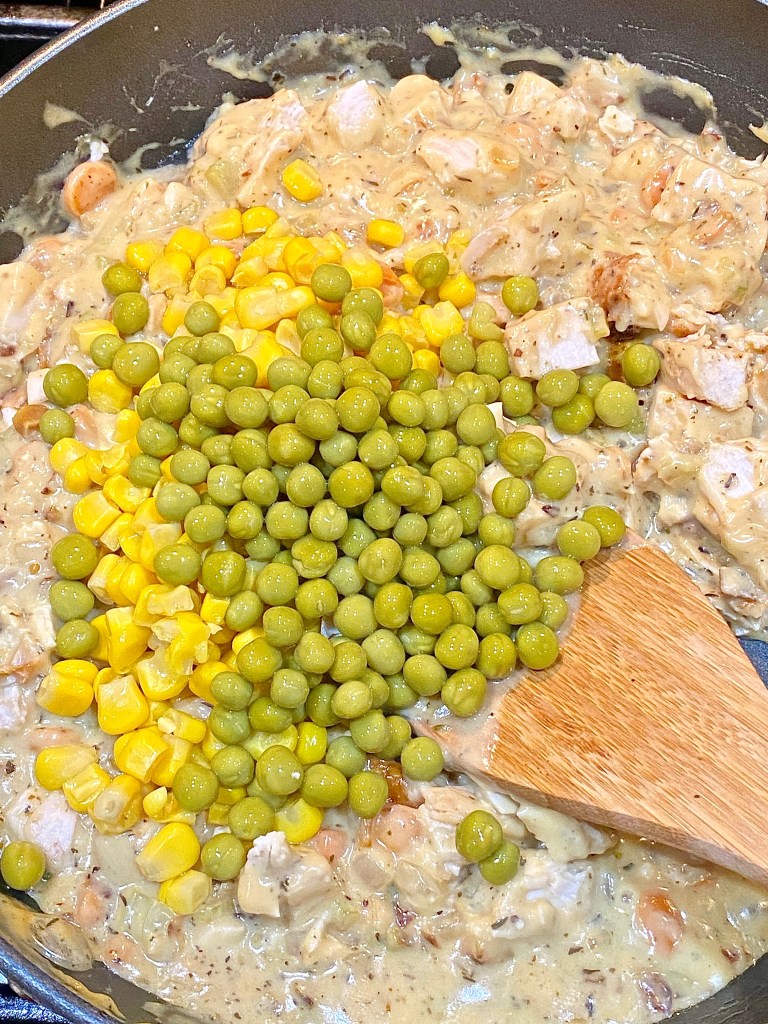 - Toss in all of the chicken, 1/2 can of corn and half can of peas as well. You don’t want to use too many for this recipe!