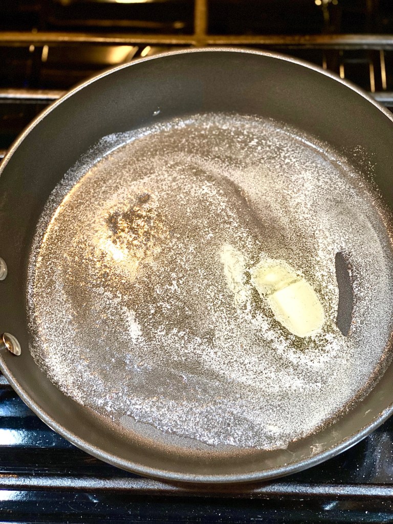 - In a saute pan, melt three tablespoons of butter with a drizzle of good olive oil over medium heat.