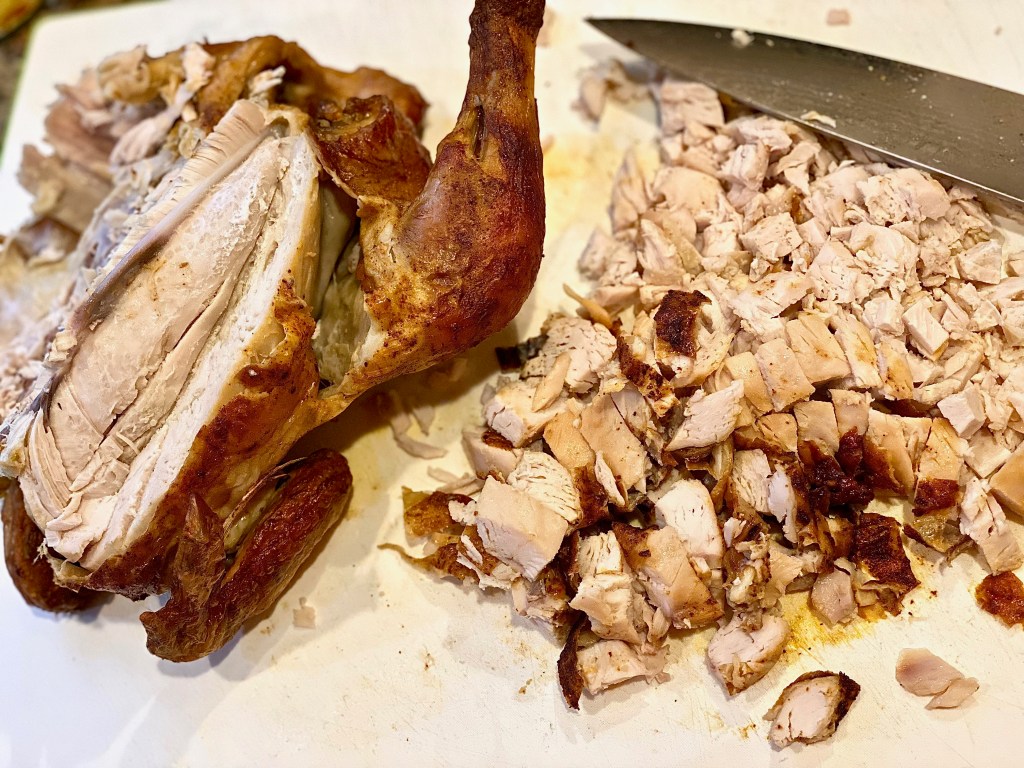 - While the vegetables caramelize for a few minutes I suggest cutting up the chicken breast for the filling from a rotisserie chicken. I left the skin on because I love the texture and flavor that it brings to a dish, but if you don’t, by all means leave it out.
