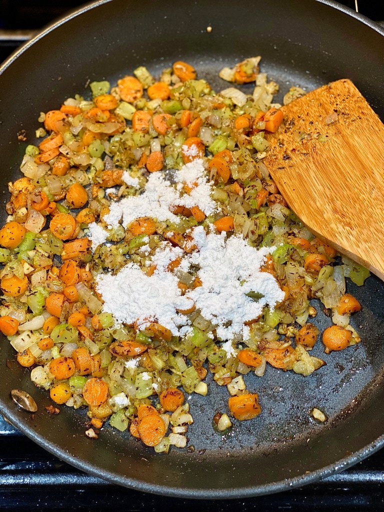 - After the veggies have become soft and started to caramelize, deglaze the pan with a 1/4 cup of sherry wine. Then whisk in two tablespoons of flour so that we can have a nice, thick sauce as an end result.