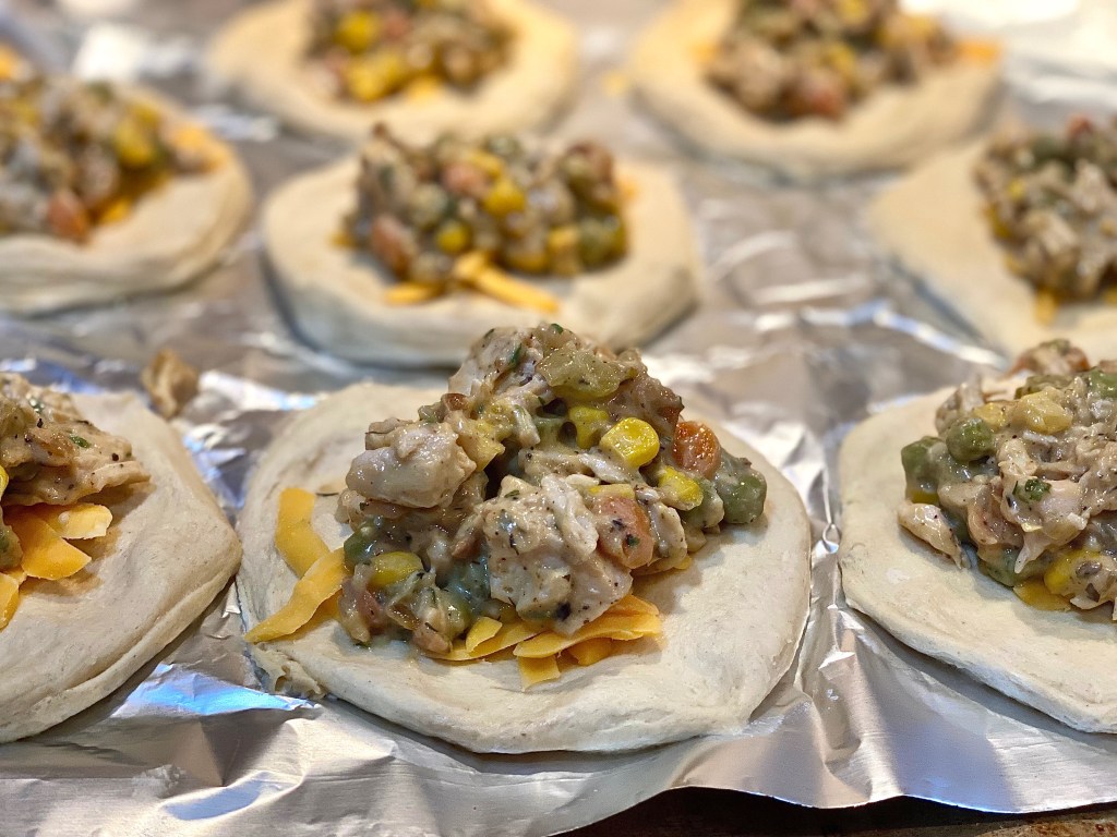- Drop a spoonful of filling on top of the cheese on each biscuit.