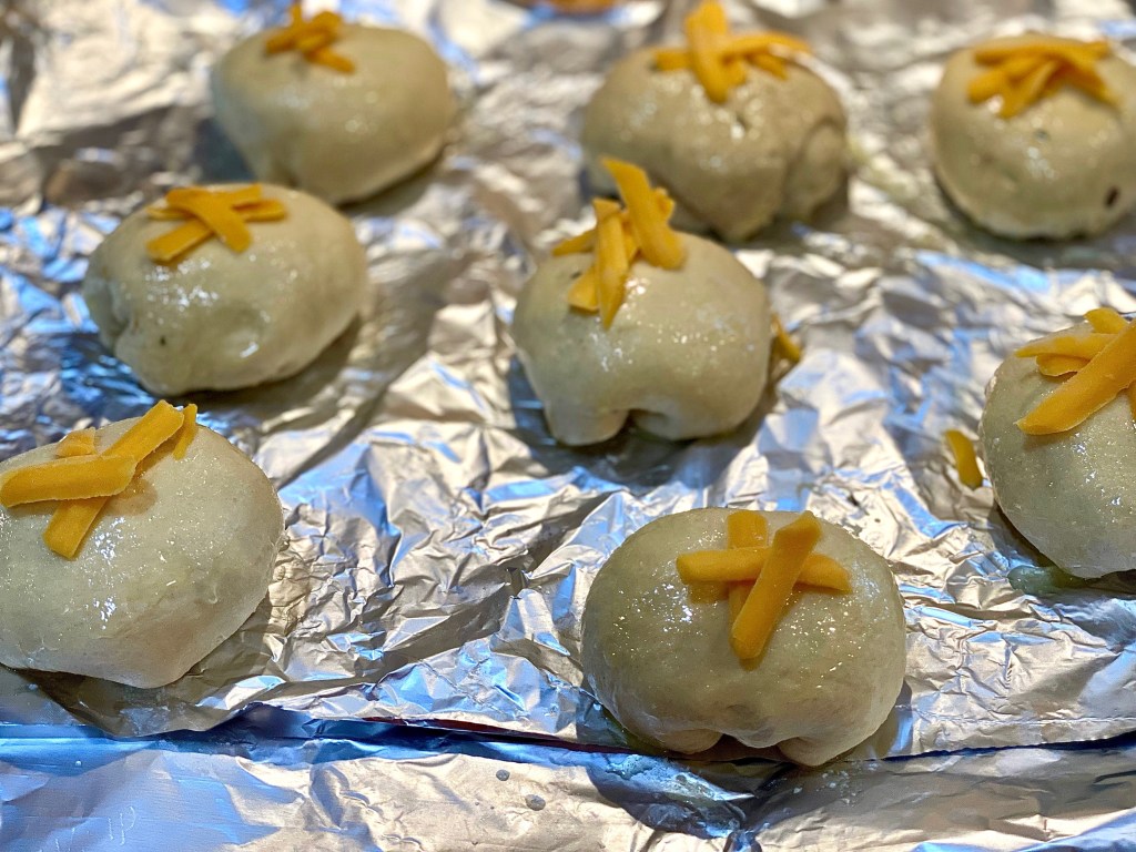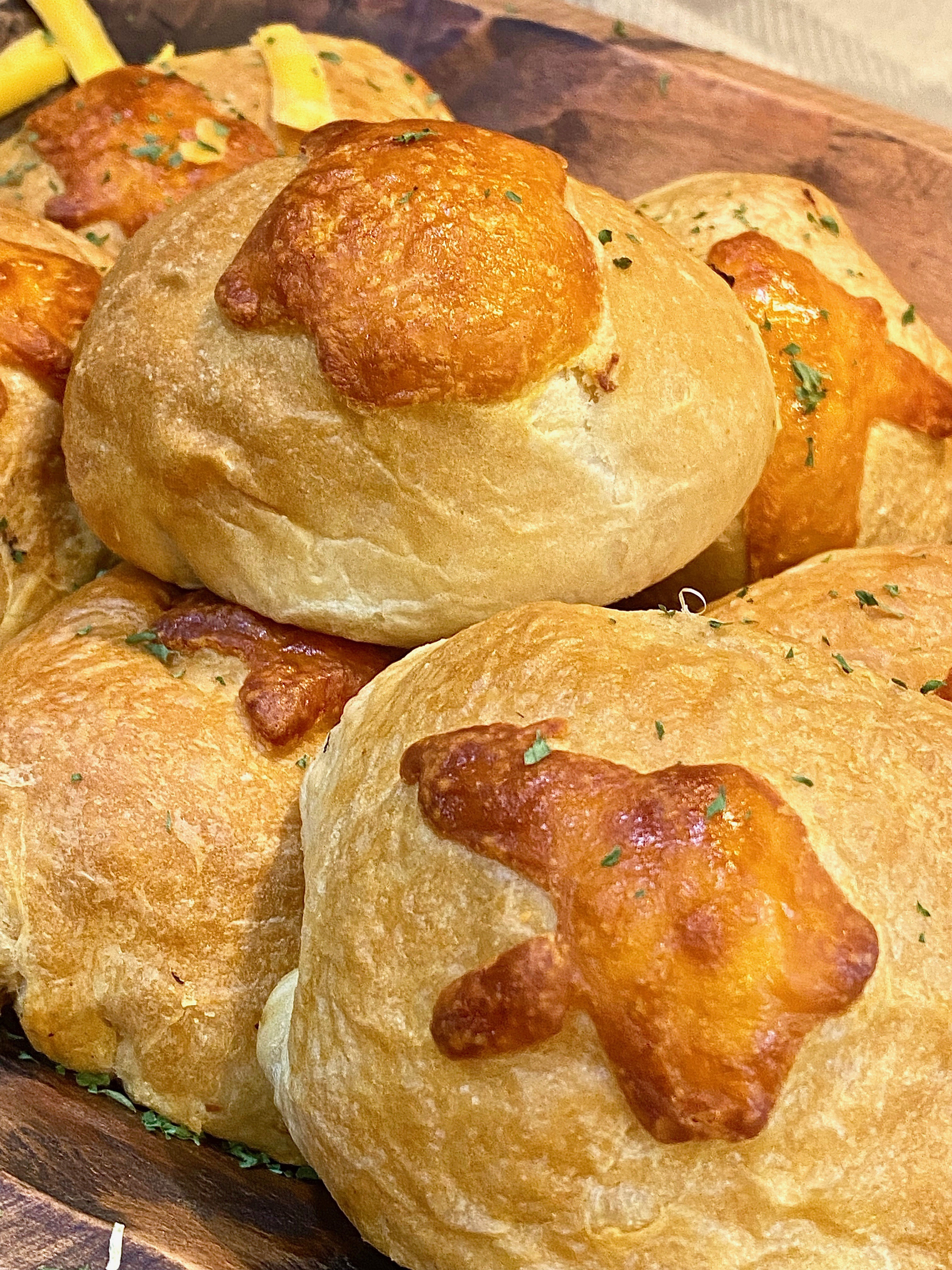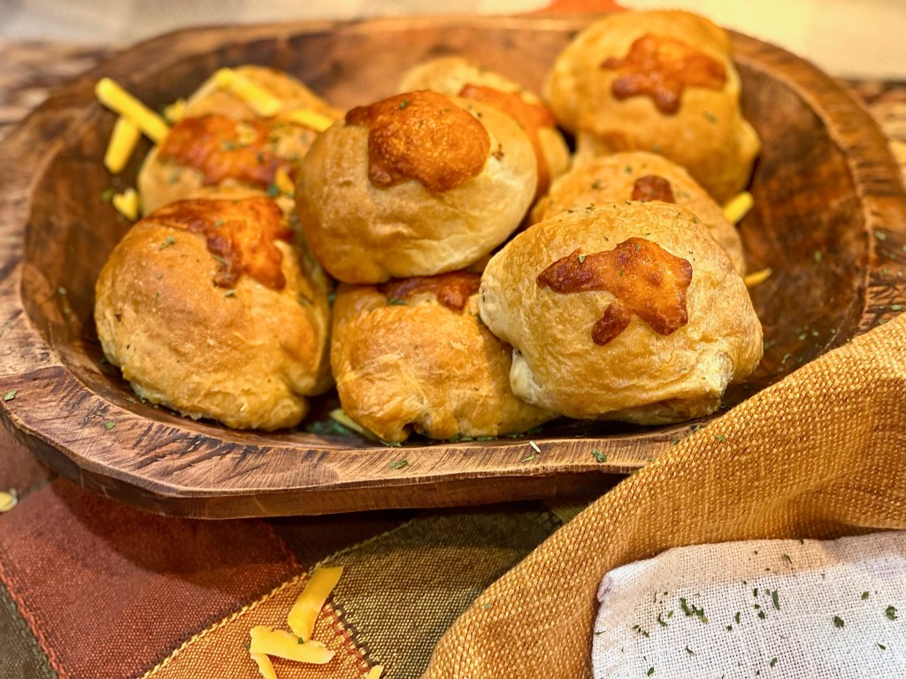 - Pull the sides over the cheese and chicken mixture so that you can form the biscuits into a ball. Then, brush each one with melted butter and garnish them all with cheddar cheese so that your loved ones know that there’s cheese inside and voila! You have your cheesy, chicken pot pie bomb ready for the oven!