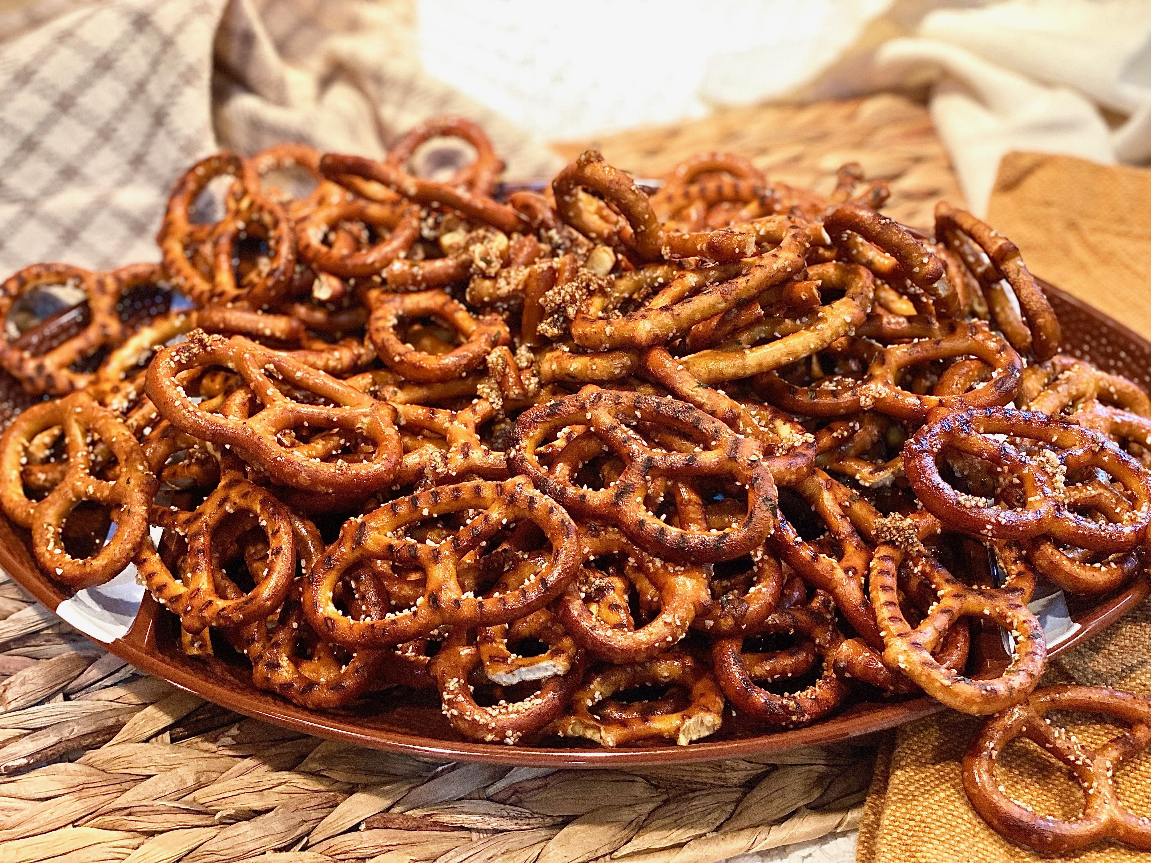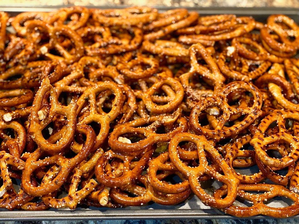 Let the mixture simmer on the stove for three minutes, then pour it all over the pretzels and mix until every single one is coated completely.
