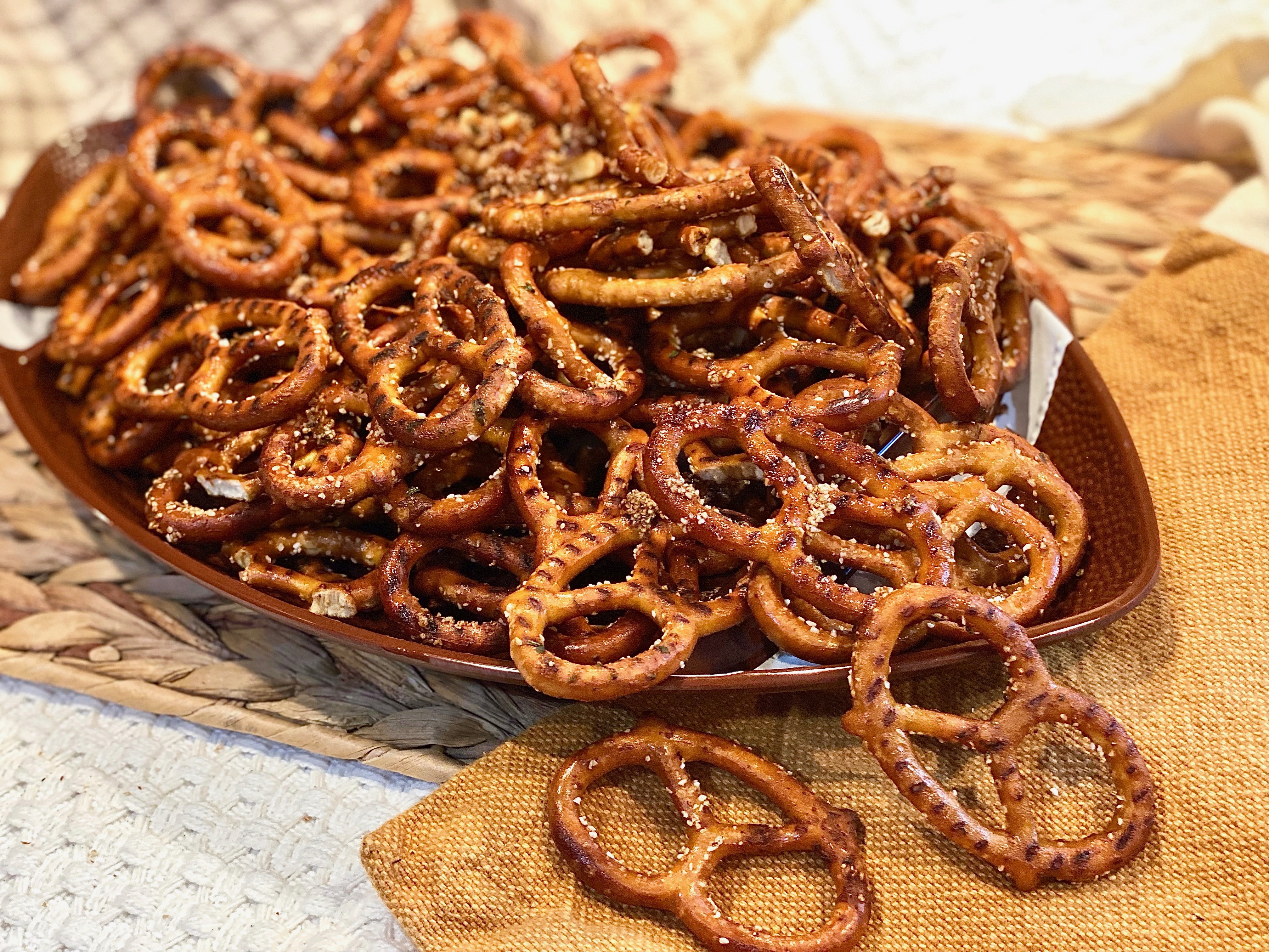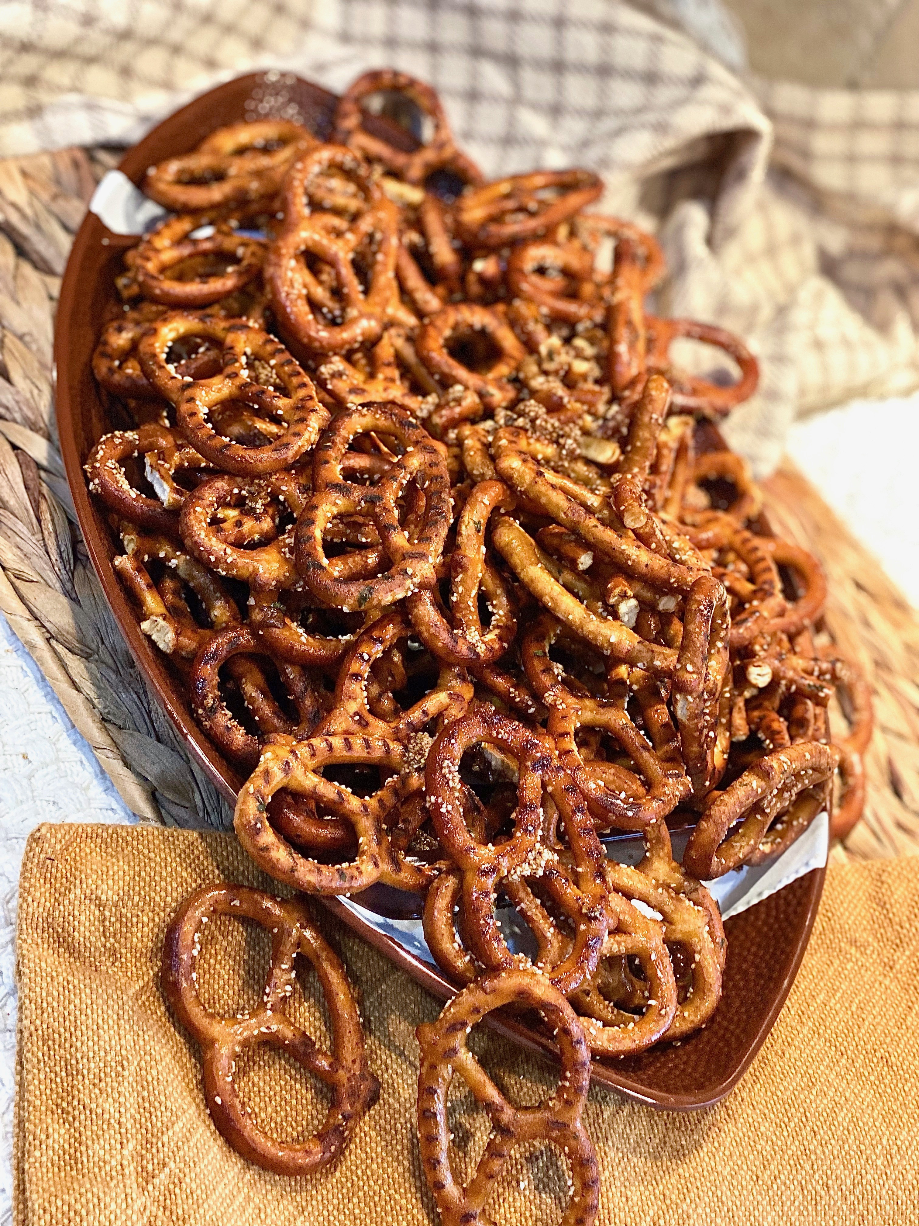Bake the coated pretzels at 350 for 10 minutes. While they are in the oven pick out a festive game day platter or bowl to serve them on!