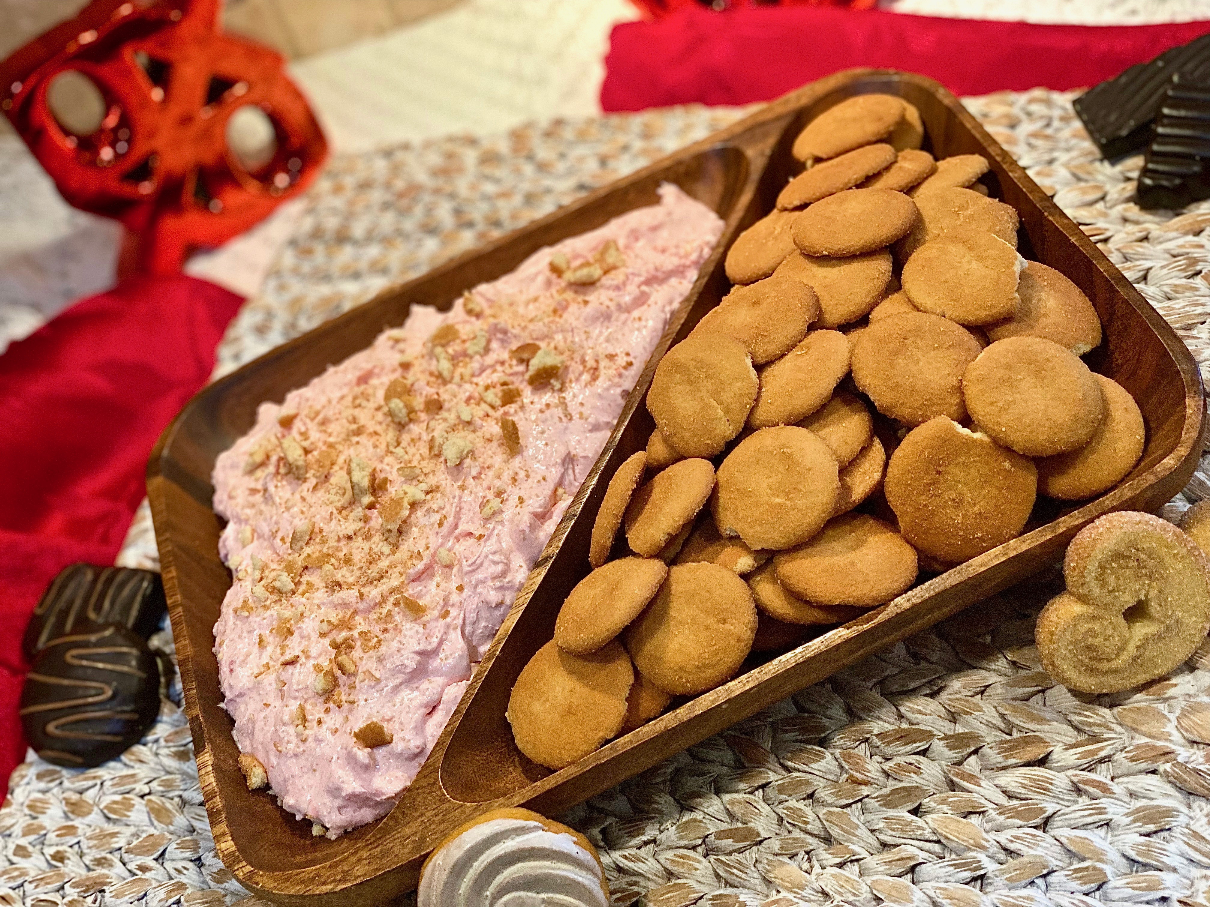 You can serve this thick and creamy dessert dip with vanilla wafers. Animal crackers would be perfect as well.