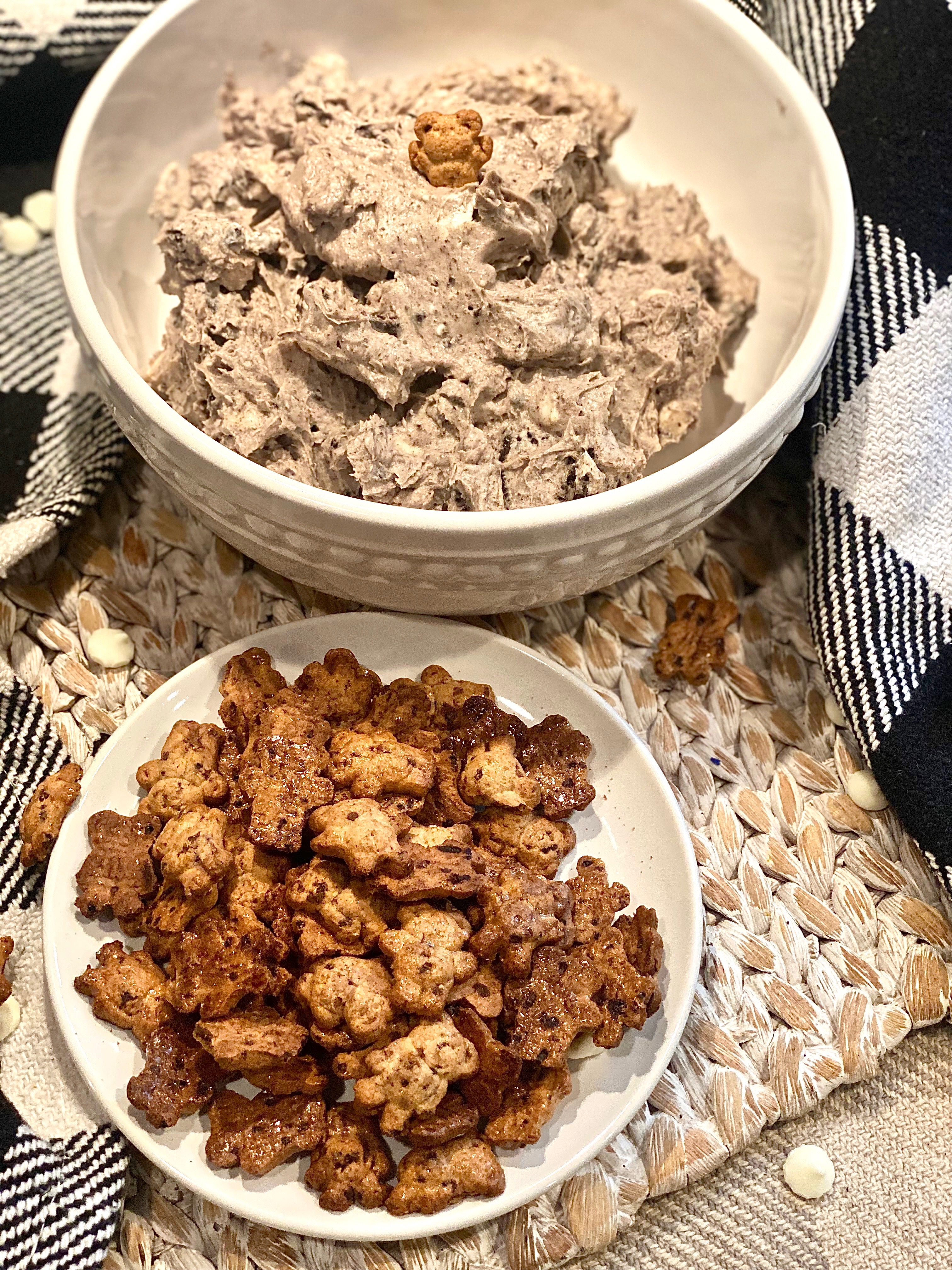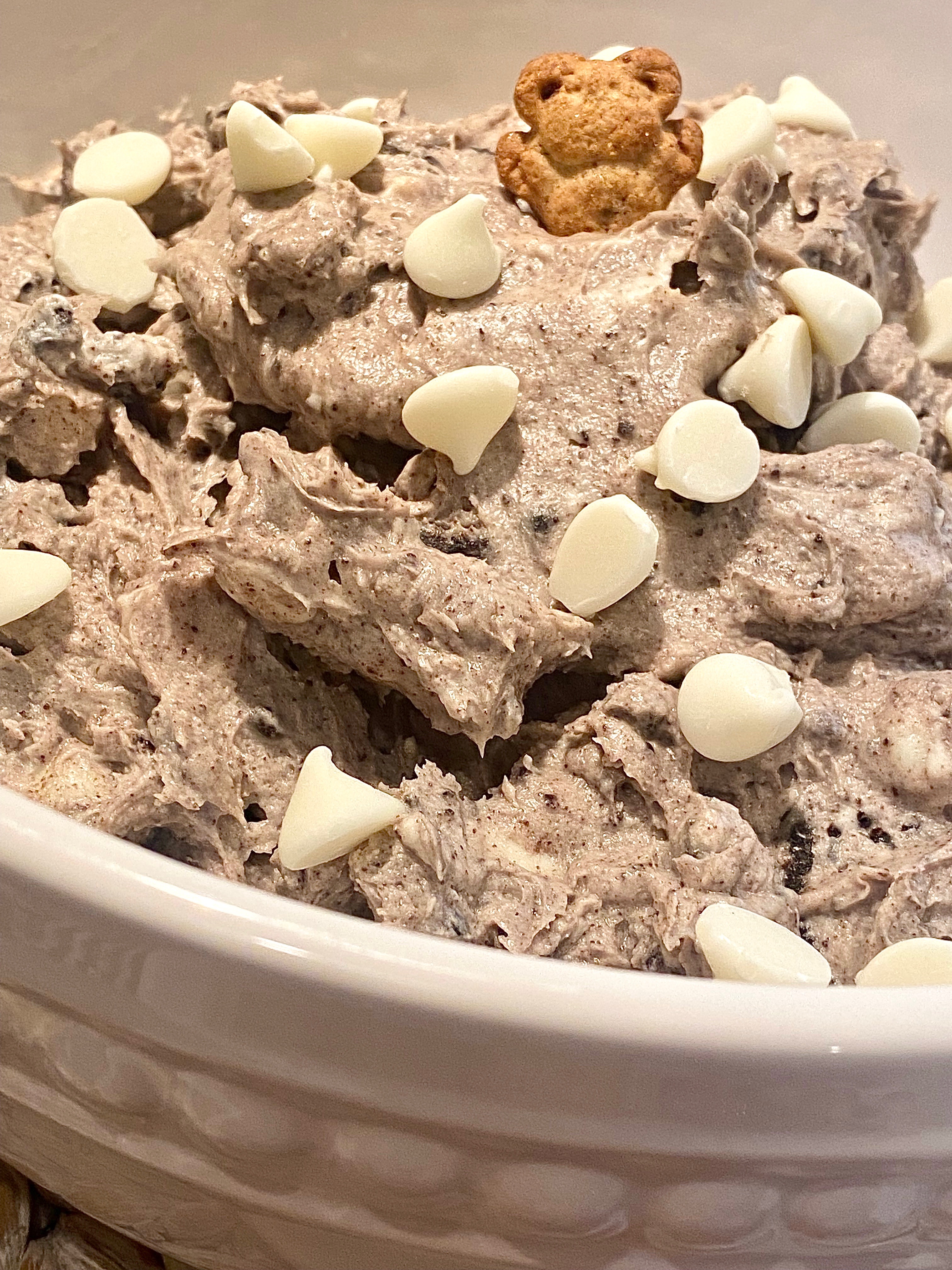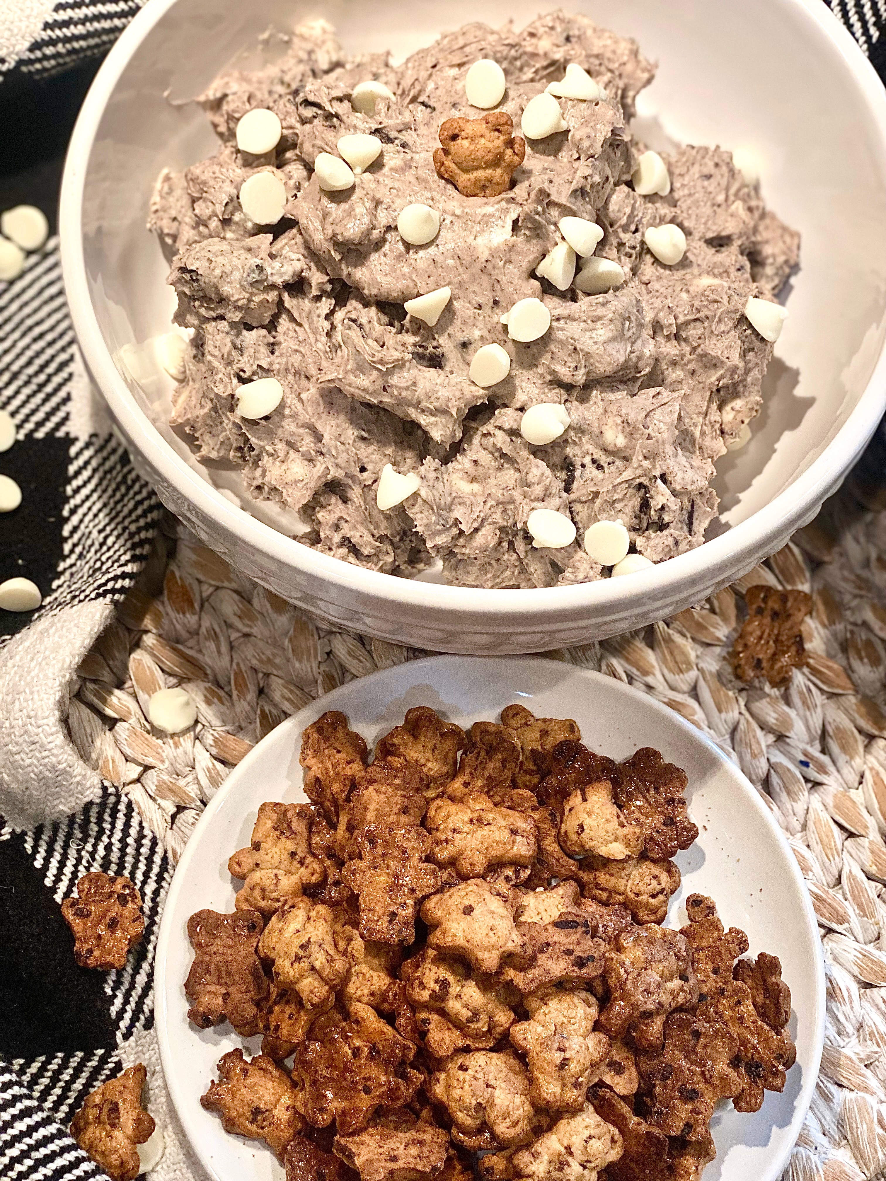 - I served chocolate chip Teddy Grahams with this cookies and cream dip because I love that “brookie” flavor which is exactly what you get when using the bears to dip! If this dip is enough cookie for your palate on it’s own you can use pretzels for pairing, and if you’re longing for an even bigger cookie explosion in your mouth you can use actual chocolate chip cookies, or even Oreos.