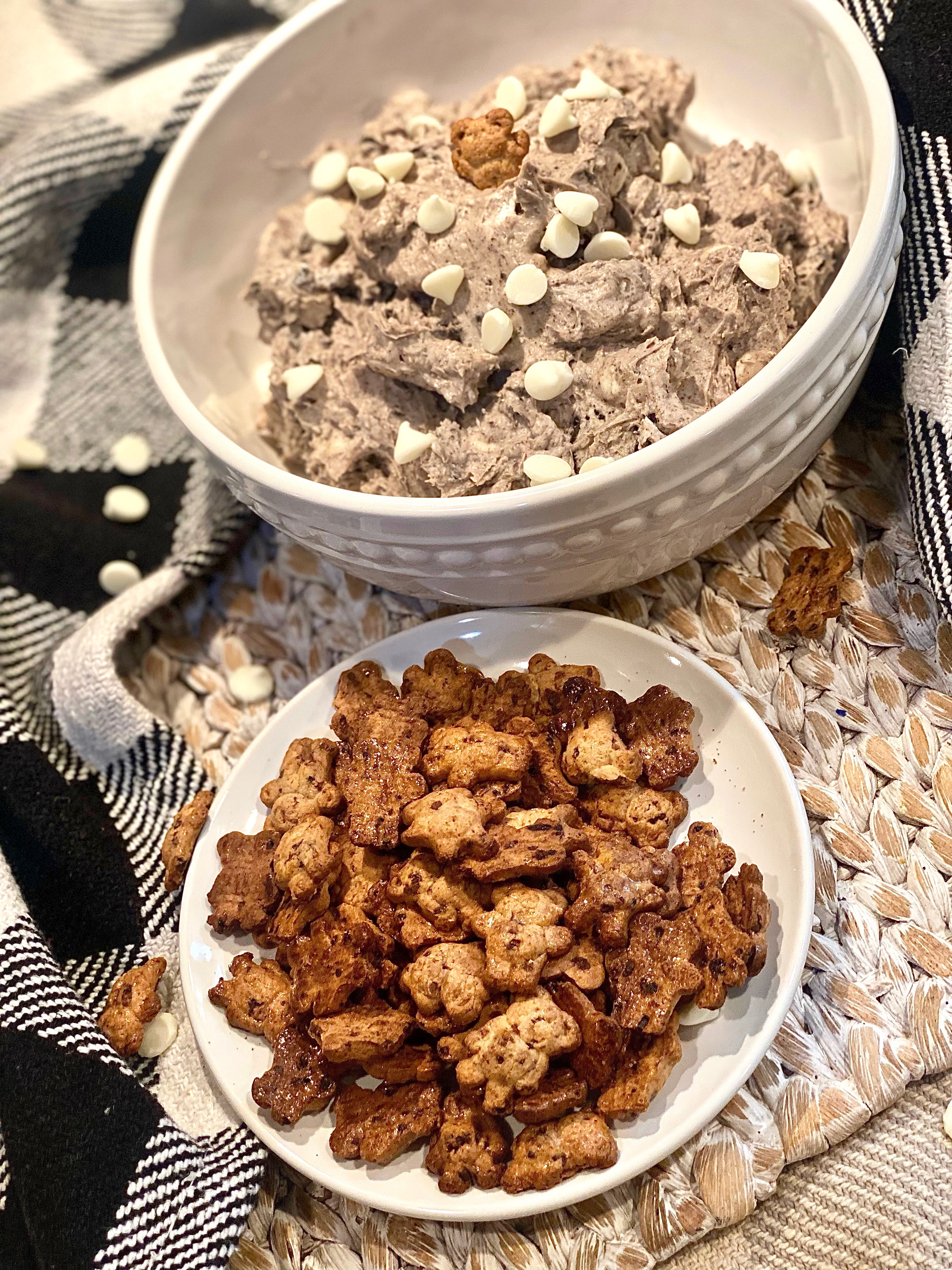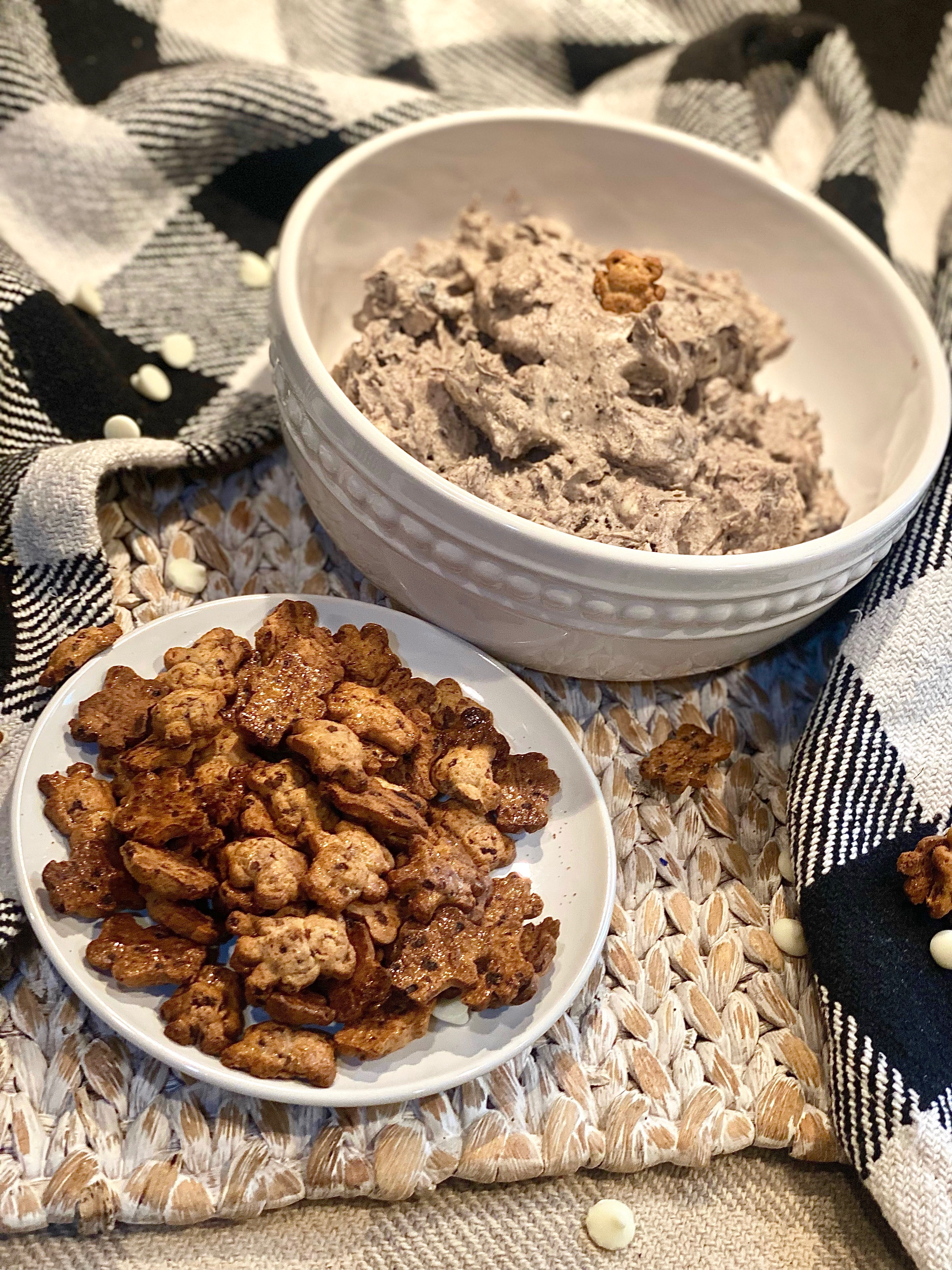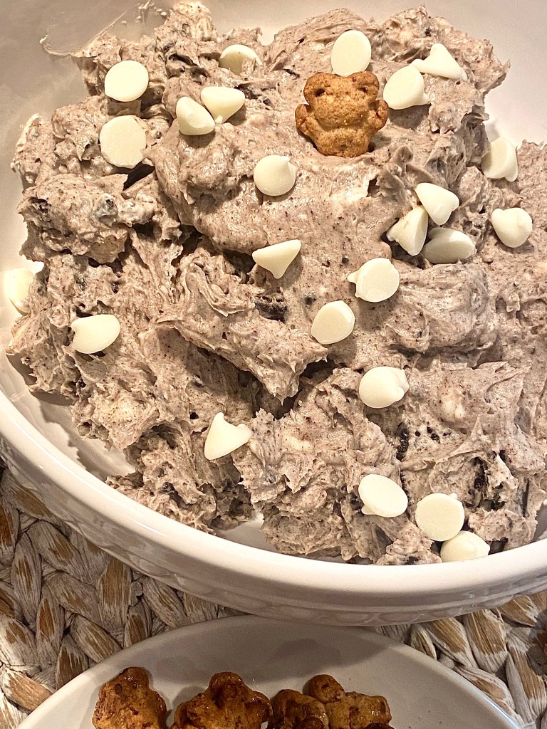 - I served chocolate chip Teddy Grahams with this cookies and cream dip because I love that “brookie” flavor which is exactly what you get when using the bears to dip! If this dip is enough cookie for your palate on it’s own you can use pretzels for pairing, and if you’re longing for an even bigger cookie explosion in your mouth you can use actual chocolate chip cookies, or even Oreos.