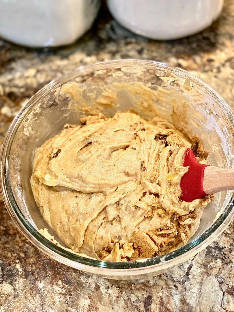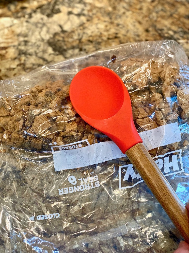 - Crush a sleeve of peanut butter pie Oreo’s in a zip lock bag.