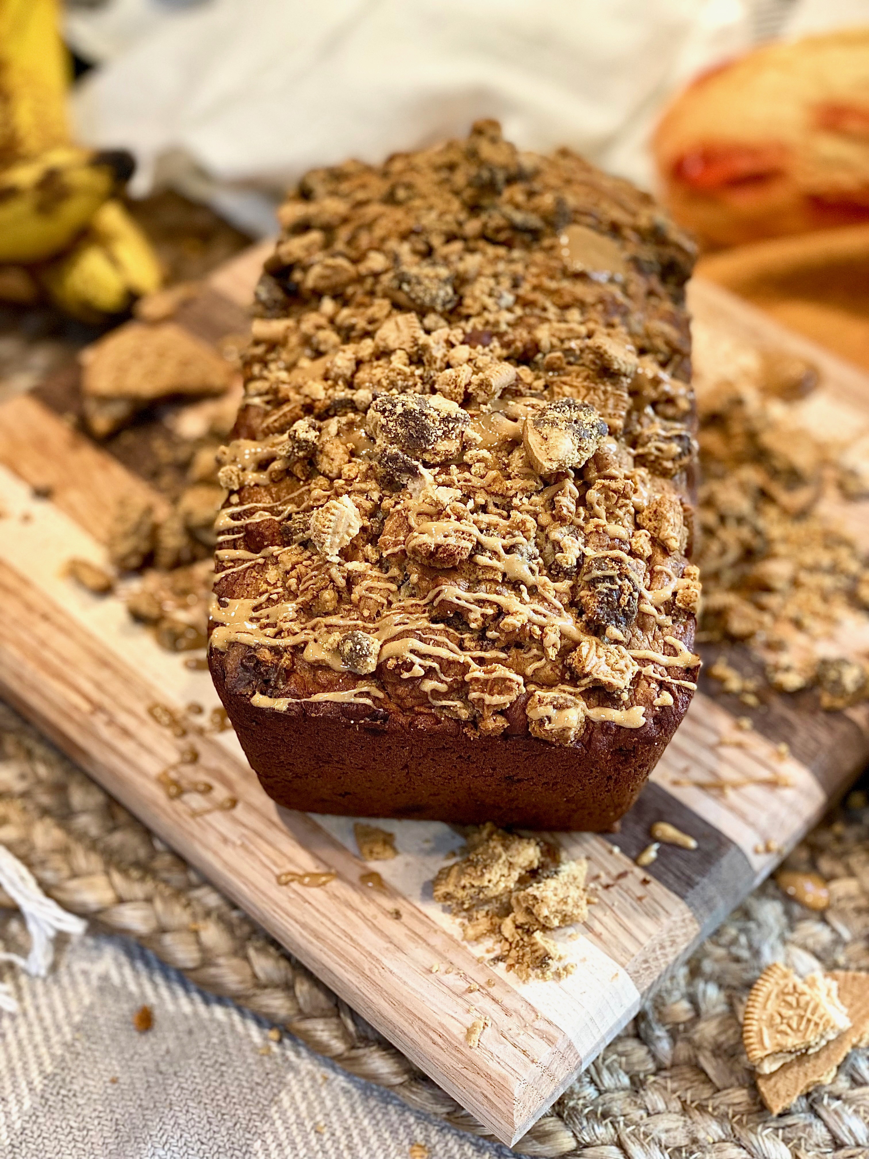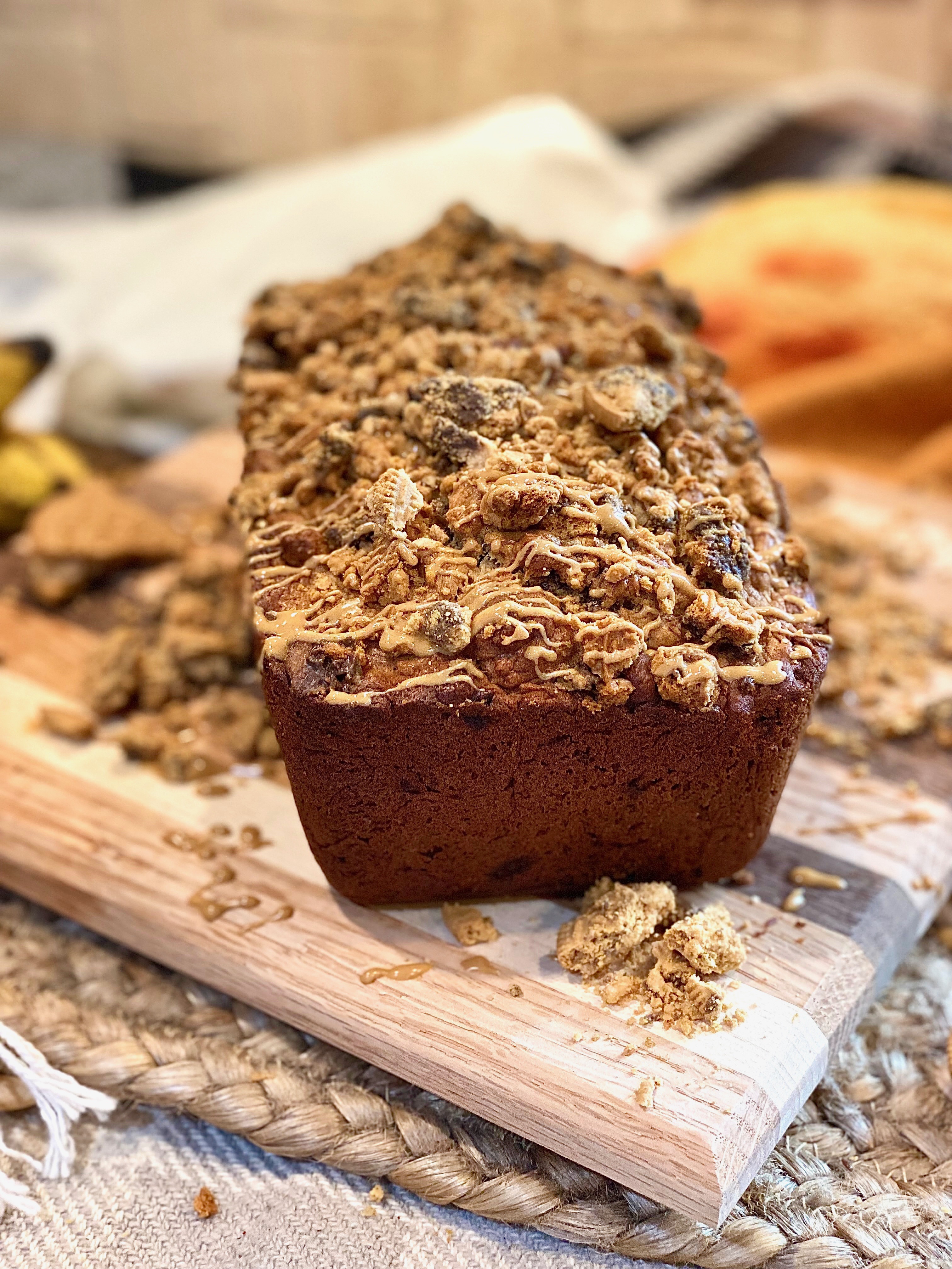 - Finish the beautiful presentation off by drizzling melted peanut butter and sprinkling the last of the crumbs all around the bread.
