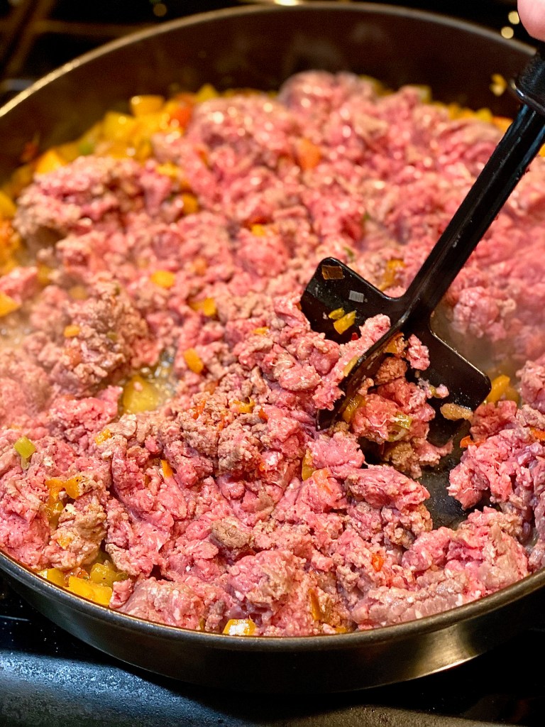 - In a large frying pan begin to caramelize an orange and yellow bell pepper, green onions, two heads of garlic, and a whole de-seeded tomato in three tablespoons of olive oil over medium high heat. Saute for ten minutes before adding in the ground beef.
